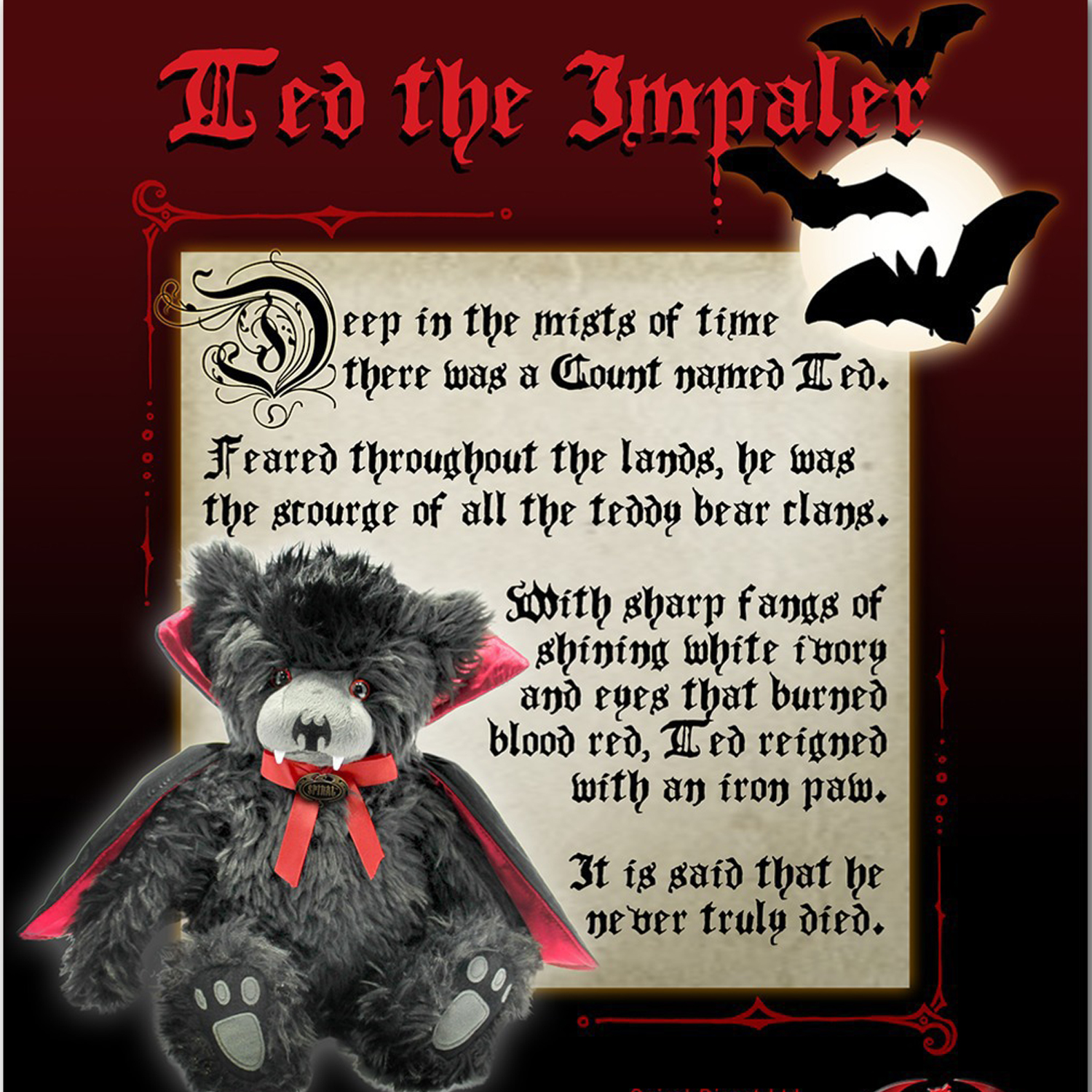 Cuddle up in your coffin with this cute teddy bear and 'Count' your blessings each morning when you wake up to see his fanged face and stitched bat nose.