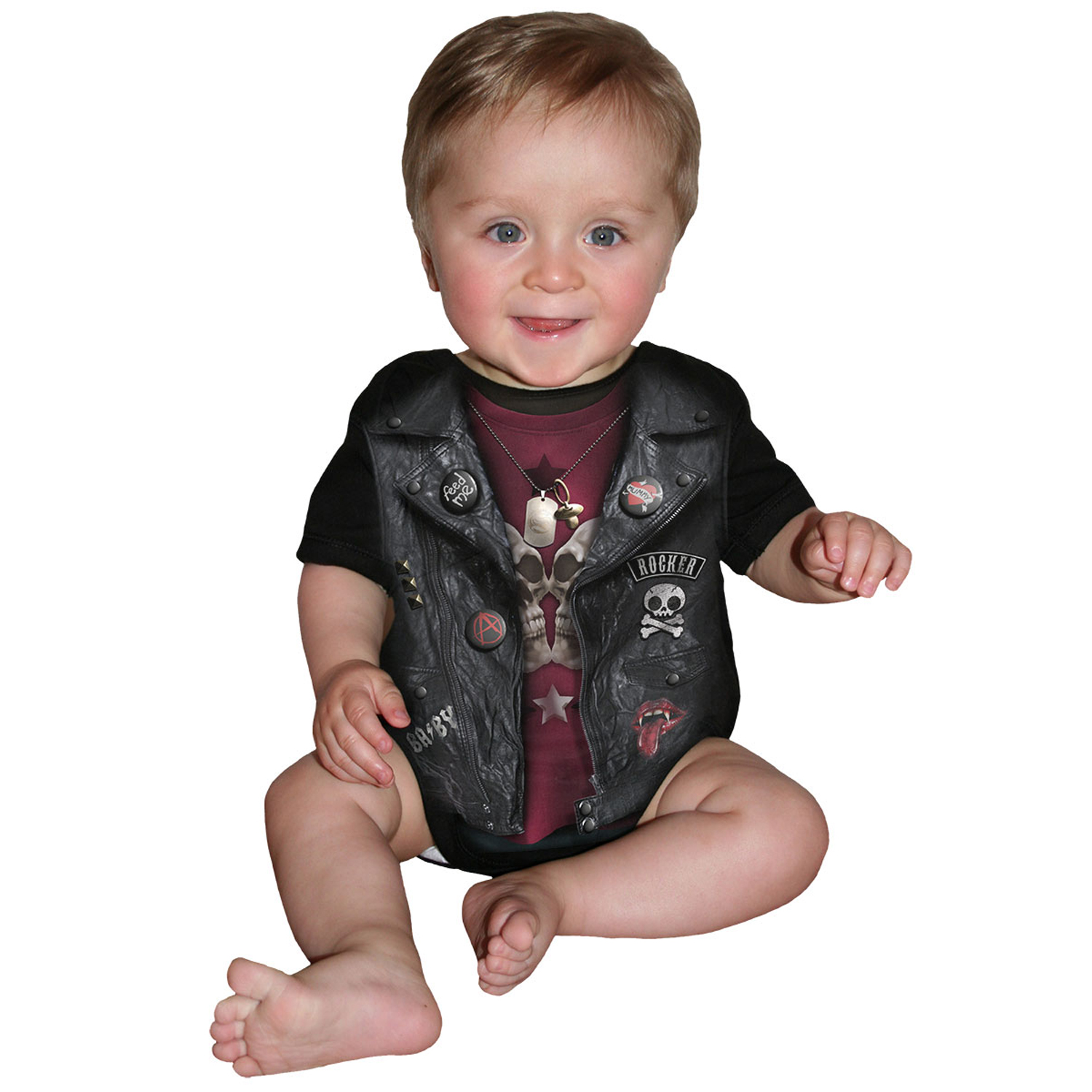 • Rock that cradle all night long, cos this baby was Born to be Wild! • Every biker needs a trusty leather waistcoat, replete with badges, patches, and band logos....a dummy too, apparently. •...