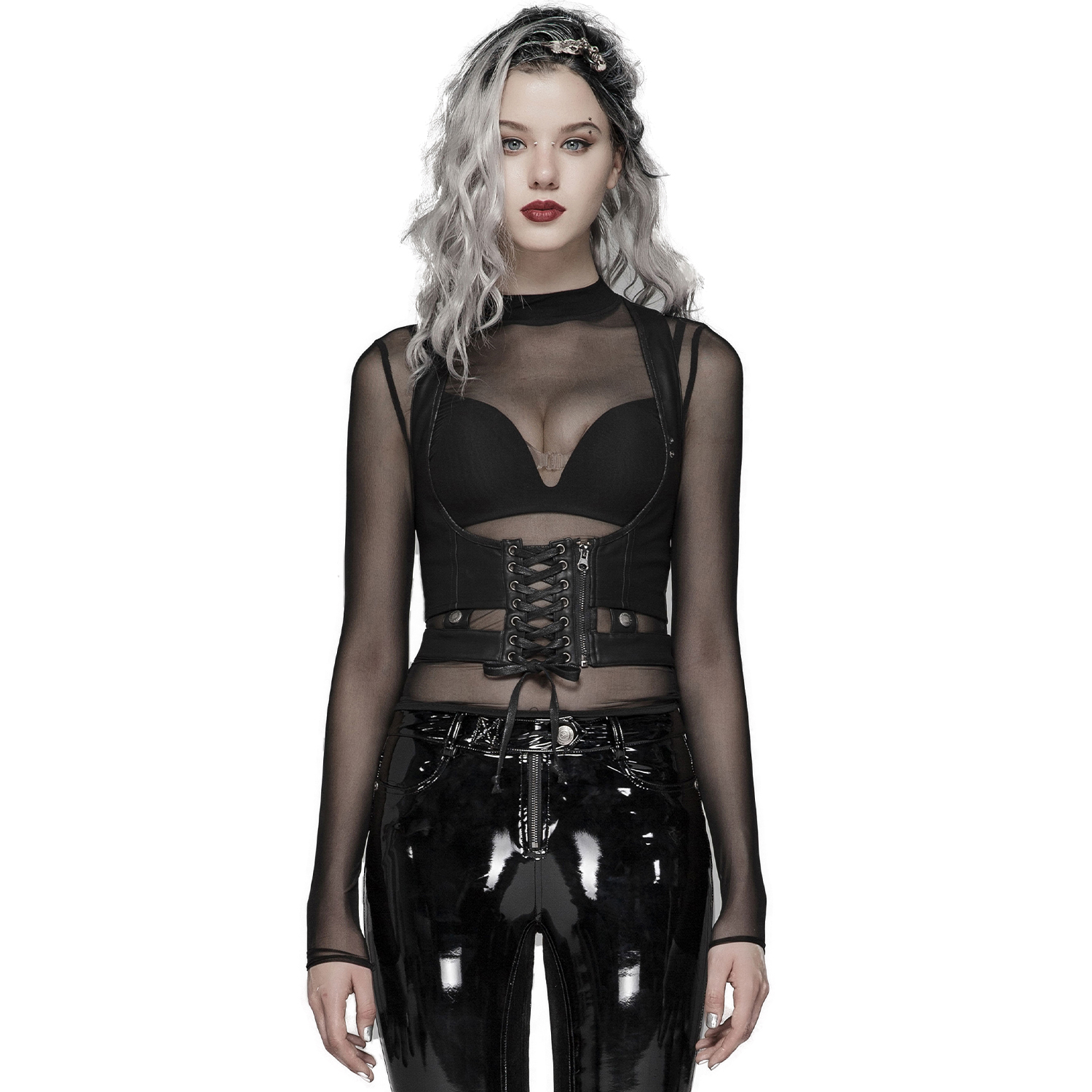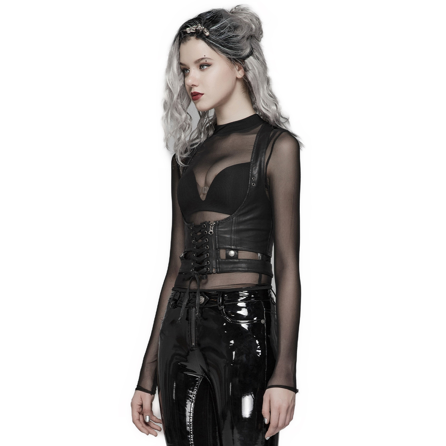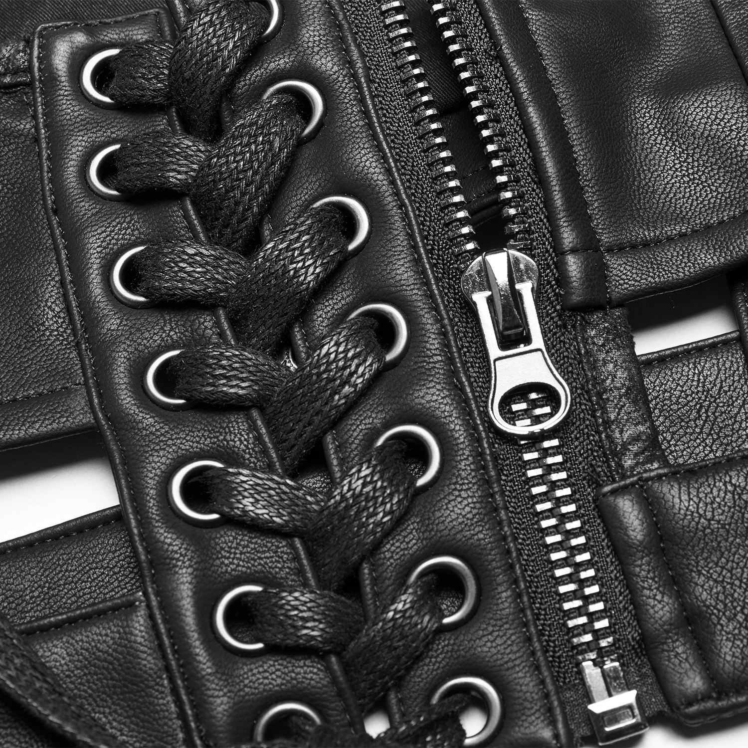 Black Industrial Gothic Style Synthetic Vegan Leather Left Shoulder Harness • High collar • Lacing on the left side • Zipper on the right of the neck • Ring with adjustable strap • Lining 97.1%...