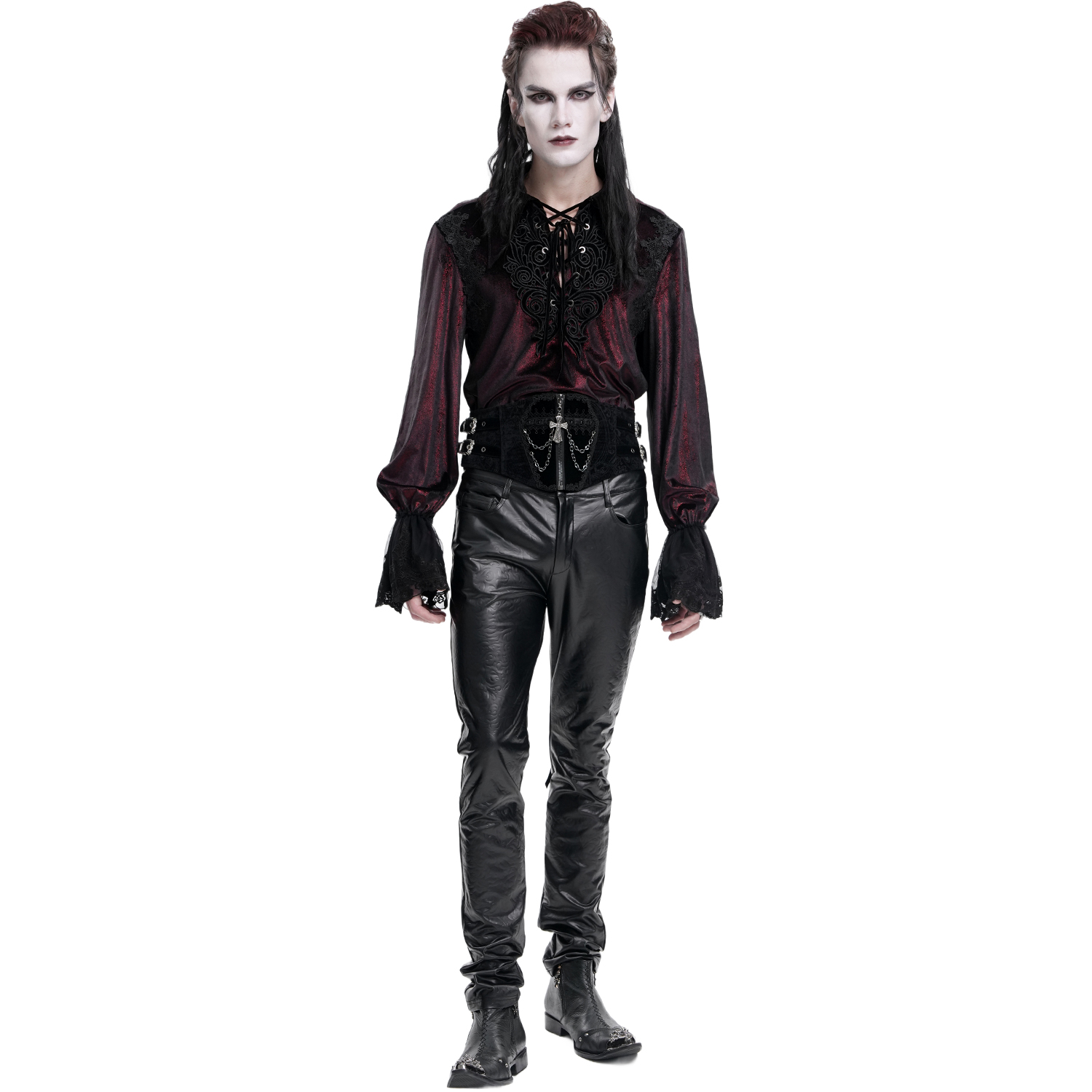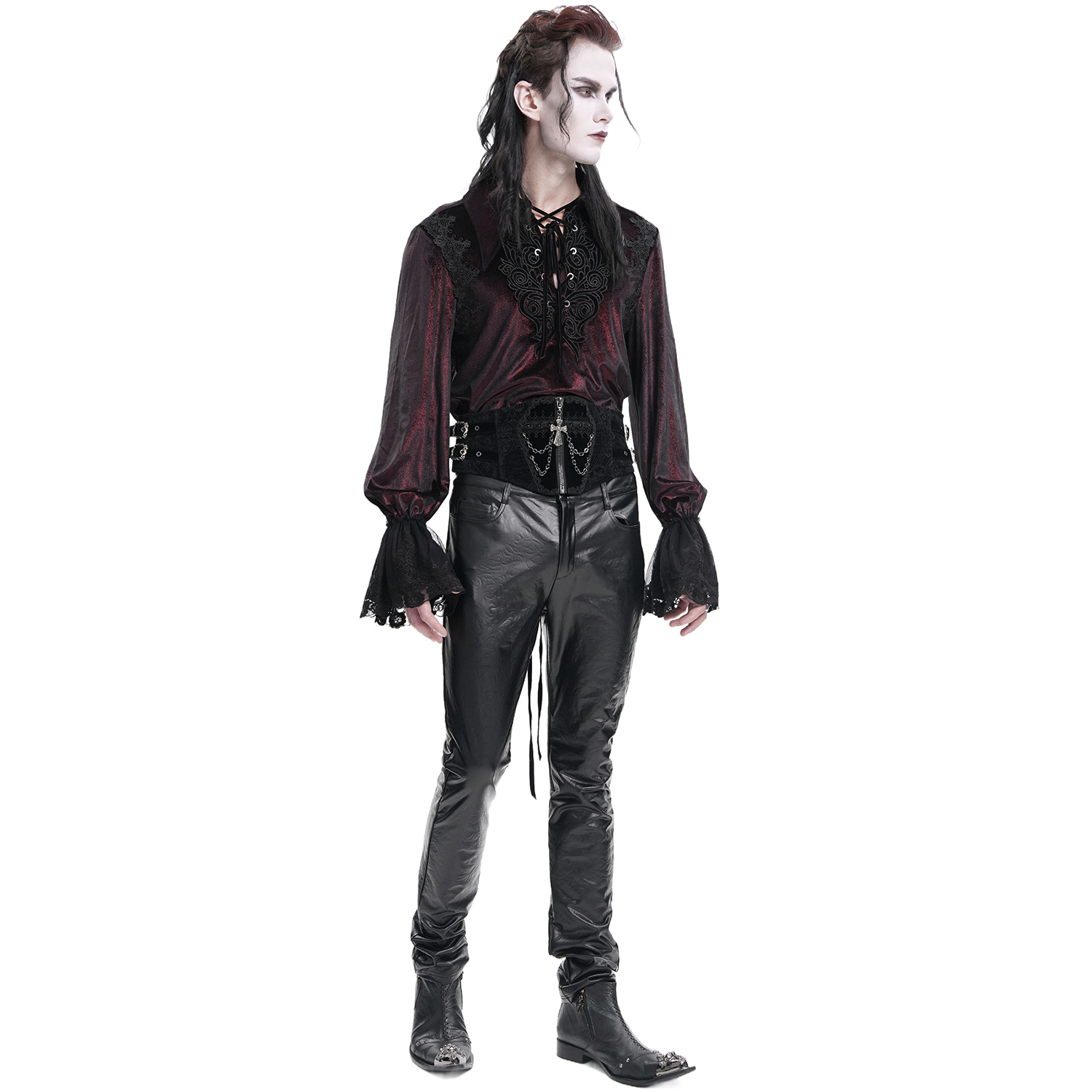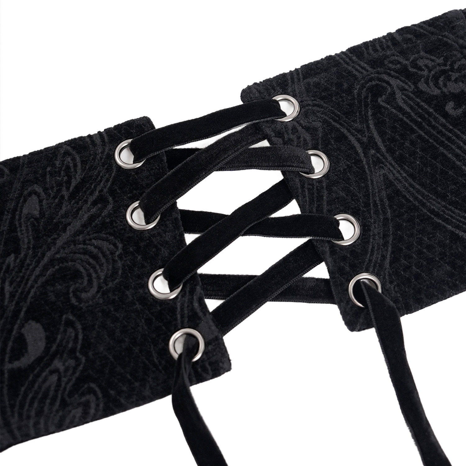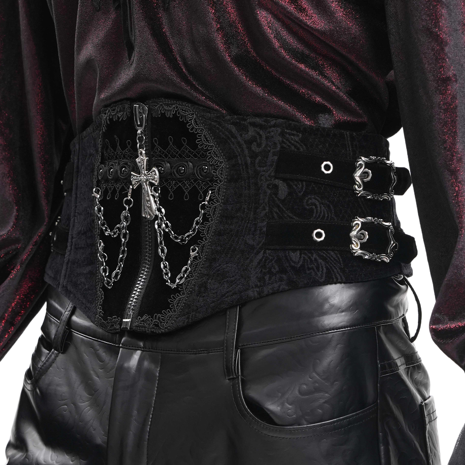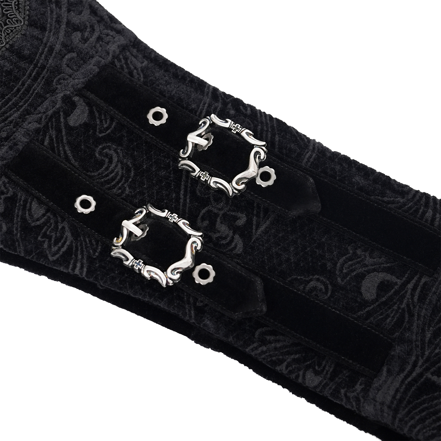 Men's Velvet Jacquard Waist Cincher Belt • Adorned with sumptuous embroidery • Original cutout with chiselled pewter corners • Concealed zipper • Fully lined in velvet • Lacing in the back with a...