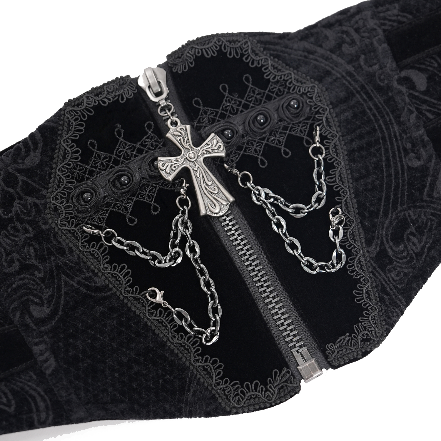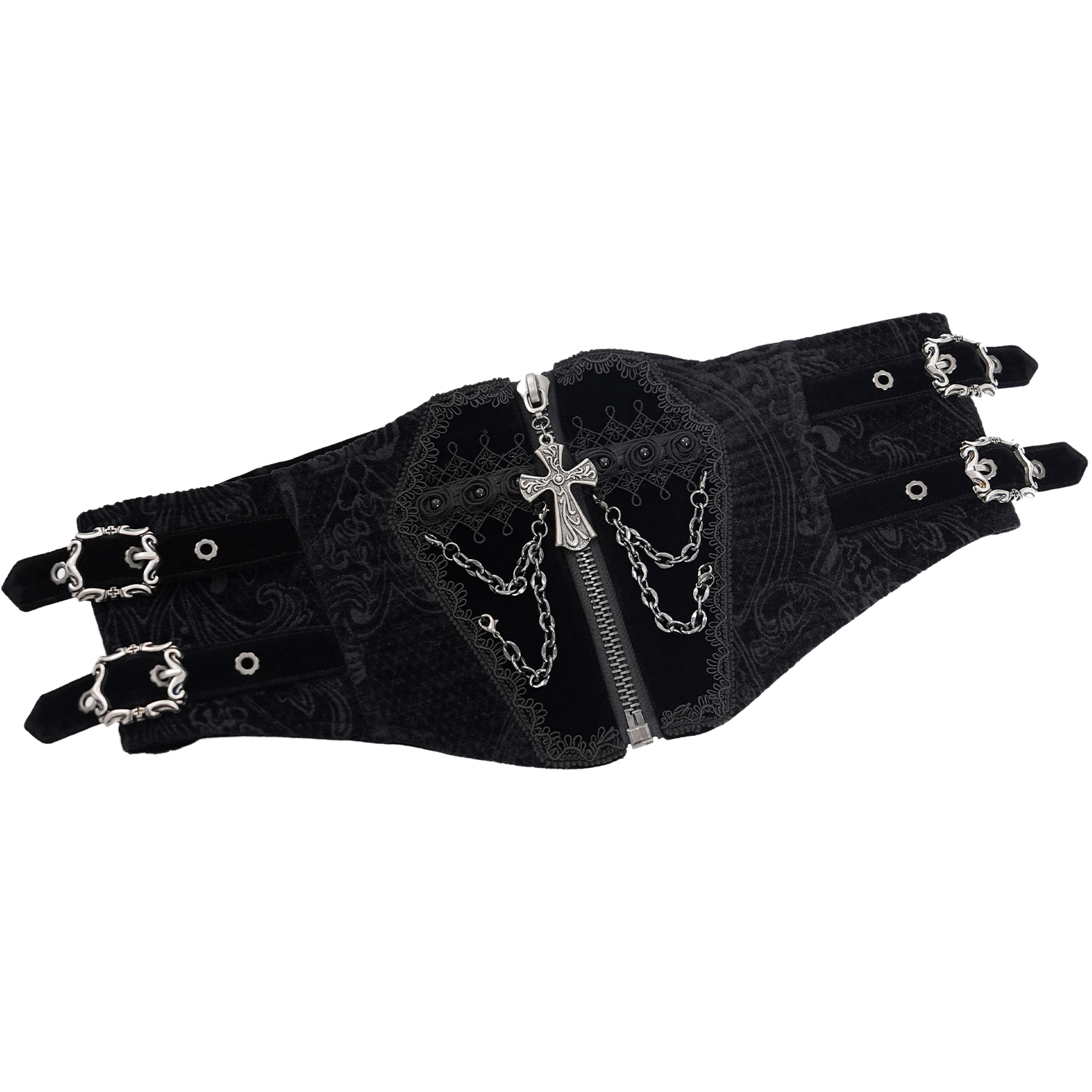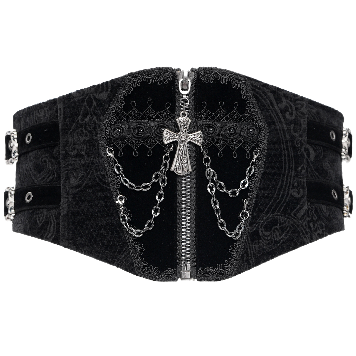 • Black jacquard printed corset belt • The solid color on the center front gives it a coffin shape • The coffin is decorated with ribbons and beads • Removable silver-tone metal chains • Front...
