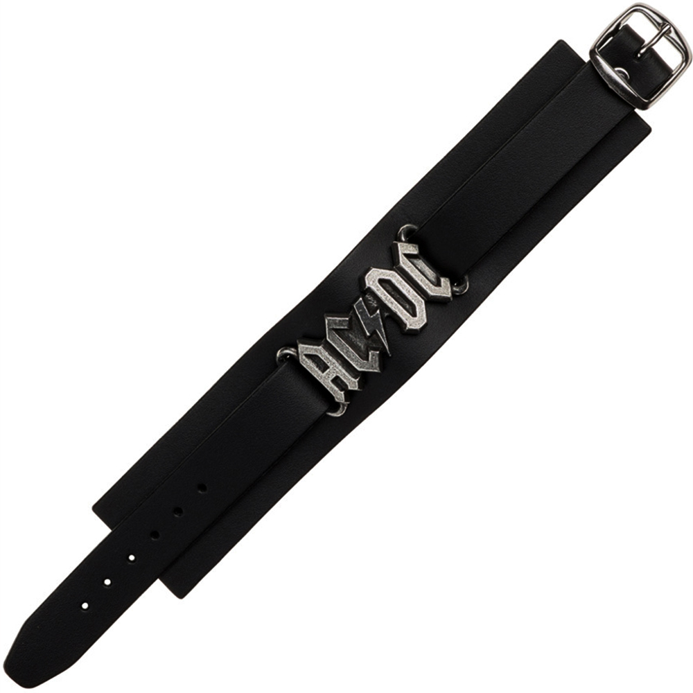 • A 1 ½", (38 mm) wide black leather wrist strap with a cast antiqued English pewter link-plate of AC/DC's classic 1977 logo; adjustable length, fastened with a steel buckle.