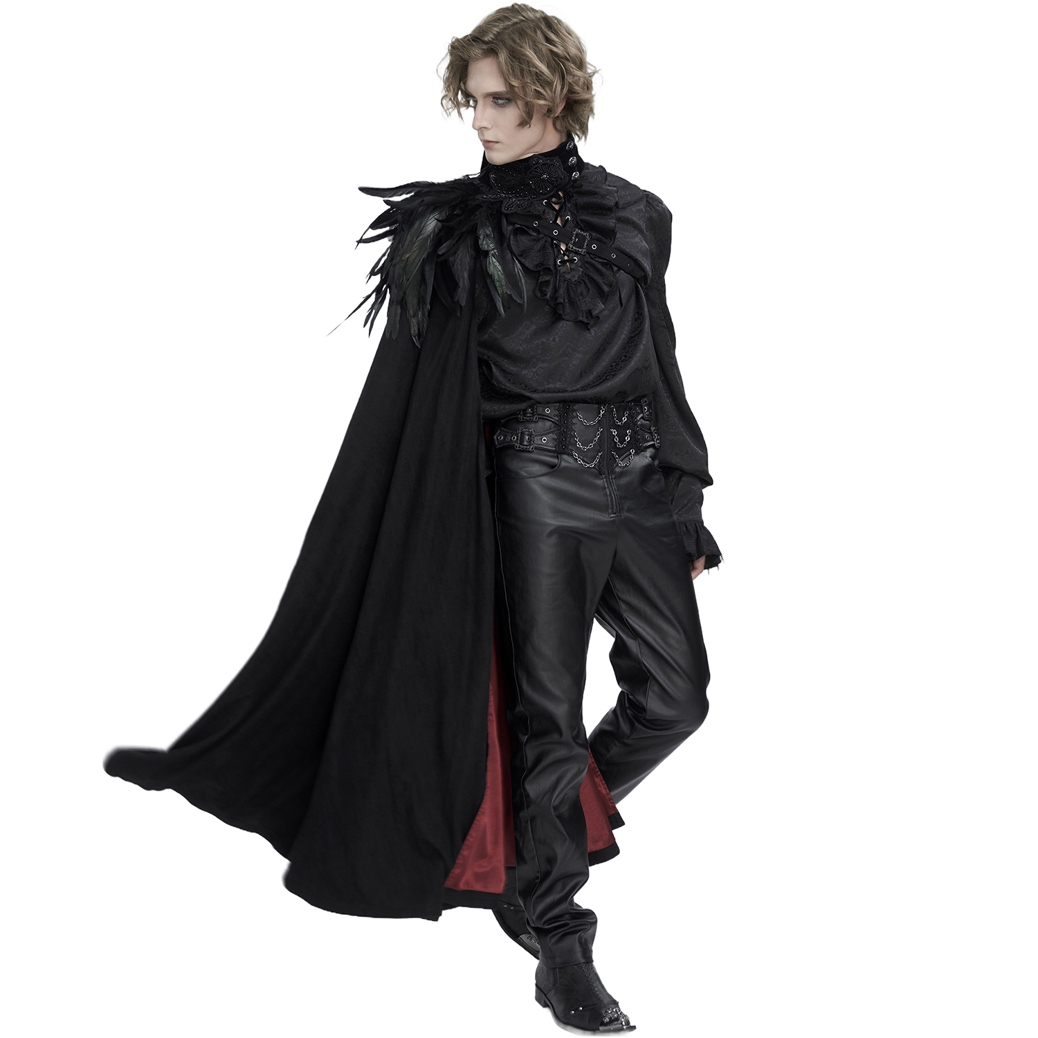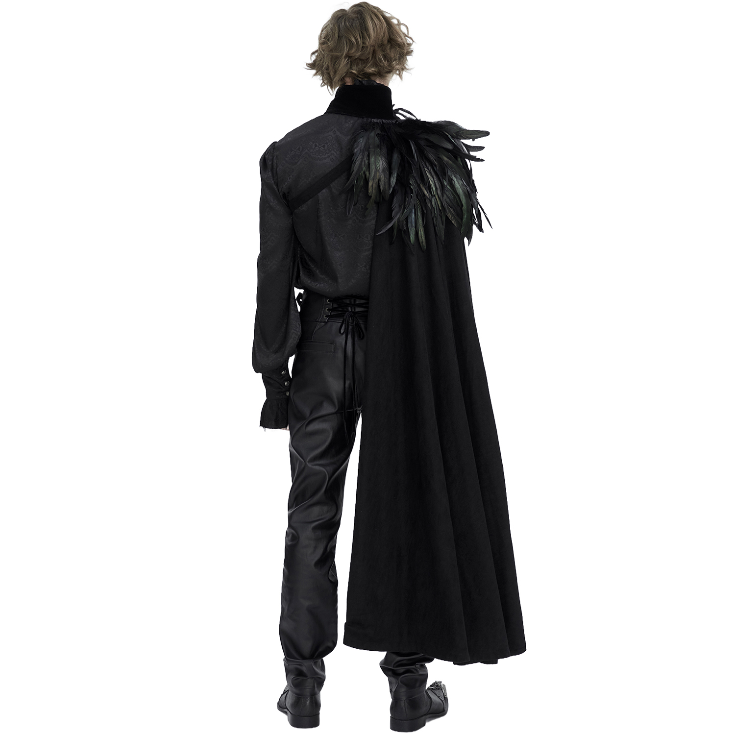 Superb Victorian Gothic Vampiric Men's Vest featuring a long black velvet fitted coat with a cashmere-embossed print and a full-length black leatherette outer cape attached to the shoulders. •...