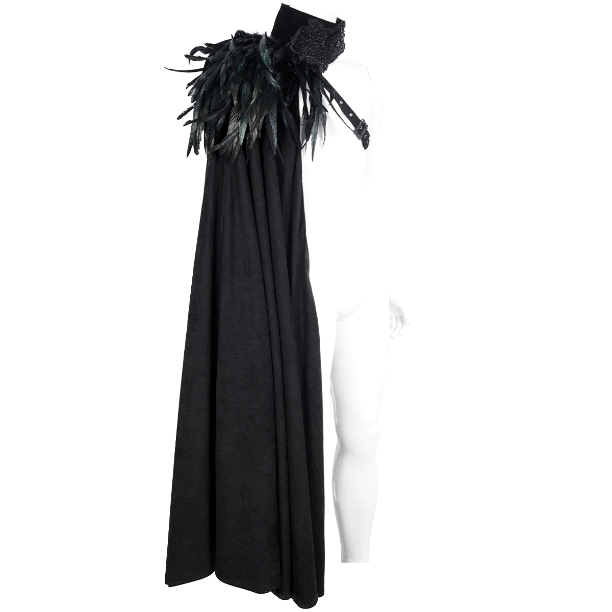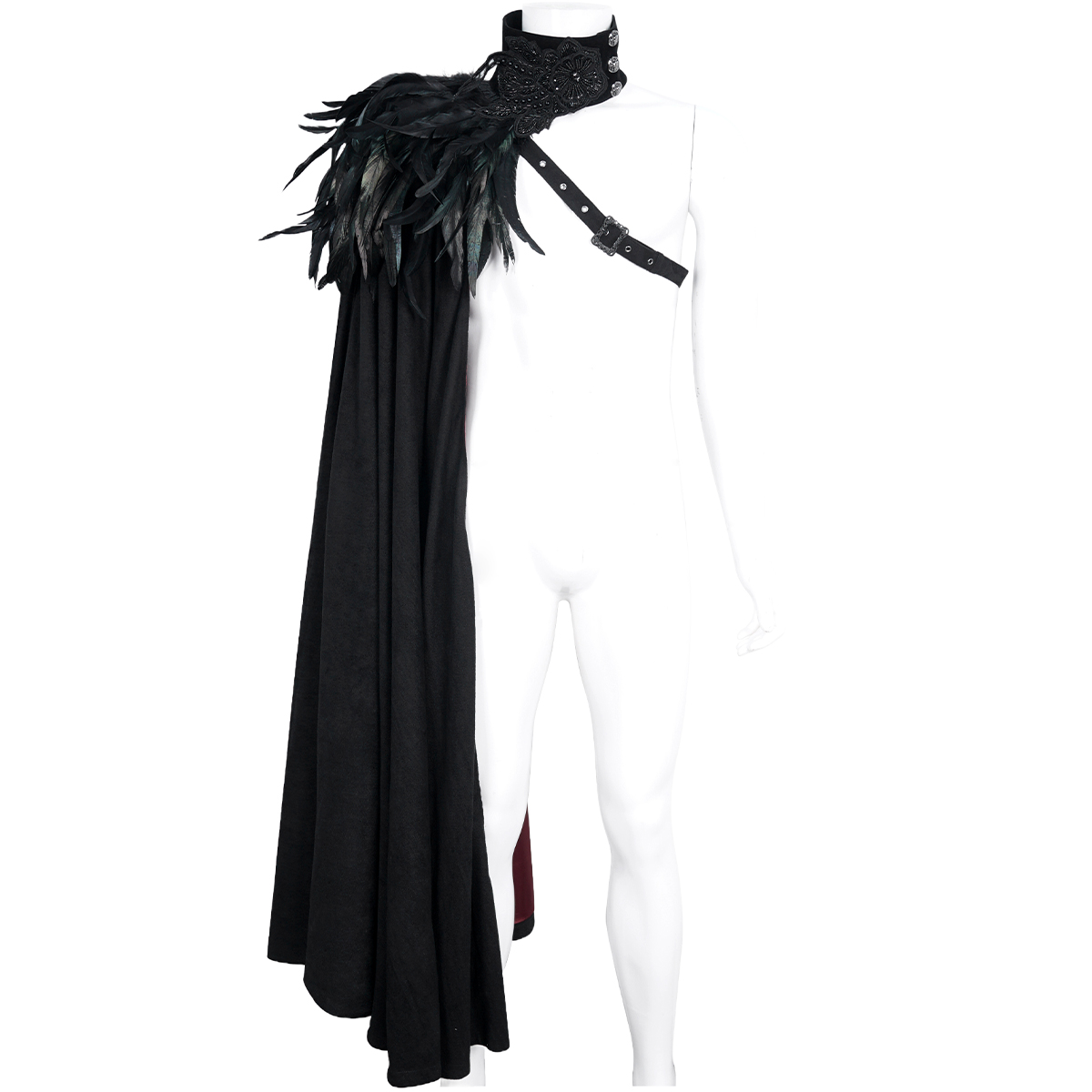 • Asymmetrical black suede half cape • Black feathers on the shoulder • Burgundy fabric lining • High black beaded lace collar • Engraved metal buttons on the left side of the collar • Adjustable...