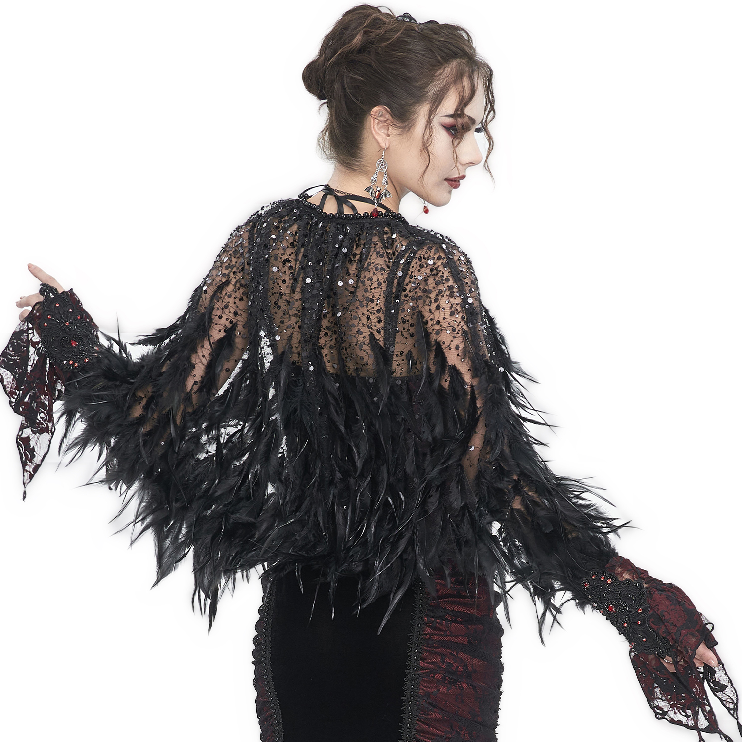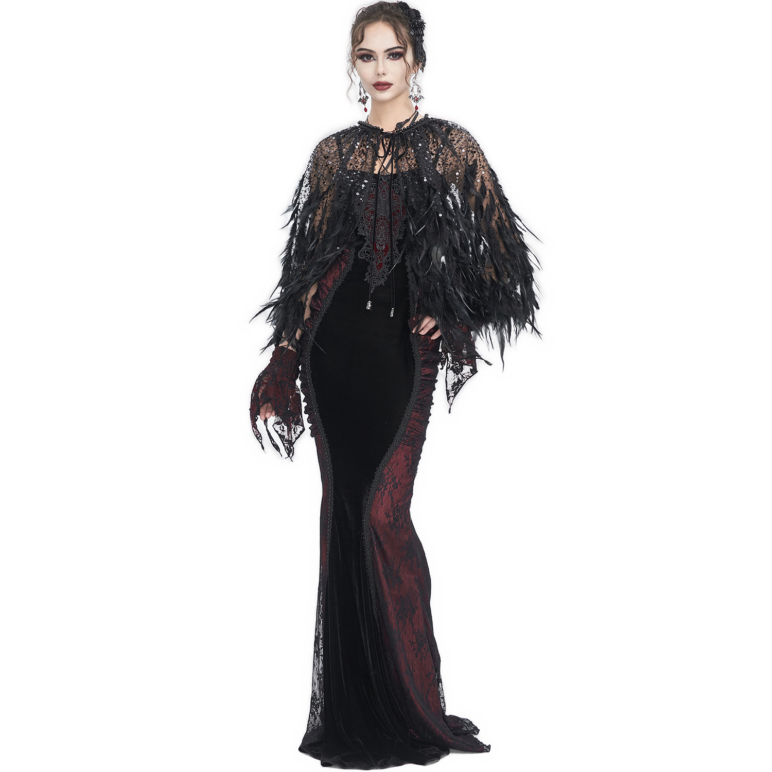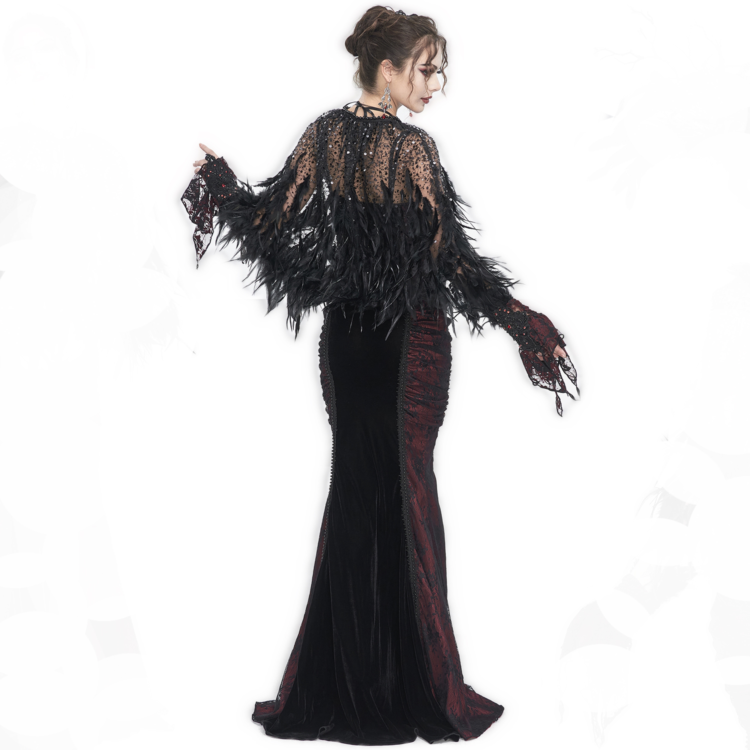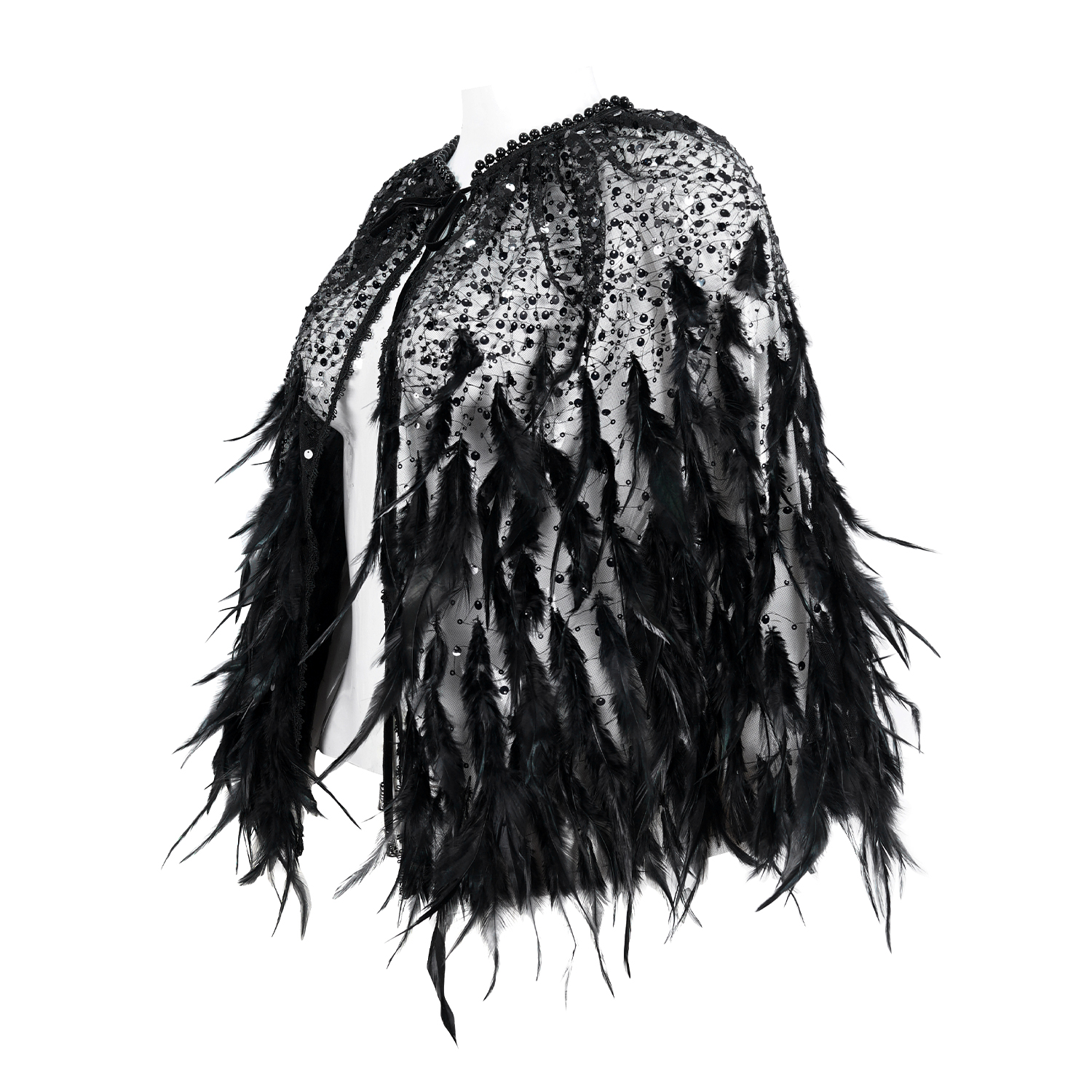 • Asymmetrical black suede half cape • Black feathers on the shoulder • Burgundy fabric lining • High black beaded lace collar • Engraved metal buttons on the left side of the collar •...