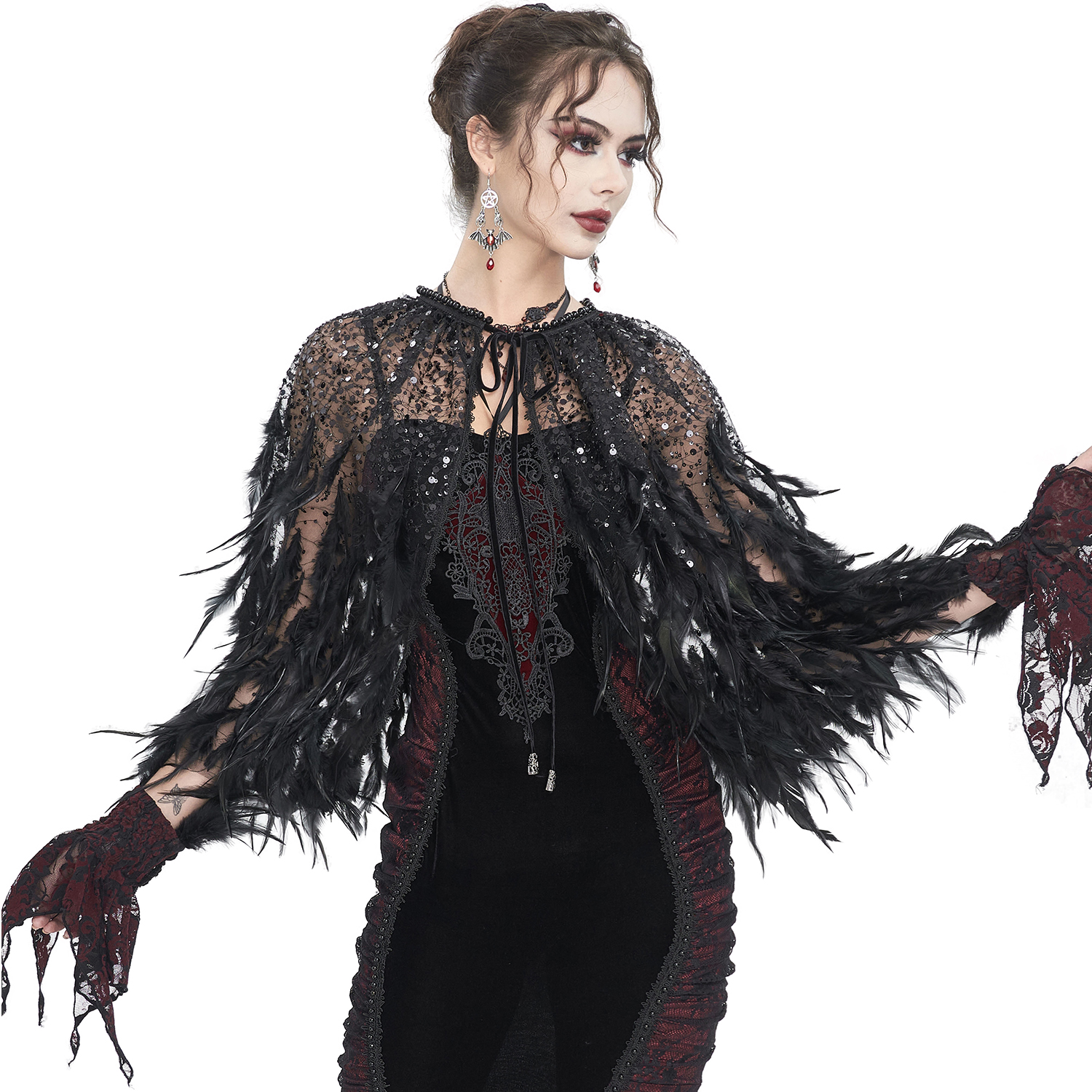 • Black tulle with a gradient of sequins and feathers • Black lace trim • Close with a velvet cord at the front • Oversized tulle hood with lace trim • One size • 100% Polyester By Eva Lady...