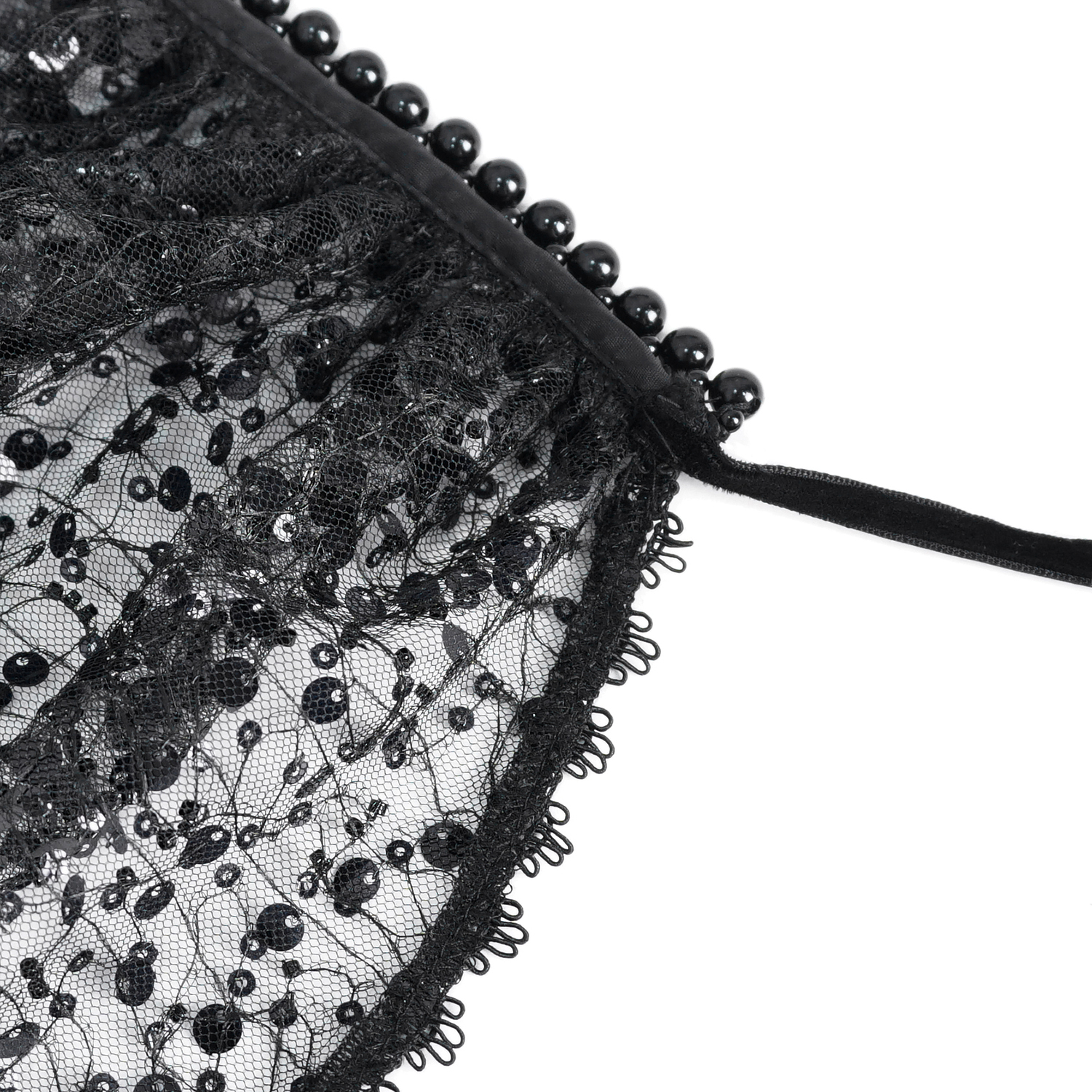 • Embroidered black tulle edges • Solid black lining • Arm openings on each side • Gathered lace and black stones on the top of the garment • Closes with a black velvet ribbon for a perfect fit...