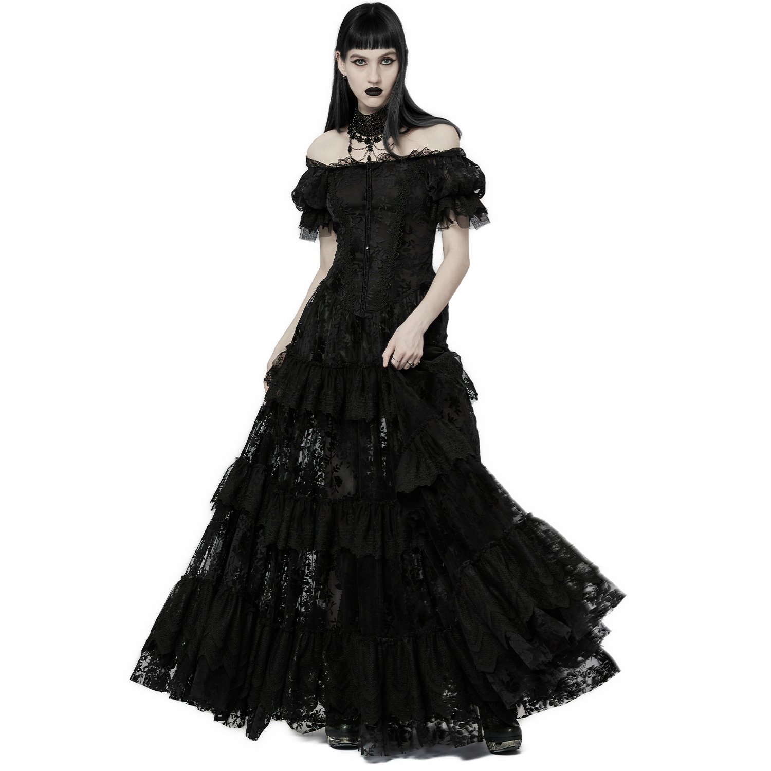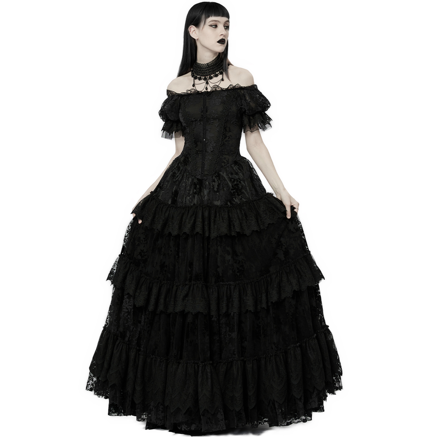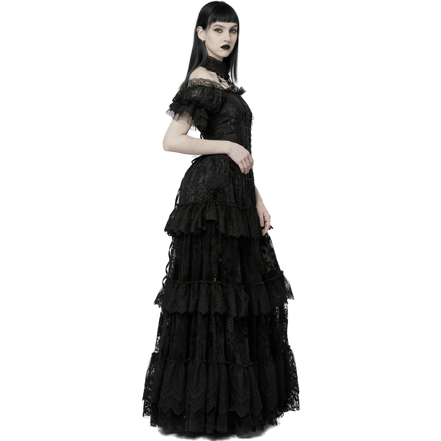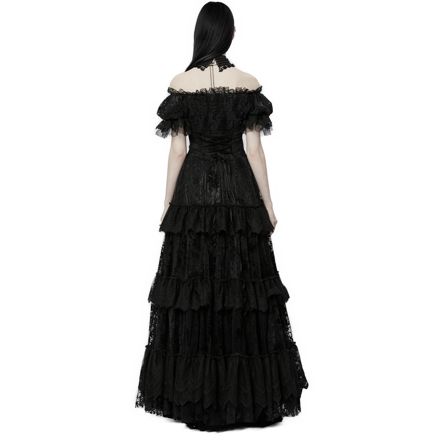 Black long sleeve, off the shoulder Victorian Gothic dress with chiffon sleeves, embroidered chest and lace up back. • Black satin polyester with floral pattern • Bare shoulders • Chest laced...