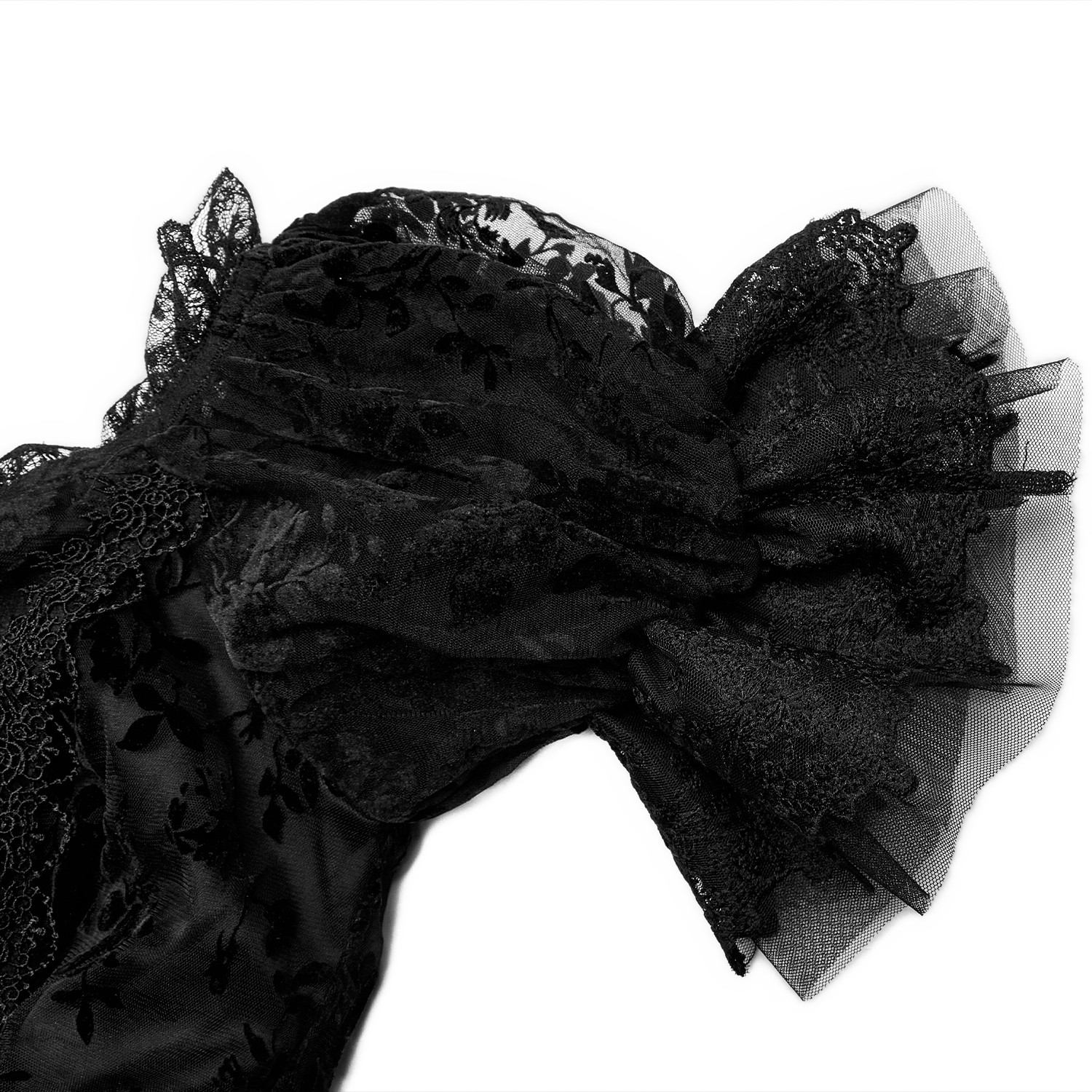 • Puffed sleeves finished with sumptuous black lace