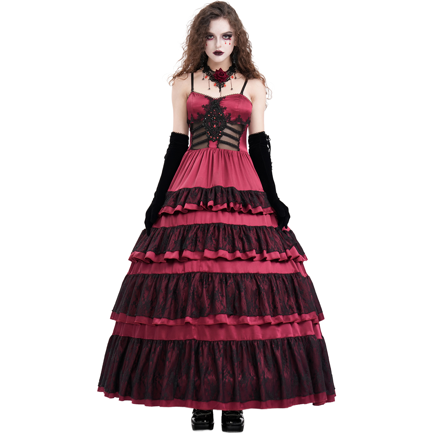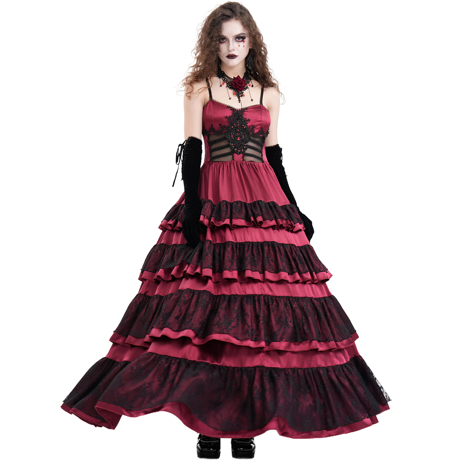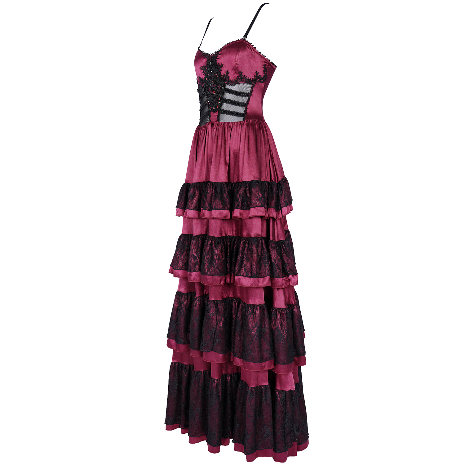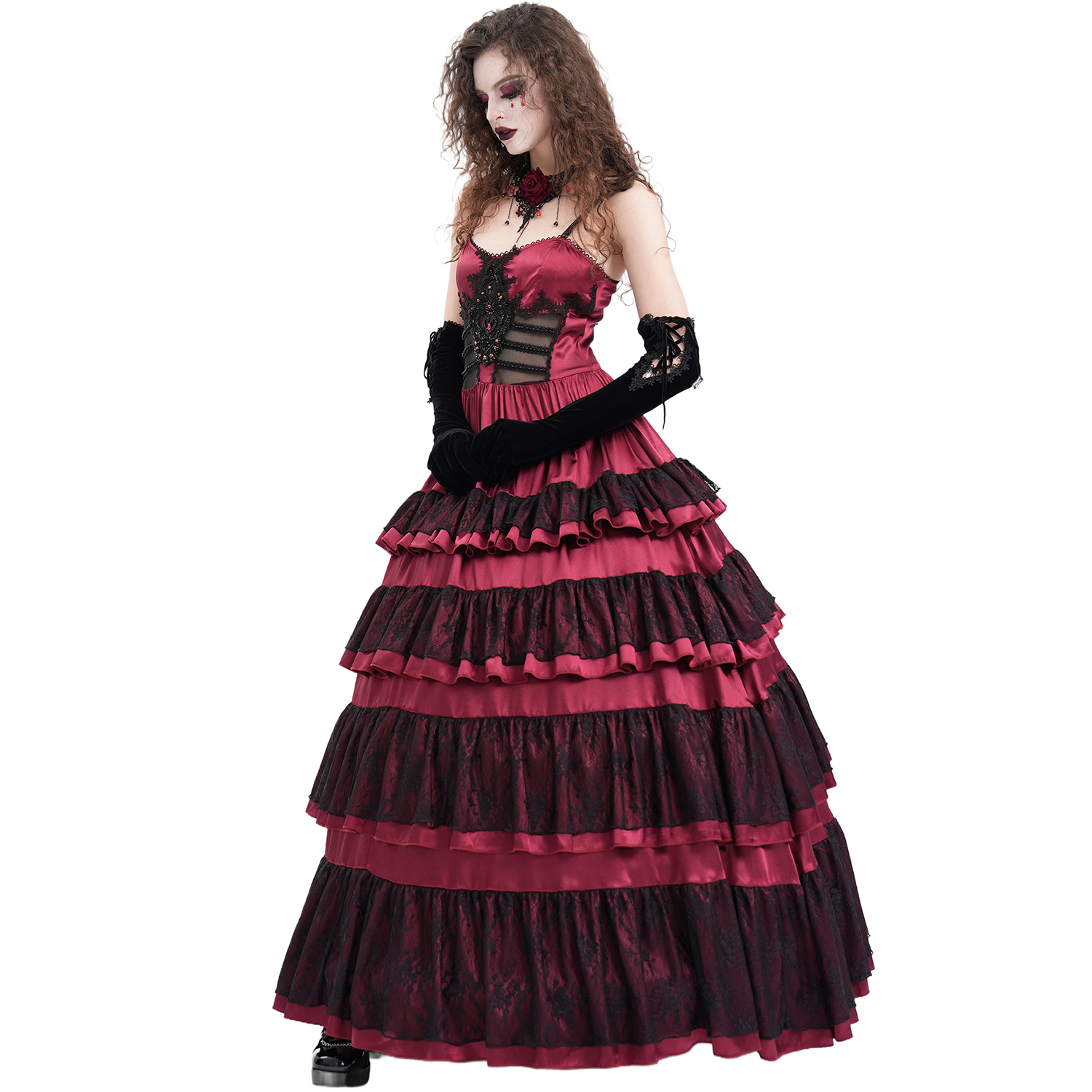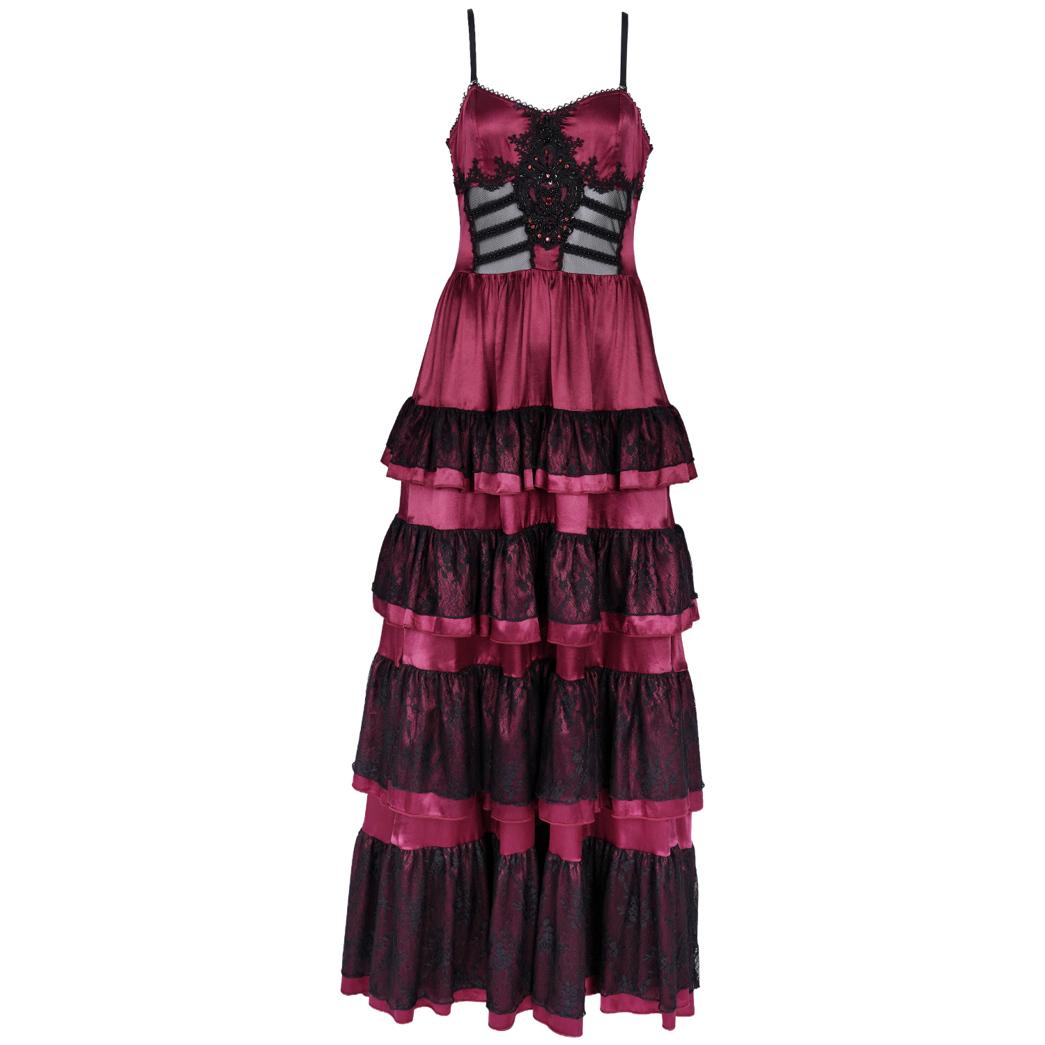 • Flowing satin • Delicate lace ruffles • Adjustable straps • Stunning embroidery with black stones on the chest • Lace-up back for a perfect fit • Also available in red • Dare to be...