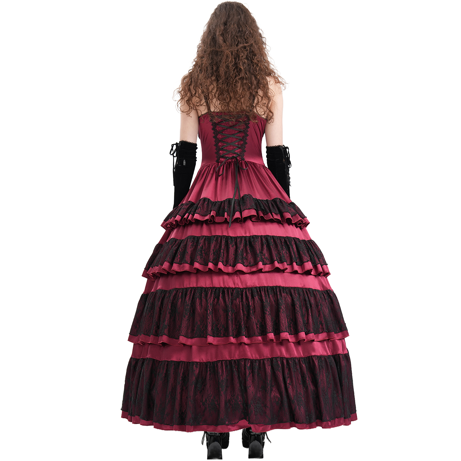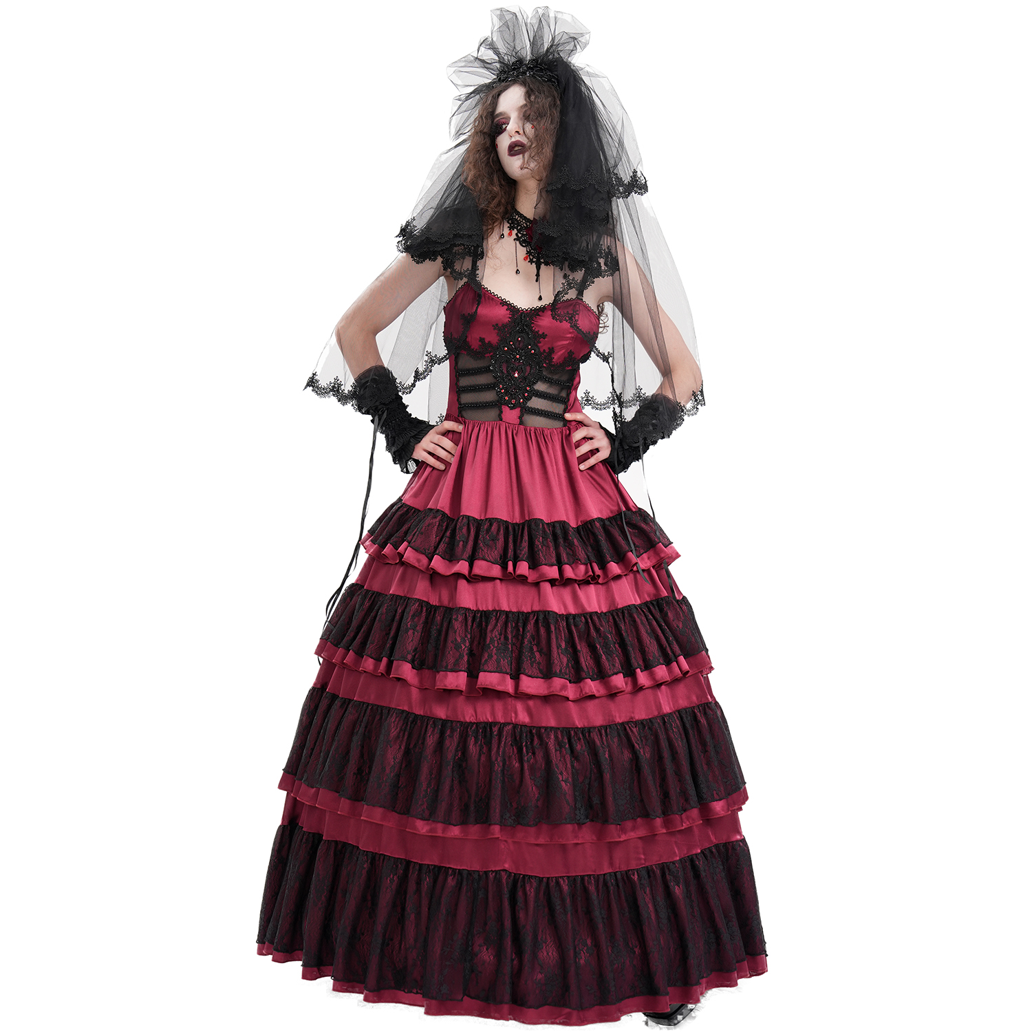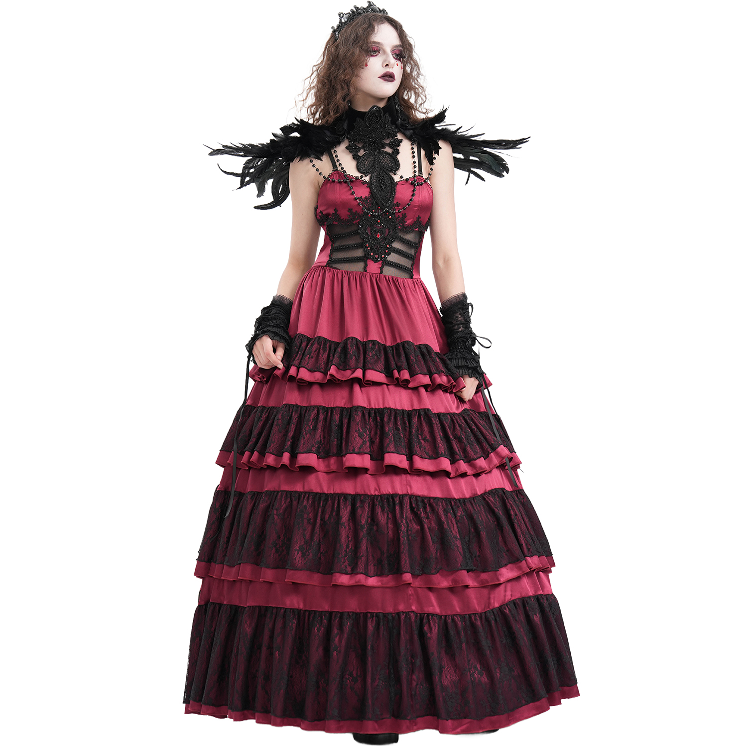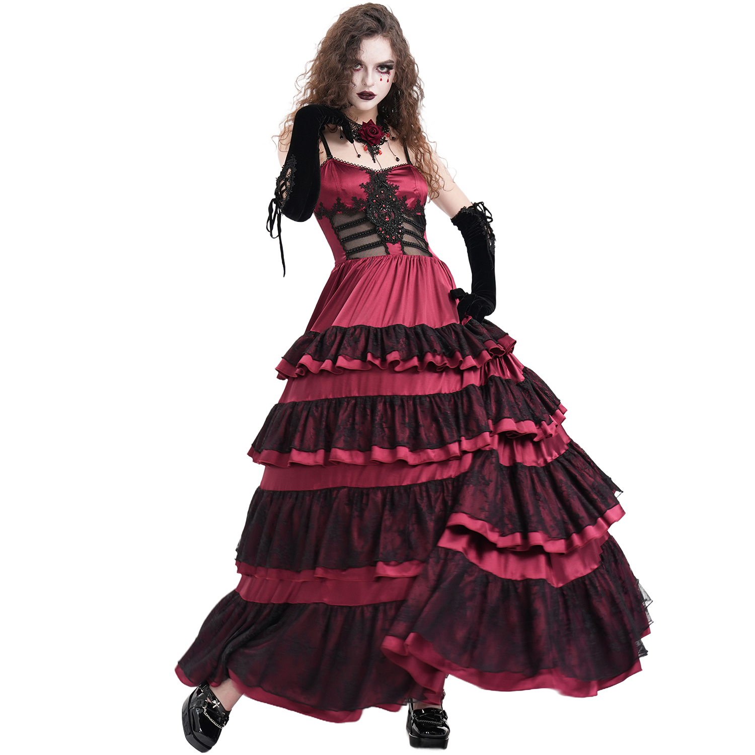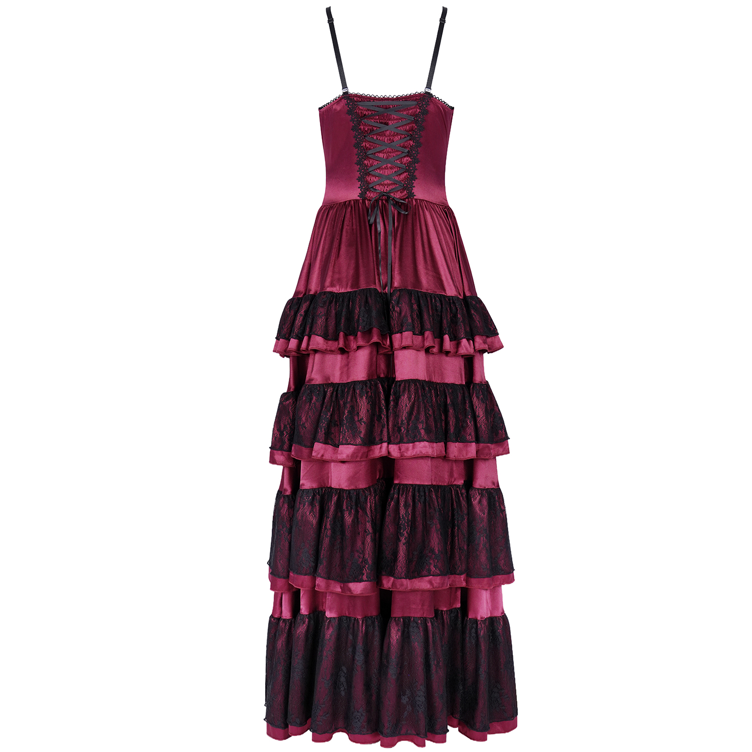 • Flowing satin • Delicate lace ruffles • Adjustable straps • Stunning embroidery with black stones on the chest • Lace-up back for a perfect fit • Also available in red • Dare to be...