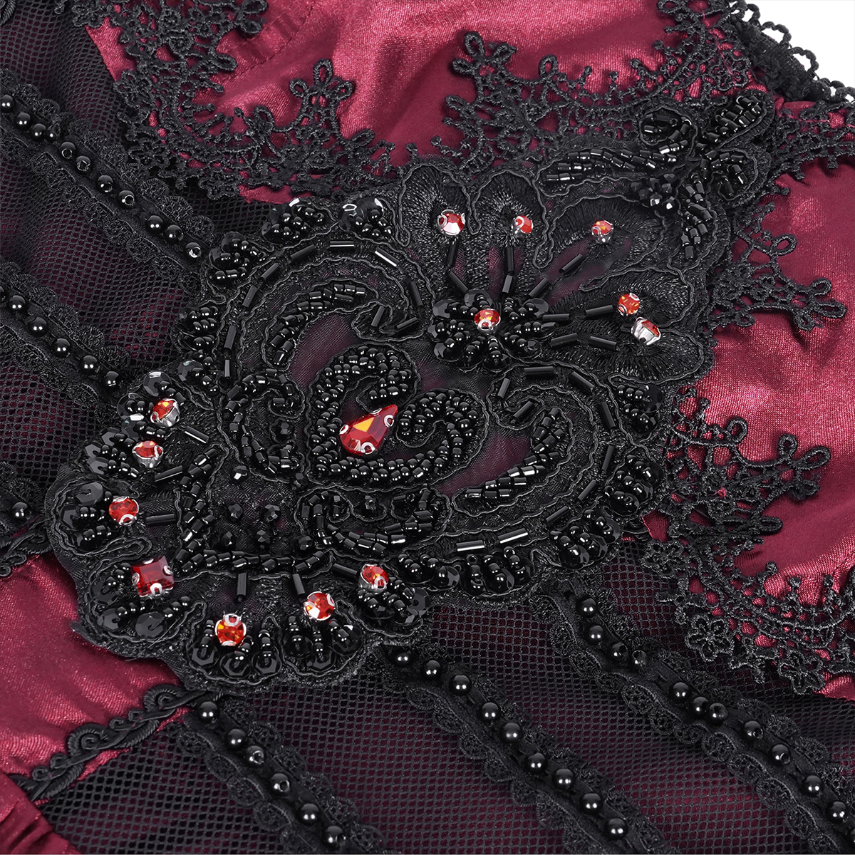 • Romantic gothic red velvet mini dress • Two rows of decorative chains across the chest • Adorned with delicate lace and silver chains • Three-dimensional floral hem • Adjustable straps •...