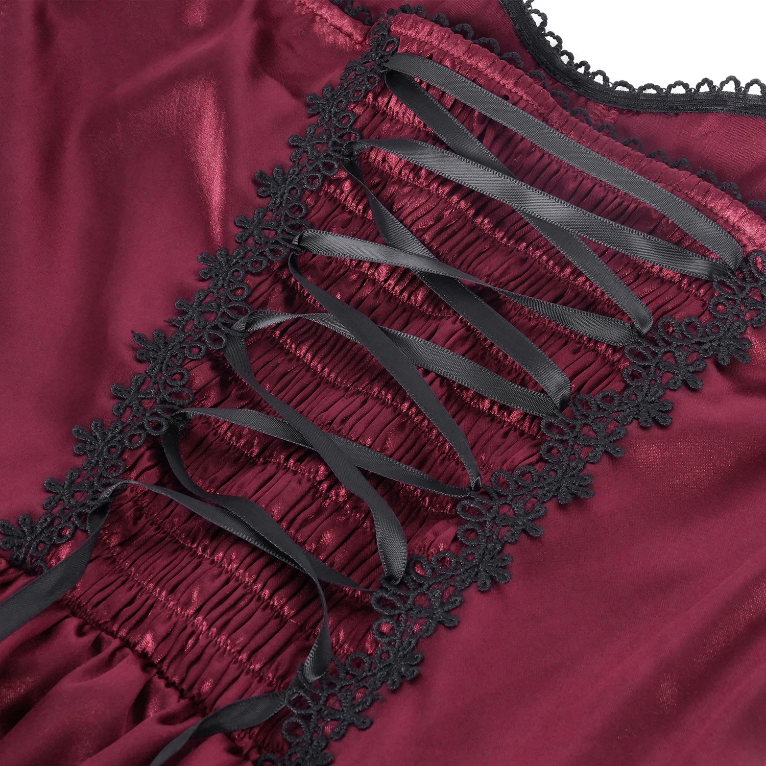 • Semi-sheer shiny satin • Ruffled lace on shoulders and neckline • Lace-up front • Hook and eye closure at back with elastic band • Ruffled lace at hem • 68% Polyester 30% Polyamide, 2% Spandex...