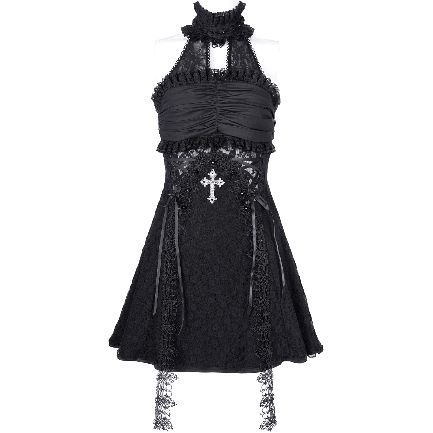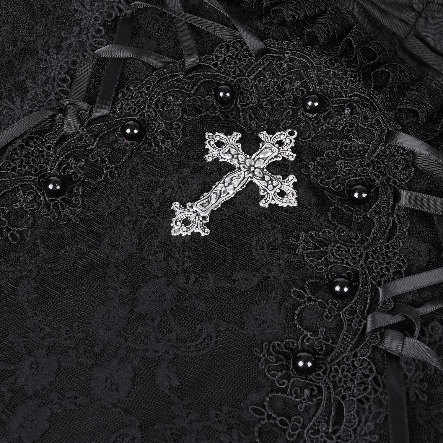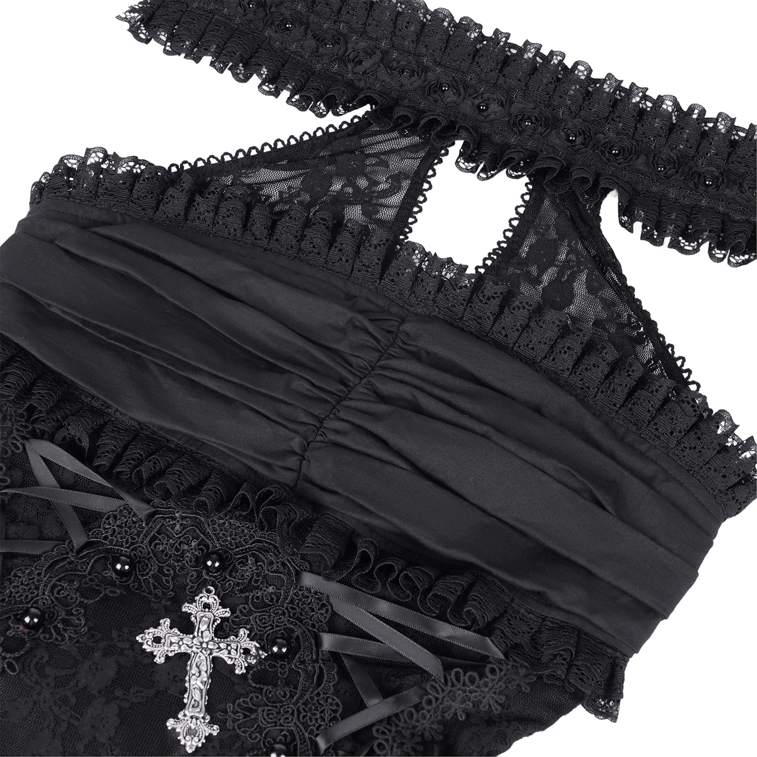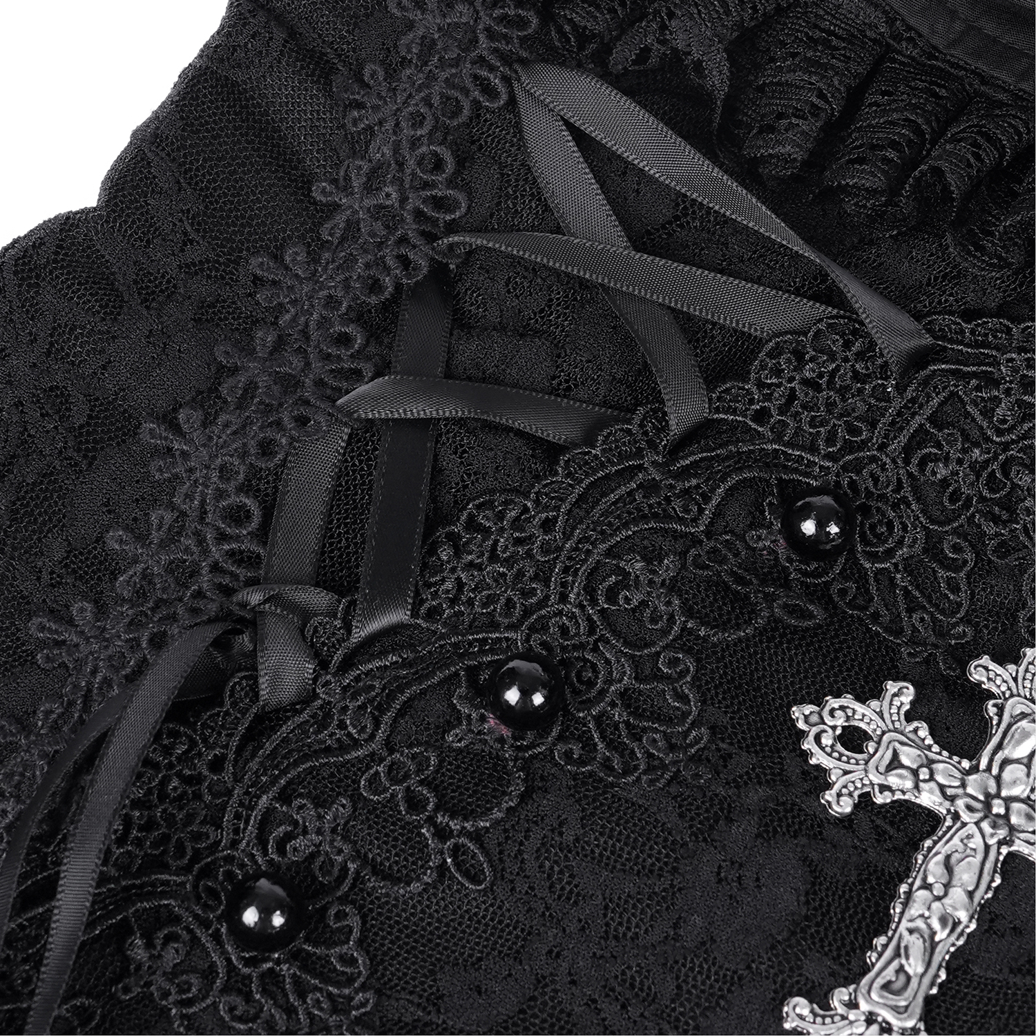 • Flocked mesh combined with satin • Gathered lace with 3D roses and black beads on the neckline and upper bust • Beaded chains between the neckline and bust with removable metal cross to wear...