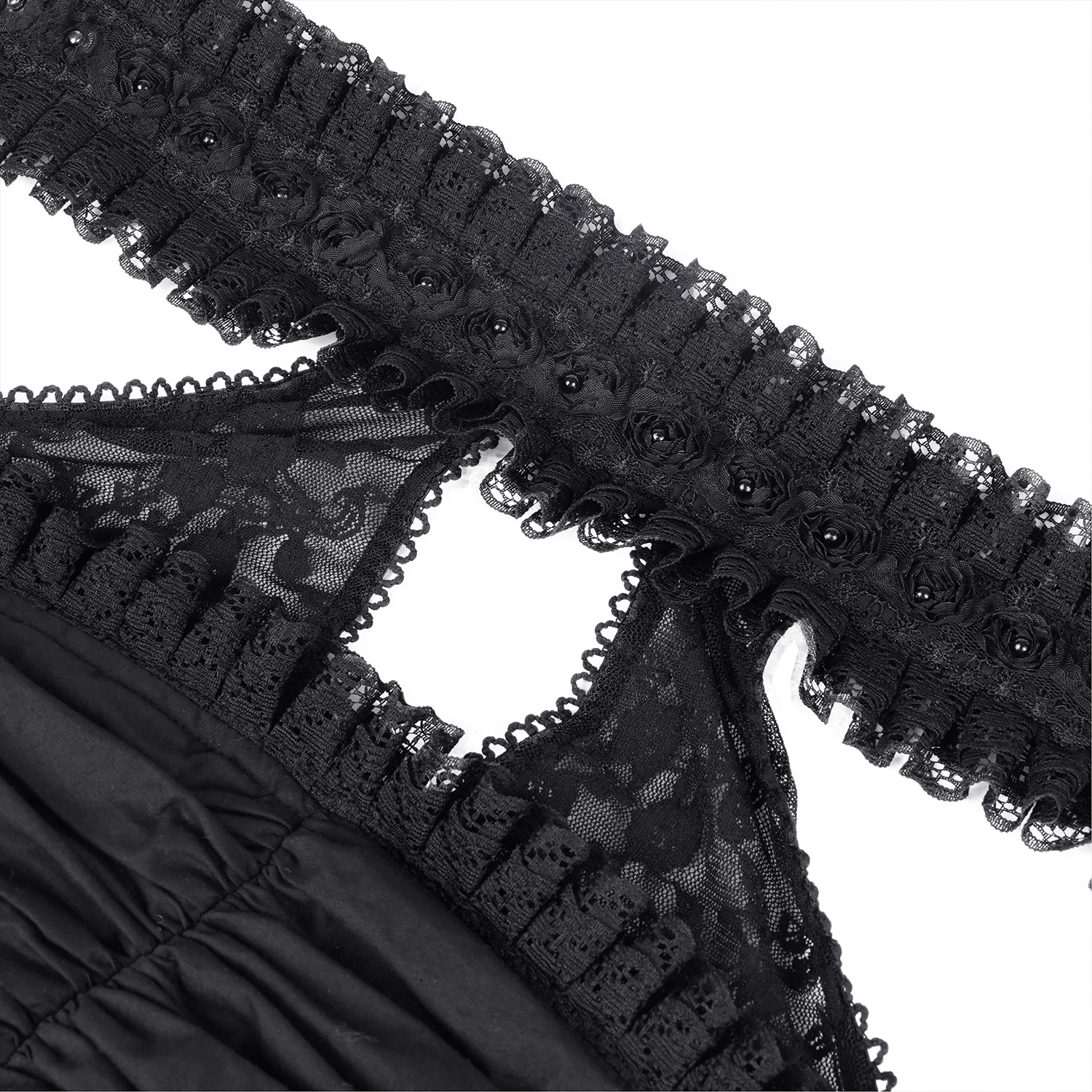 • In dense and stretchy black velvet • Bare shoulders • V-shaped lace applique with adjustable lacing on the chest • Symmetrical skirt hem designed with offset layers • Ruffles and lace on the...