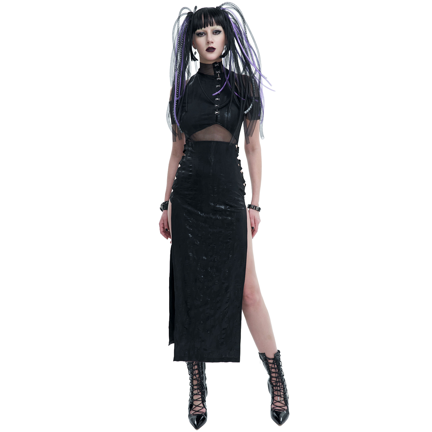 Stunning gothic lace dress • Long and fluid lace skirt • Details in transparent black mesh • Closes with two ornate buttons at the back of the neck and a concealed side zipper • Adjusted lace...