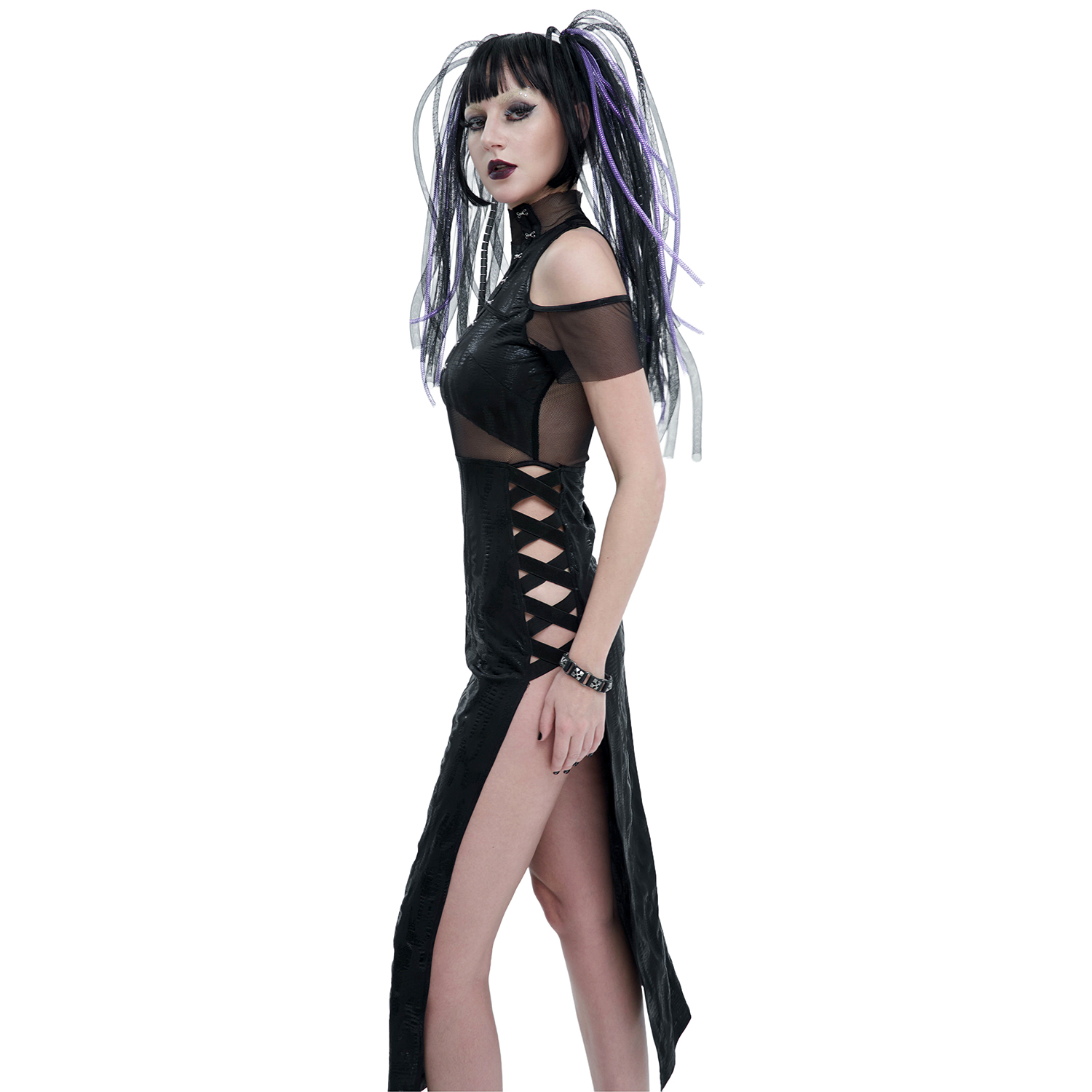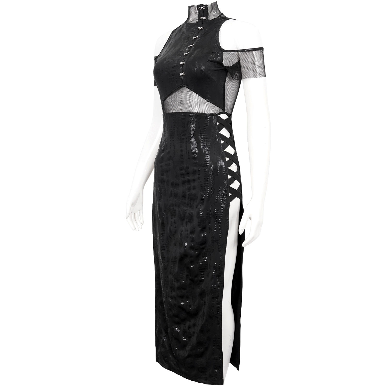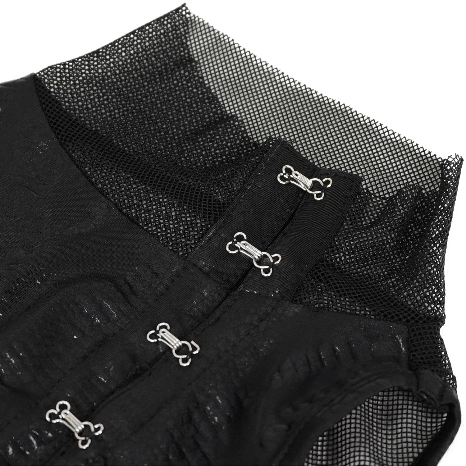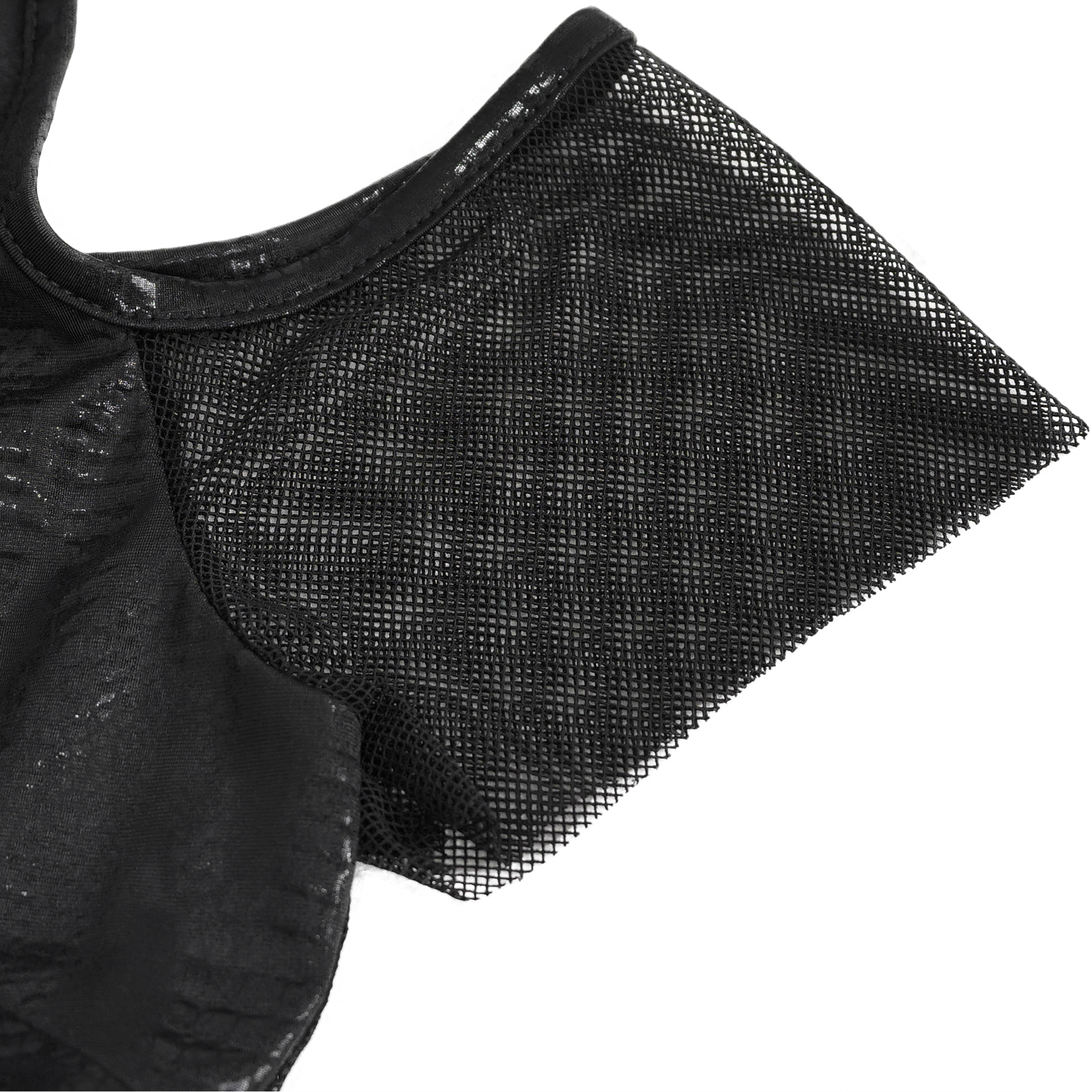 • Soft, shredded cotton on top • Fishnet decorated with cobwebs underneath • Faux leather stand-up collar with buckle and press stud in the back of the neck • Faux leather straps joined together by...