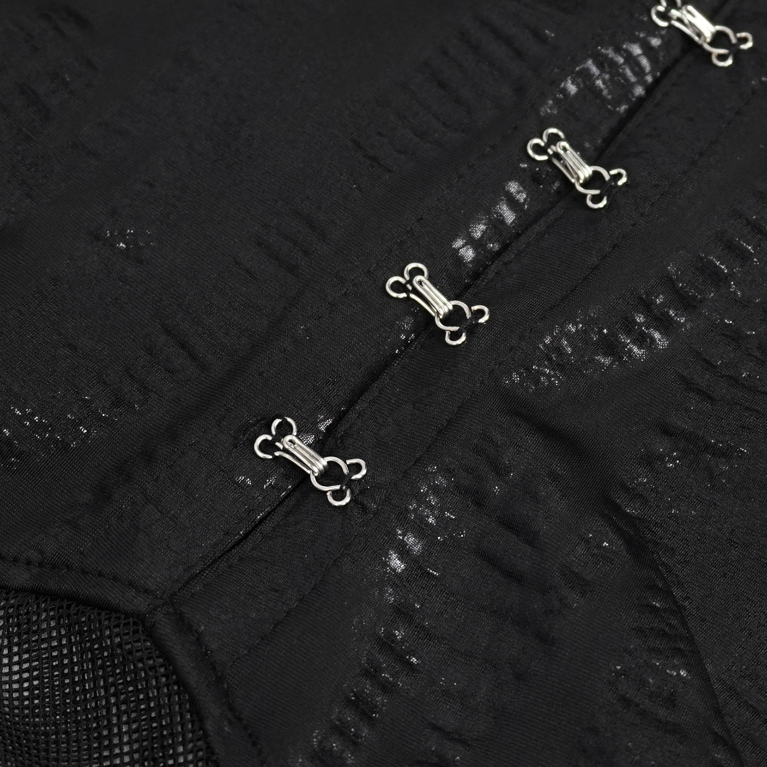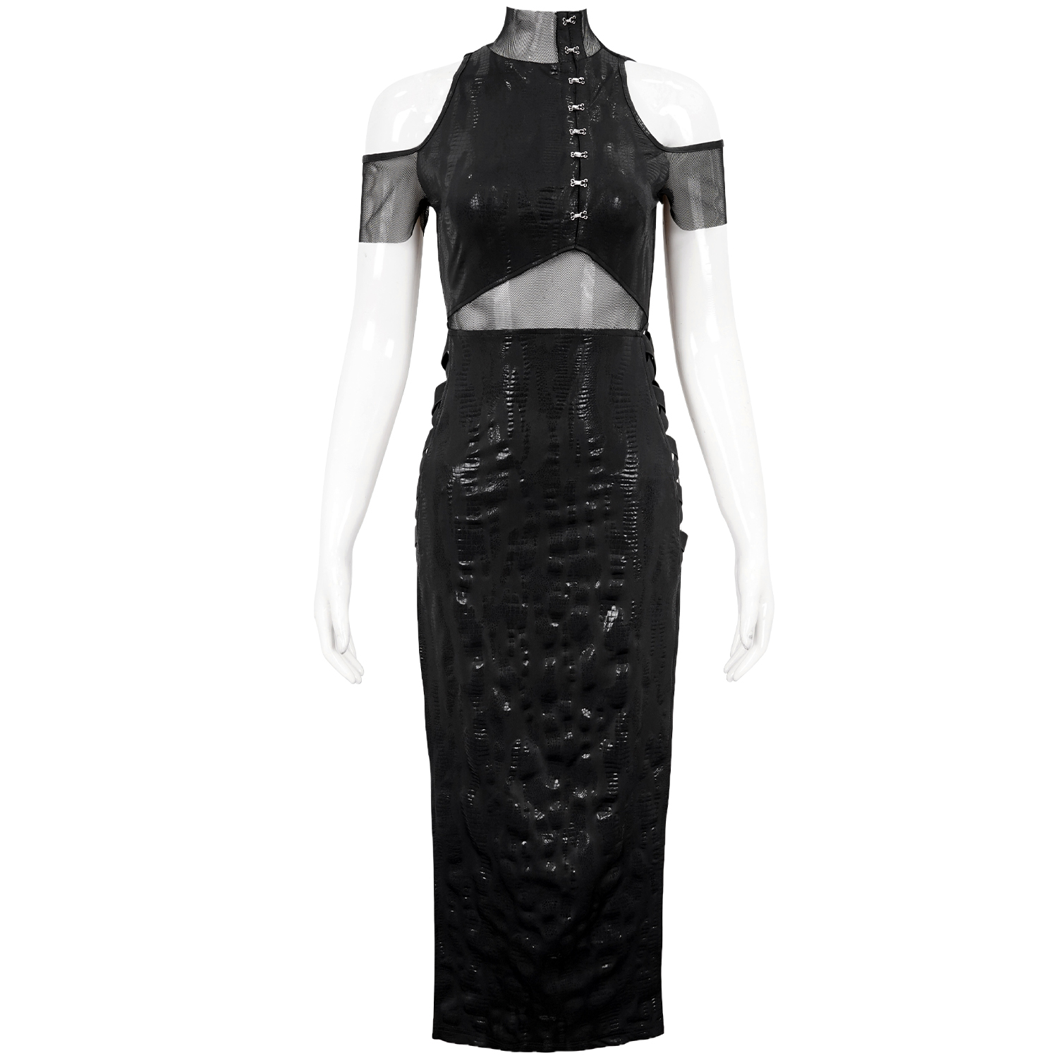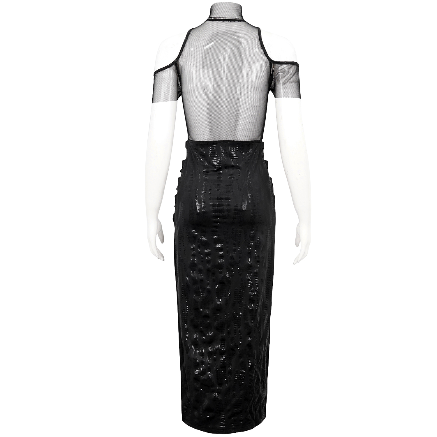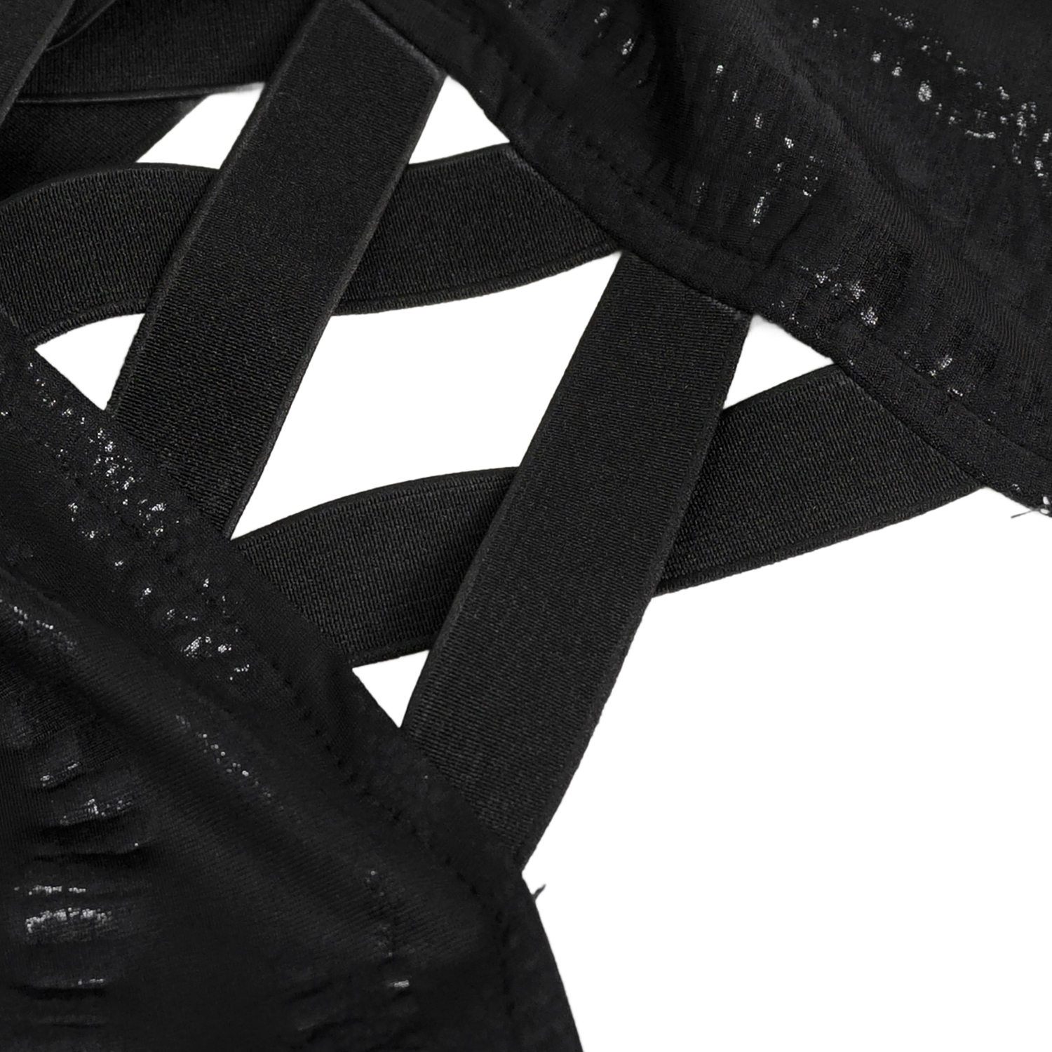 • In black, stretchy, three-dimensional wavy and slightly transparent fabric • Adjustable elastic straps, crossed, connected to the dress by two rings on the front and back • Partially laced side...