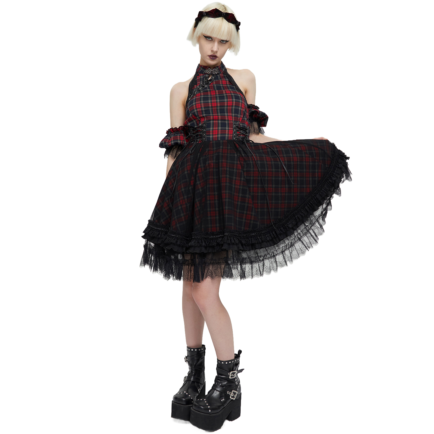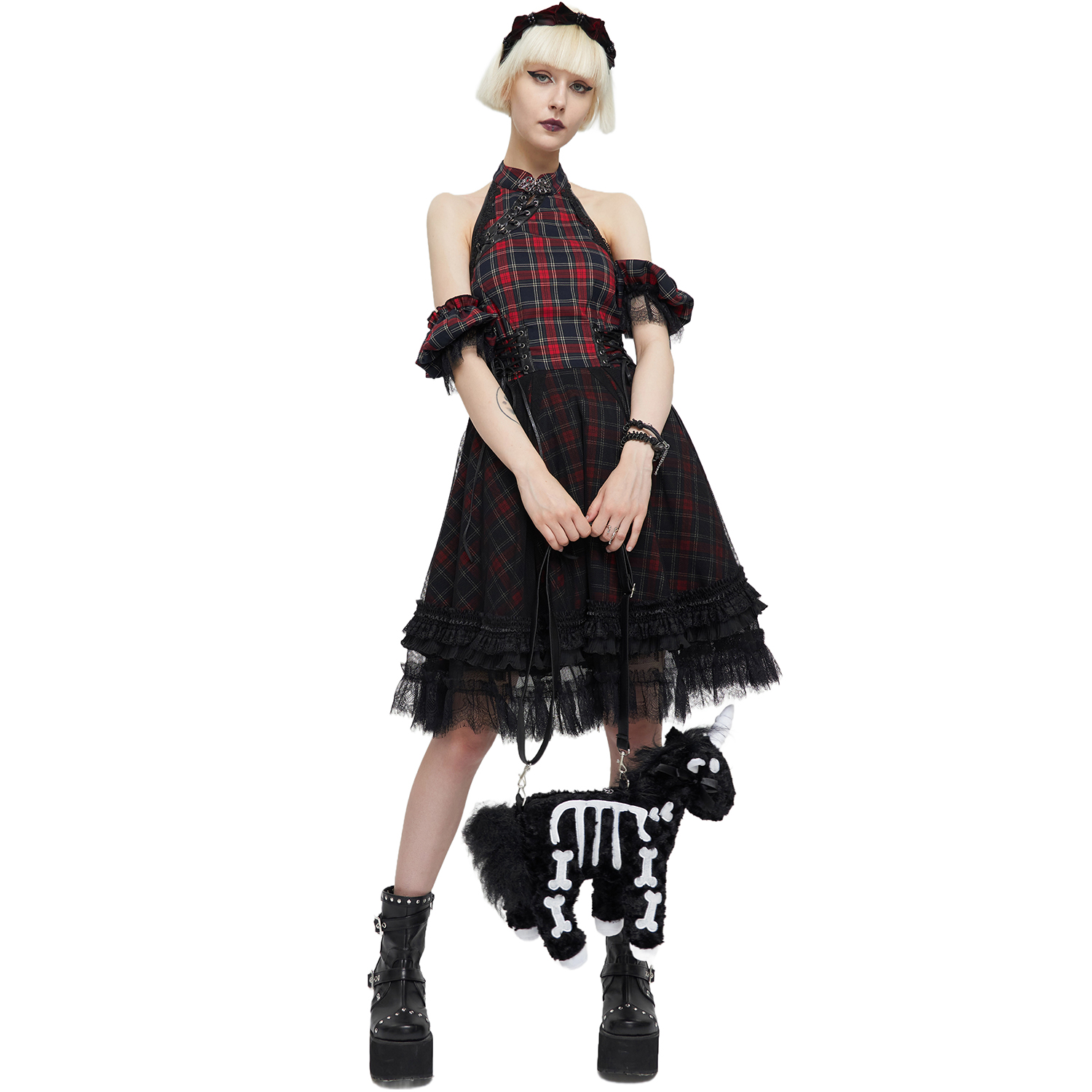 • Romantic gothic red velvet mini dress • Two rows of decorative chains across the chest • Adorned with delicate lace and silver chains • Three-dimensional floral hem • Adjustable straps •...