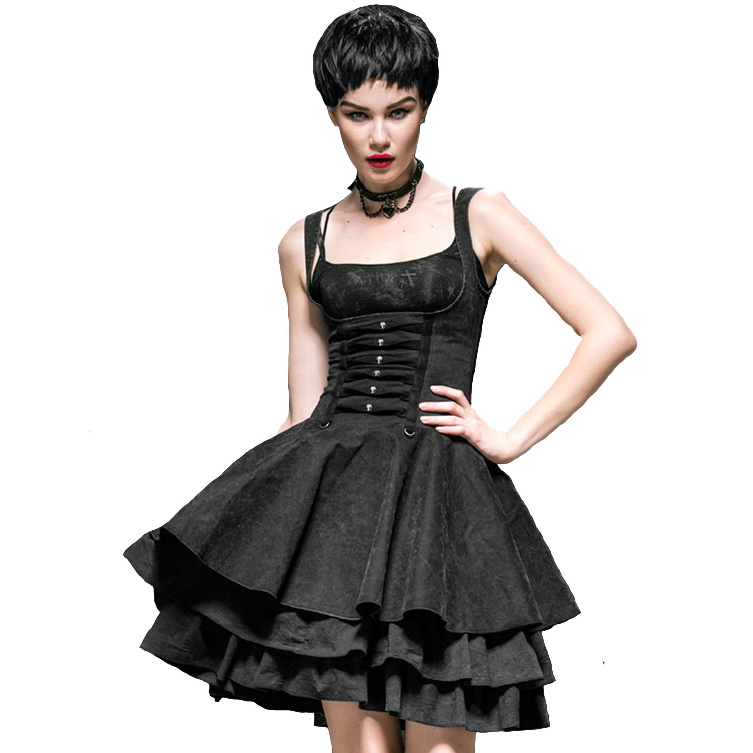• Silver skull buttons at the front imitate the buttoned corsage.