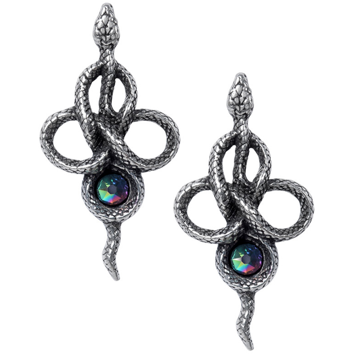 • A pair of delicate, pewter, knotted serpent ear-studs which suspend from the surgical steel ear post in the snake's head.