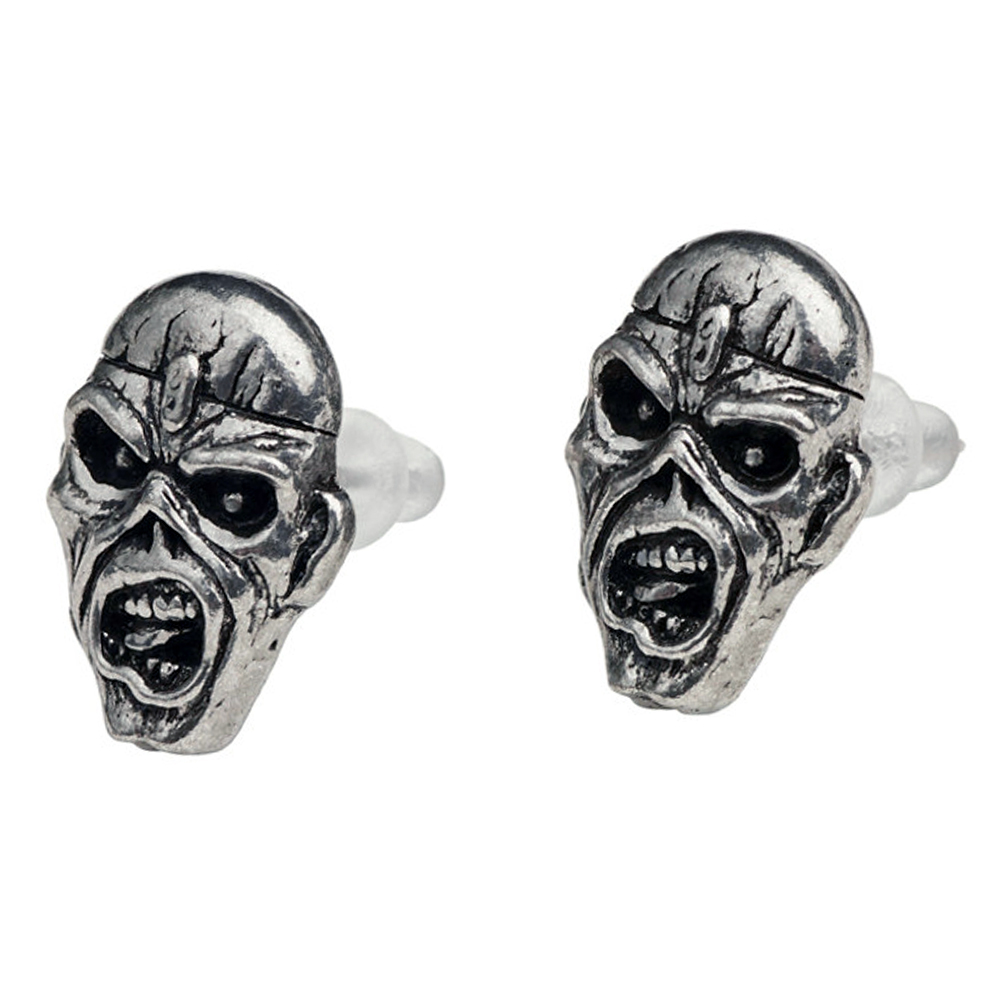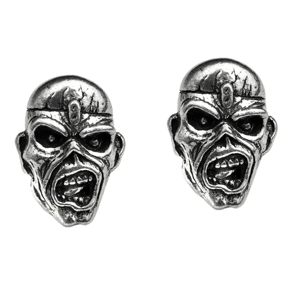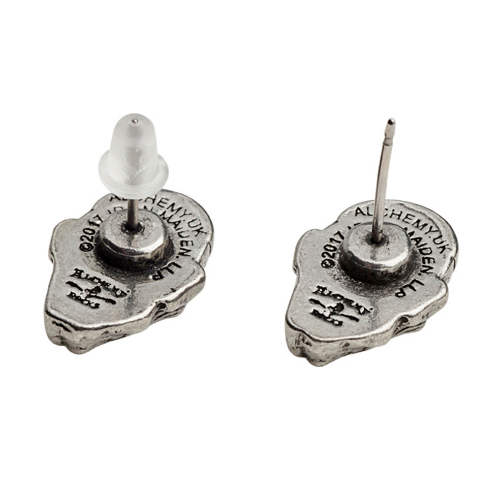 • A pair of 3D sculpted ear studs based on the restrained Eddie's head; English pewter earrings.