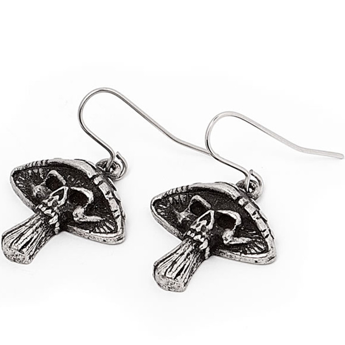 • Handcrafted in fine pewter, they mirror the natural form of a toadstool with a sinister skull motif, suspended from stainless steel hypoallergenic ear-wires for comfortable everyday wear.