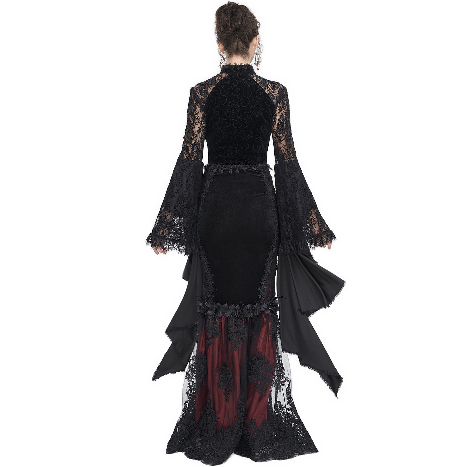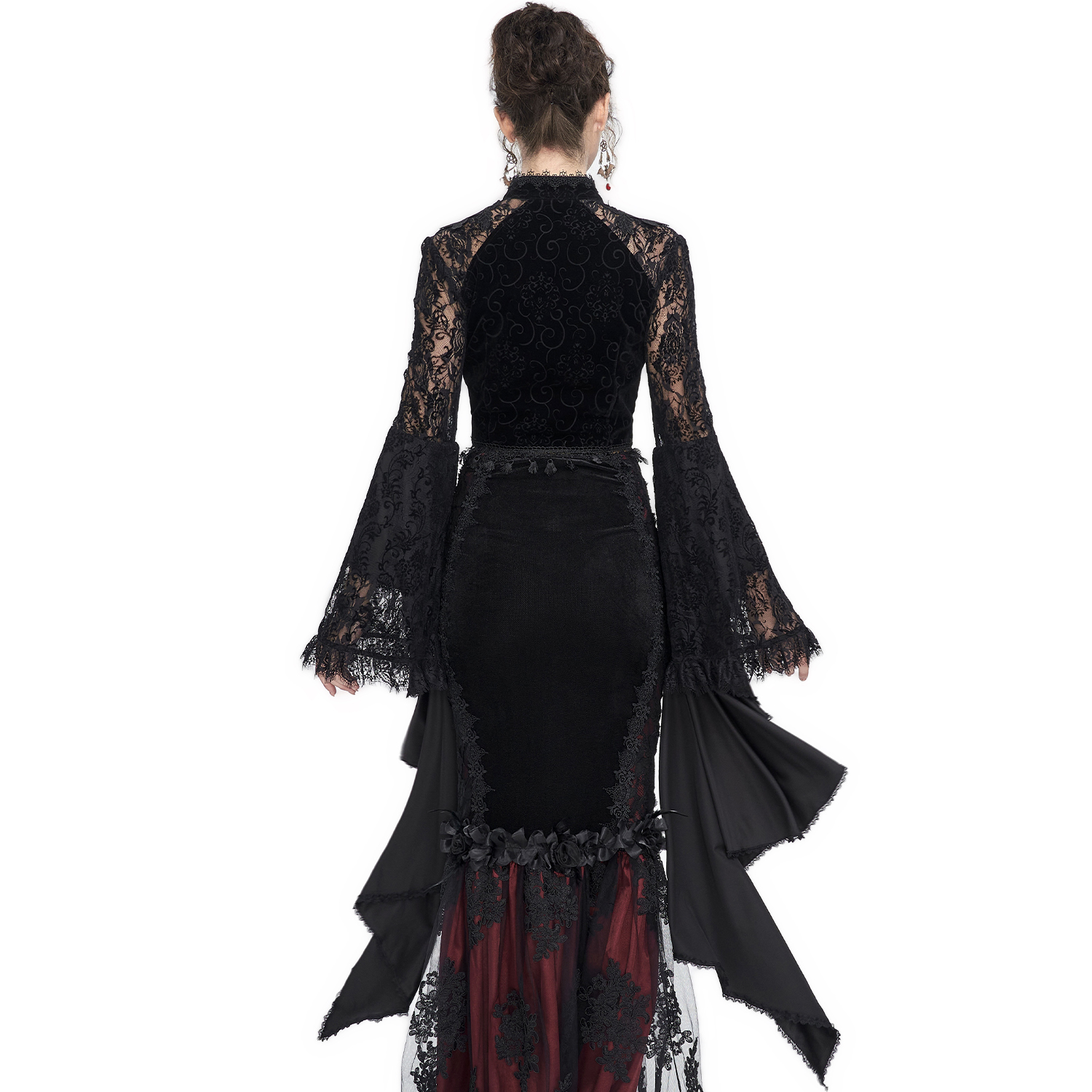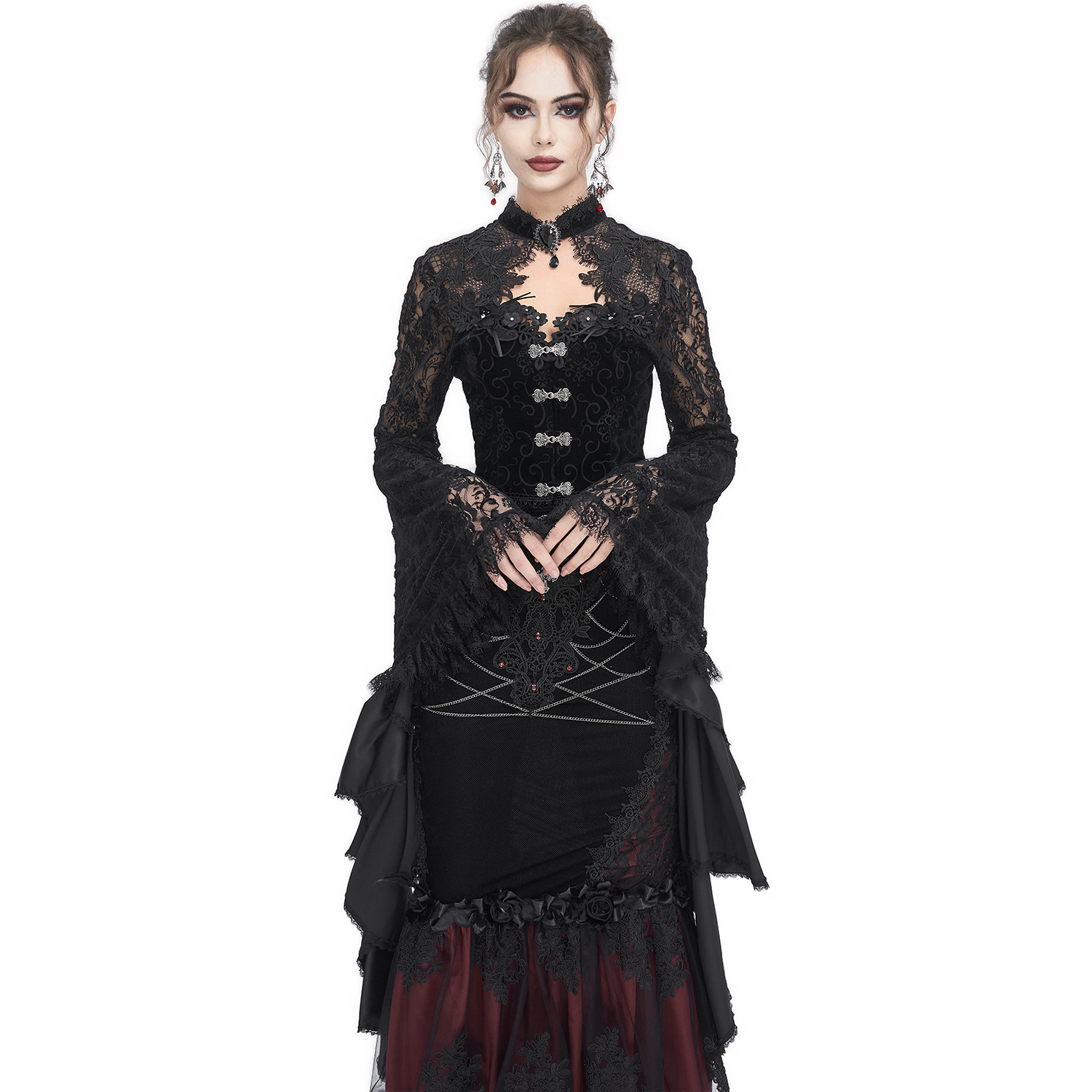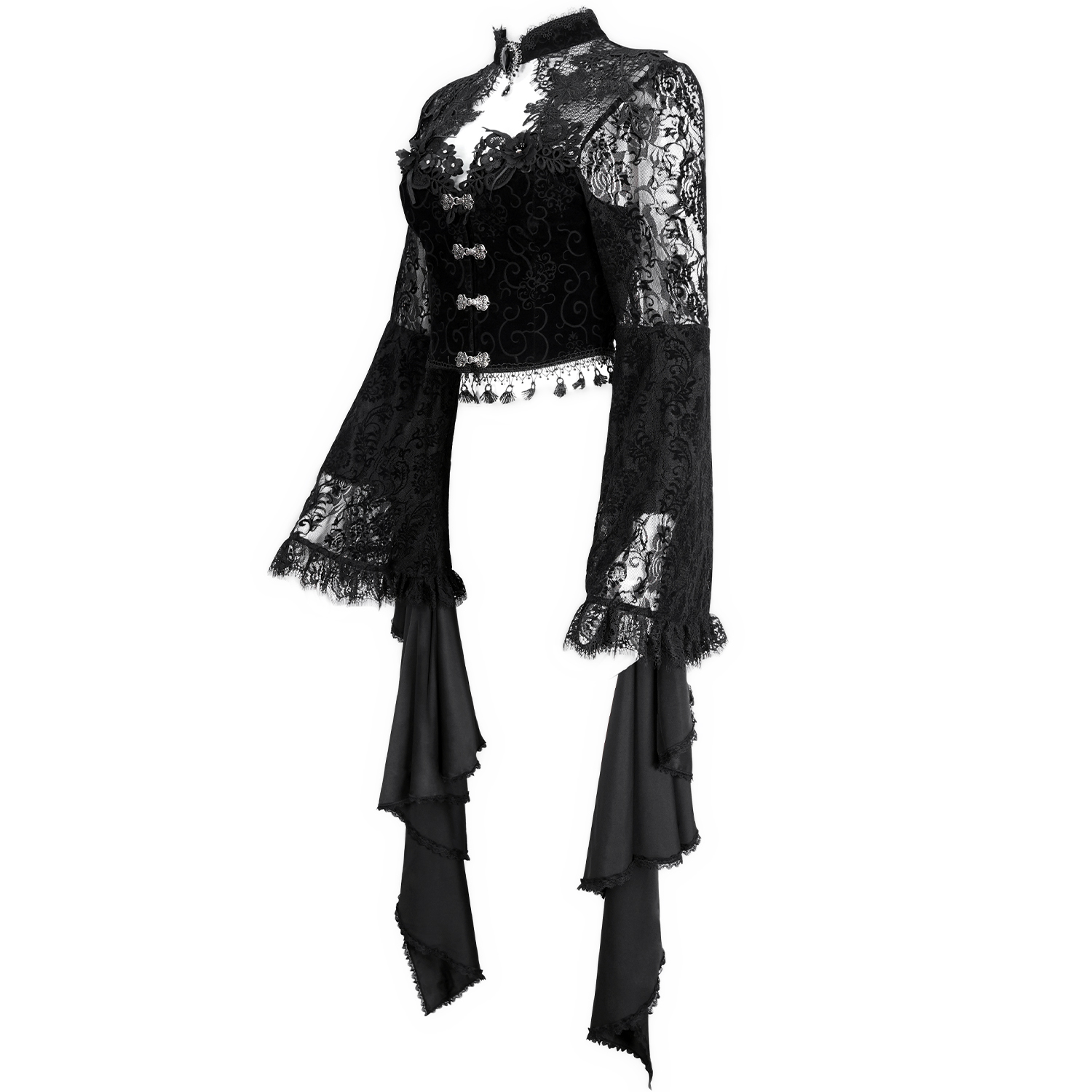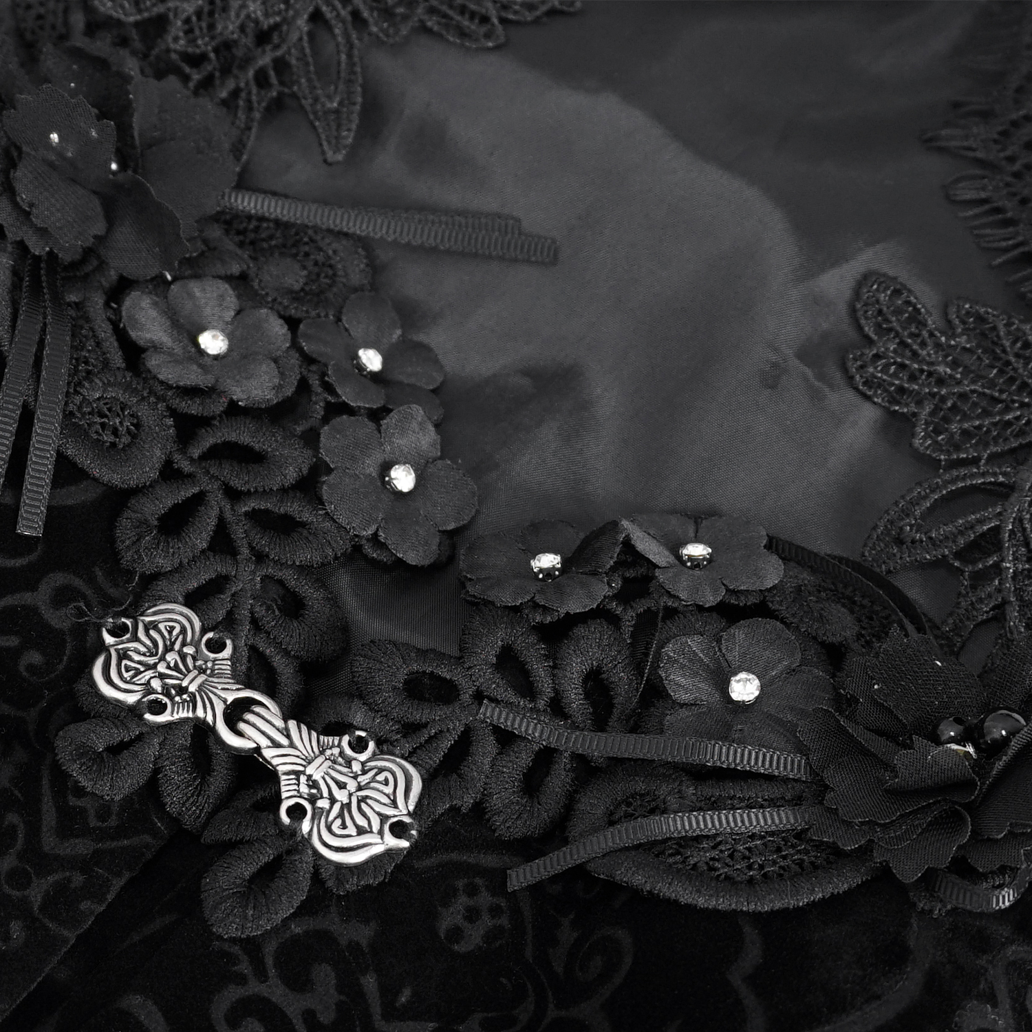 • Luxurious black velvet • Made of multiple layers of lace and composite fabrics • Open front design • High collar adorned with two black gemstones in the center • Double-layer lace ruffled...
