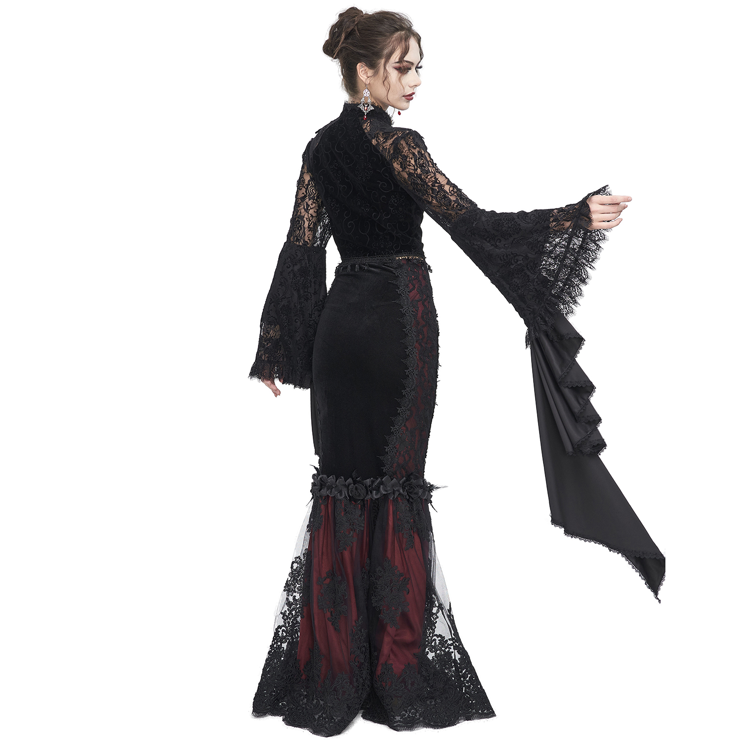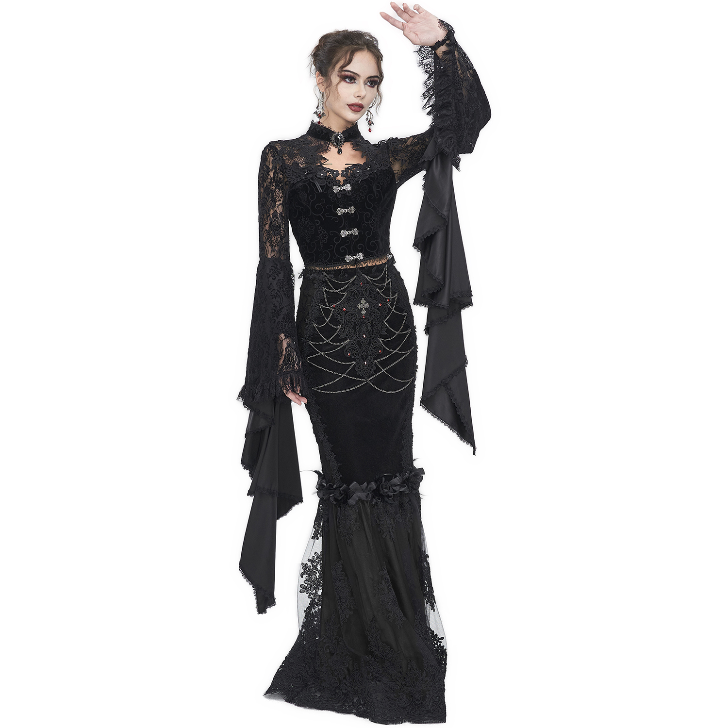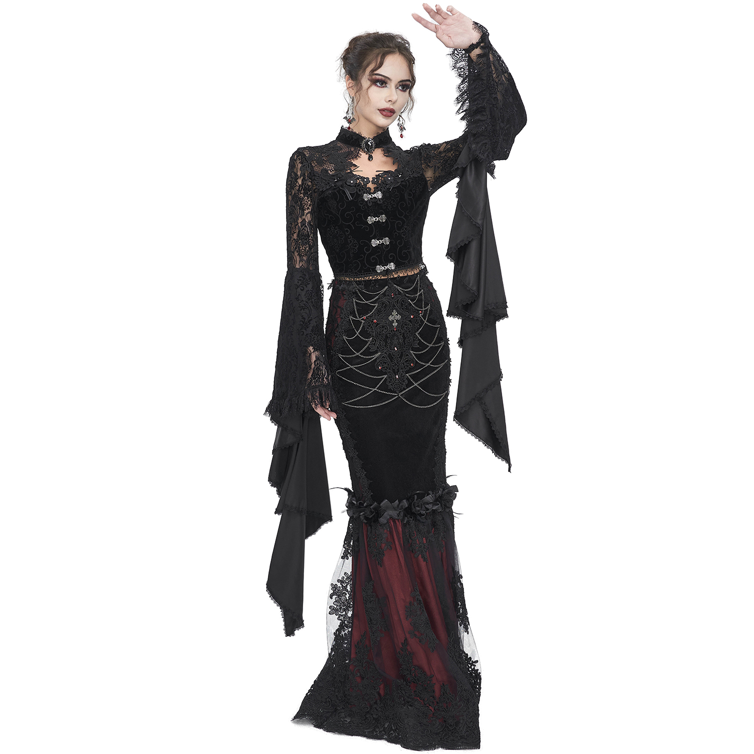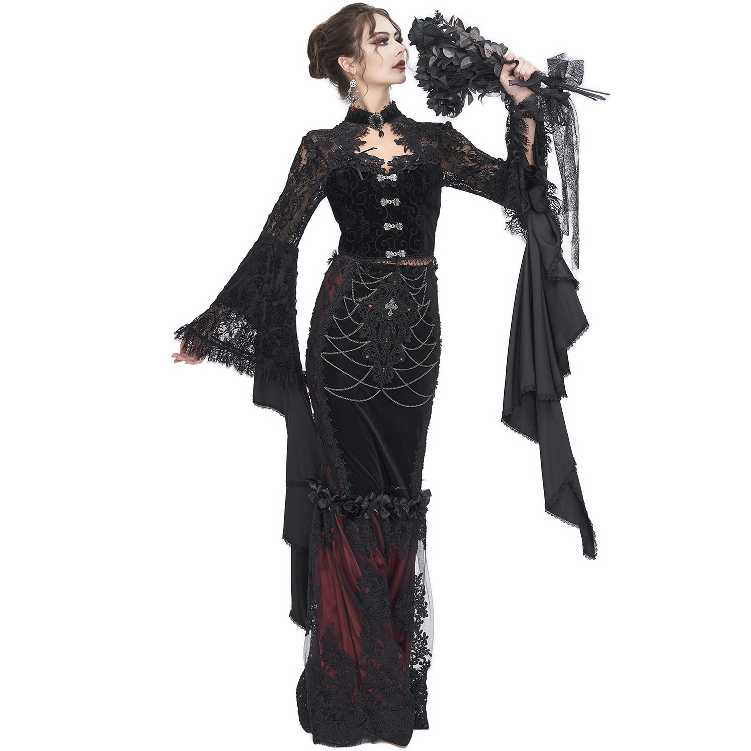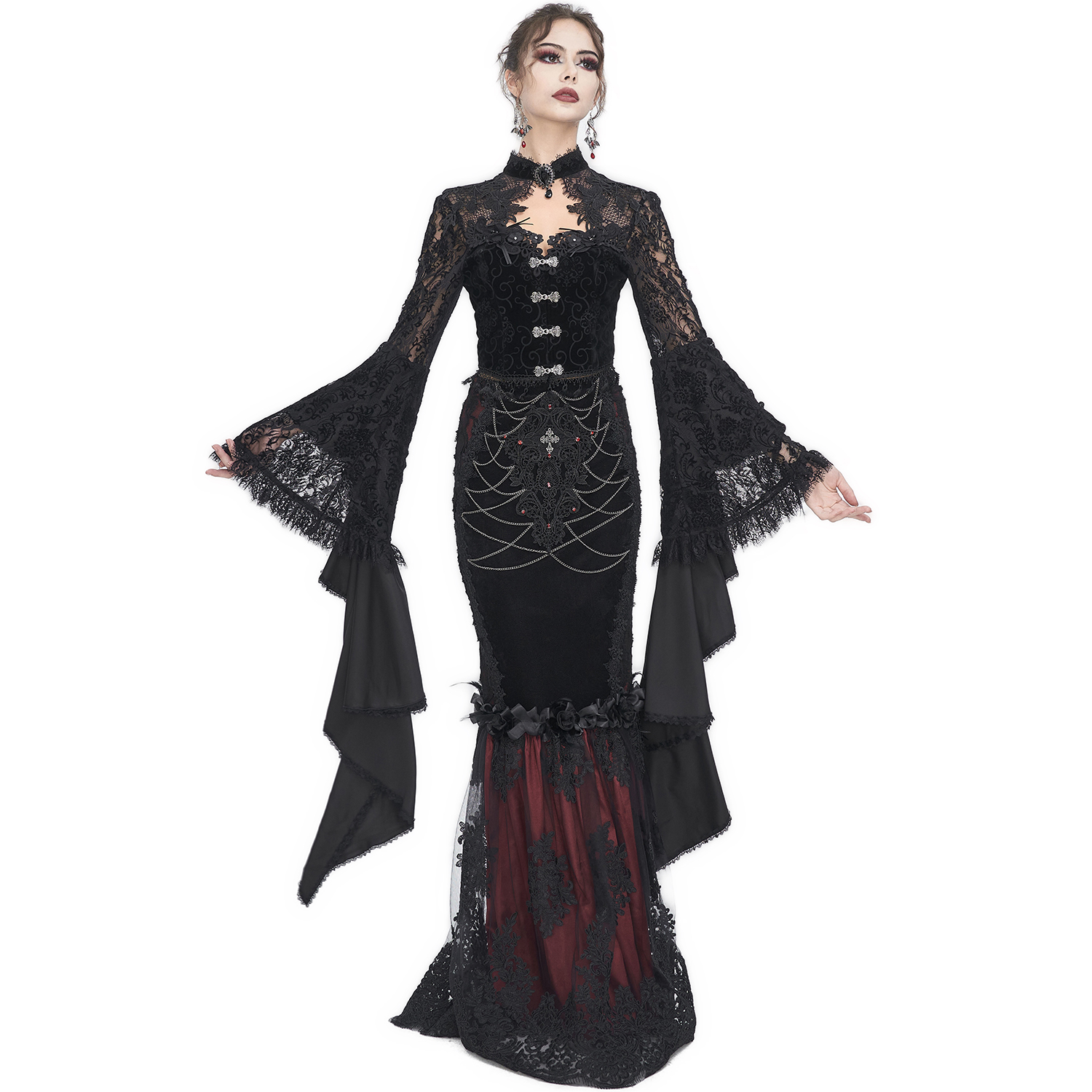 • Luxurious black velvet • Made of multiple layers of lace and composite fabrics • Open front design • High collar adorned with two black gemstones in the center • Double-layer lace ruffled...
