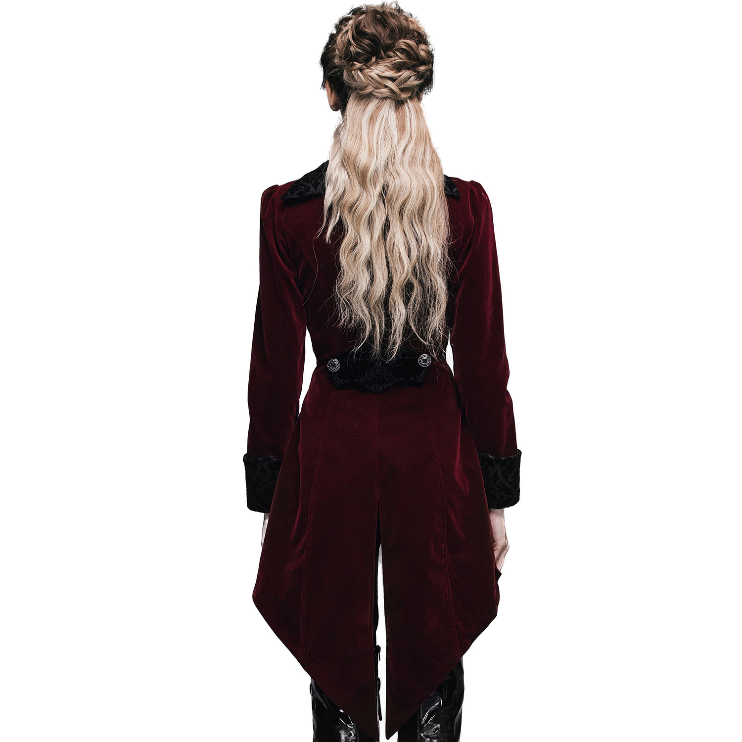 Gothic female's red jacket decorated with synthetic vegan leather details, mesh fabric, zippers, and studded eyelets. • Black mixed fabric jacket • The main fabric looks like aged leather • The...