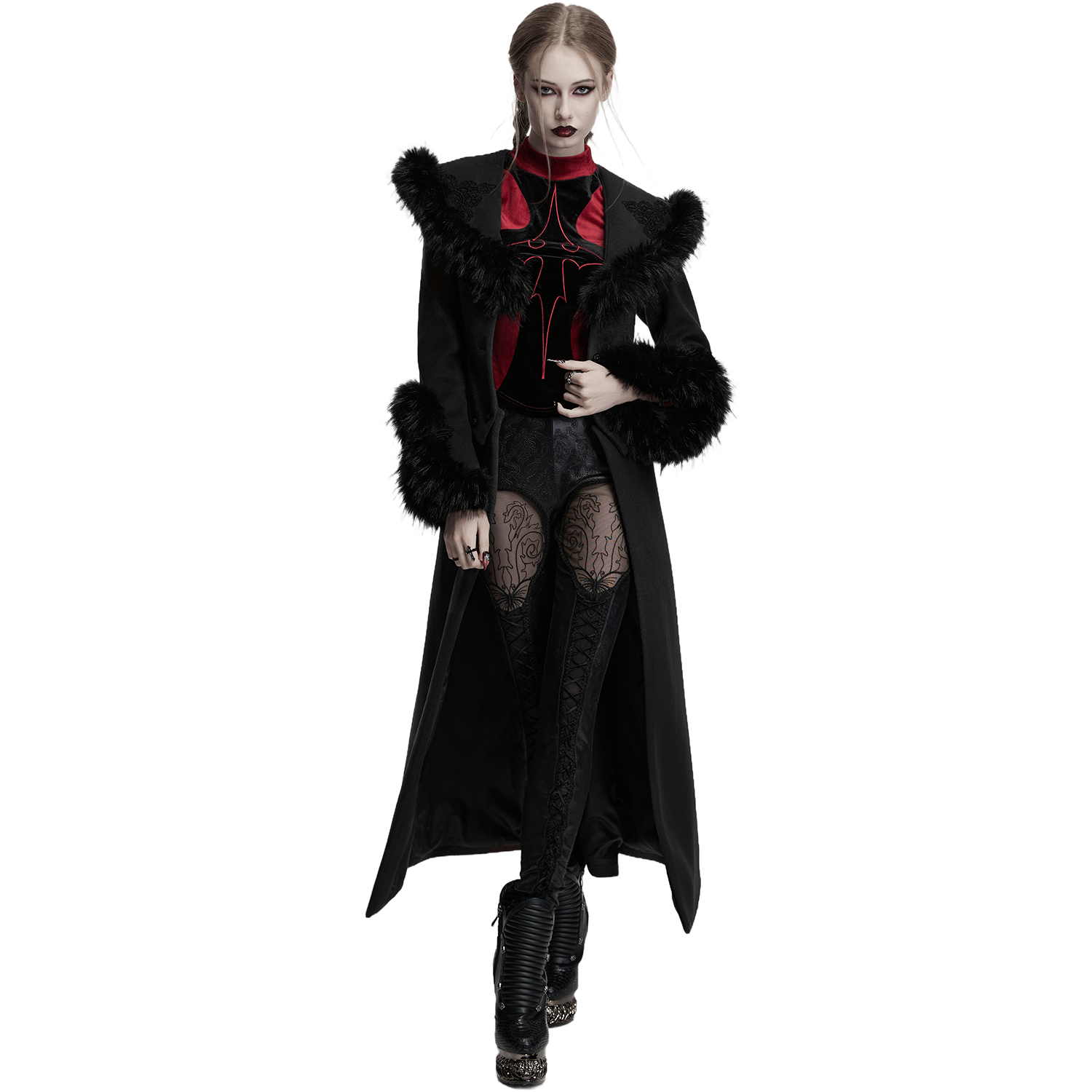 Winter coat for women in Gothic Lolita style. • In black velvet, soft and luxurious • Synthetic fur trim • Adjusted to the knees with pointed hems • Fixed velvet shoulder cape / pelerine •...