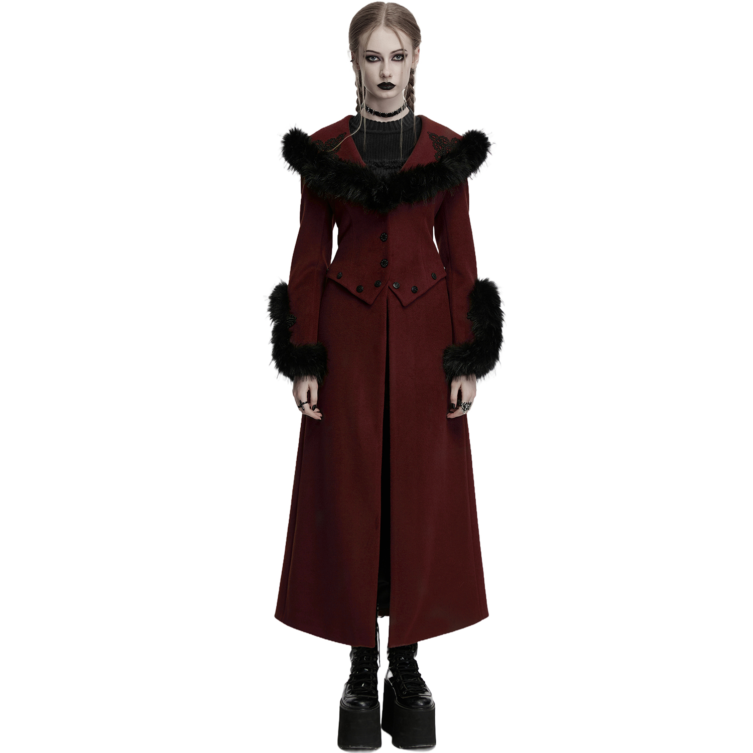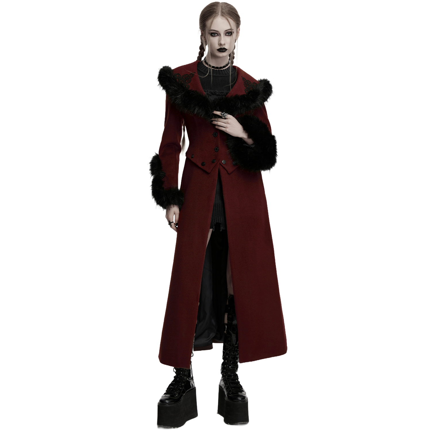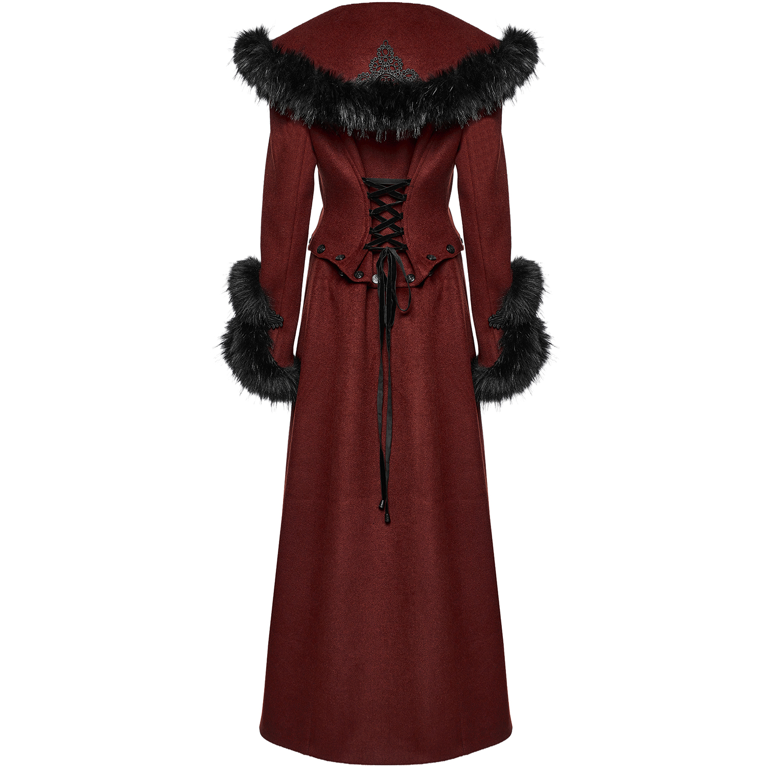 Long romantic gothic style coat • Made from thick, comfortable combed fabric • Lining made of cashmere and cotton particles • Hood and cuffs lined with soft black artificial fur • Decoration of a...