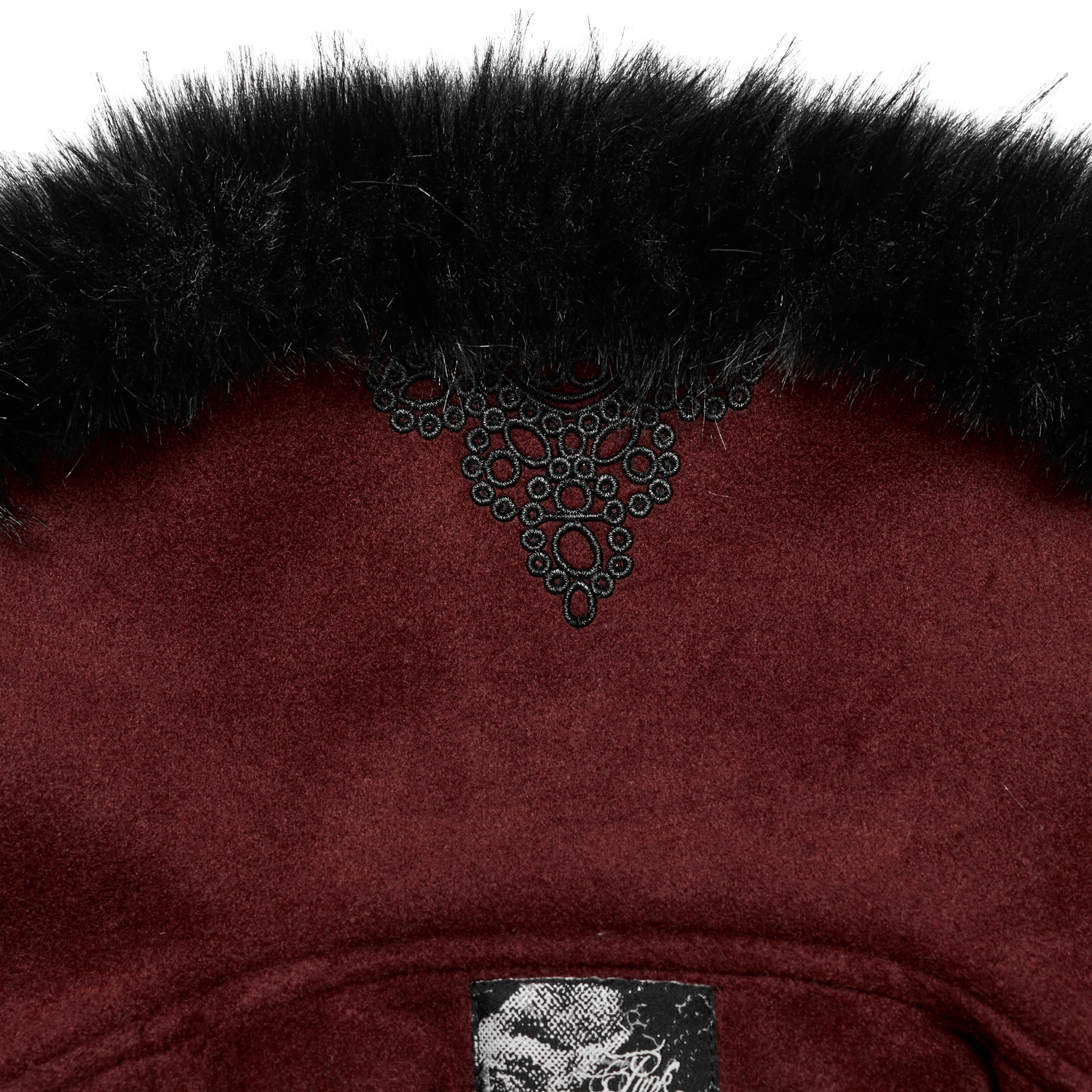• Red jacquard with black velvet stitching • Faux leather strips sewn between the two materials and at the ends of the shoulders • Delicate burgundy gothic patterns embroidered on the neckline,...