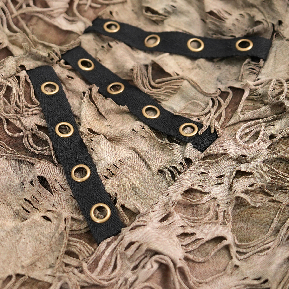 • Made of stretch fabric with a distressed and ripped effect • Upper section adorned with faux leather straps and eyelets • Removable safety pins and chain • Zip closure with a metal button...