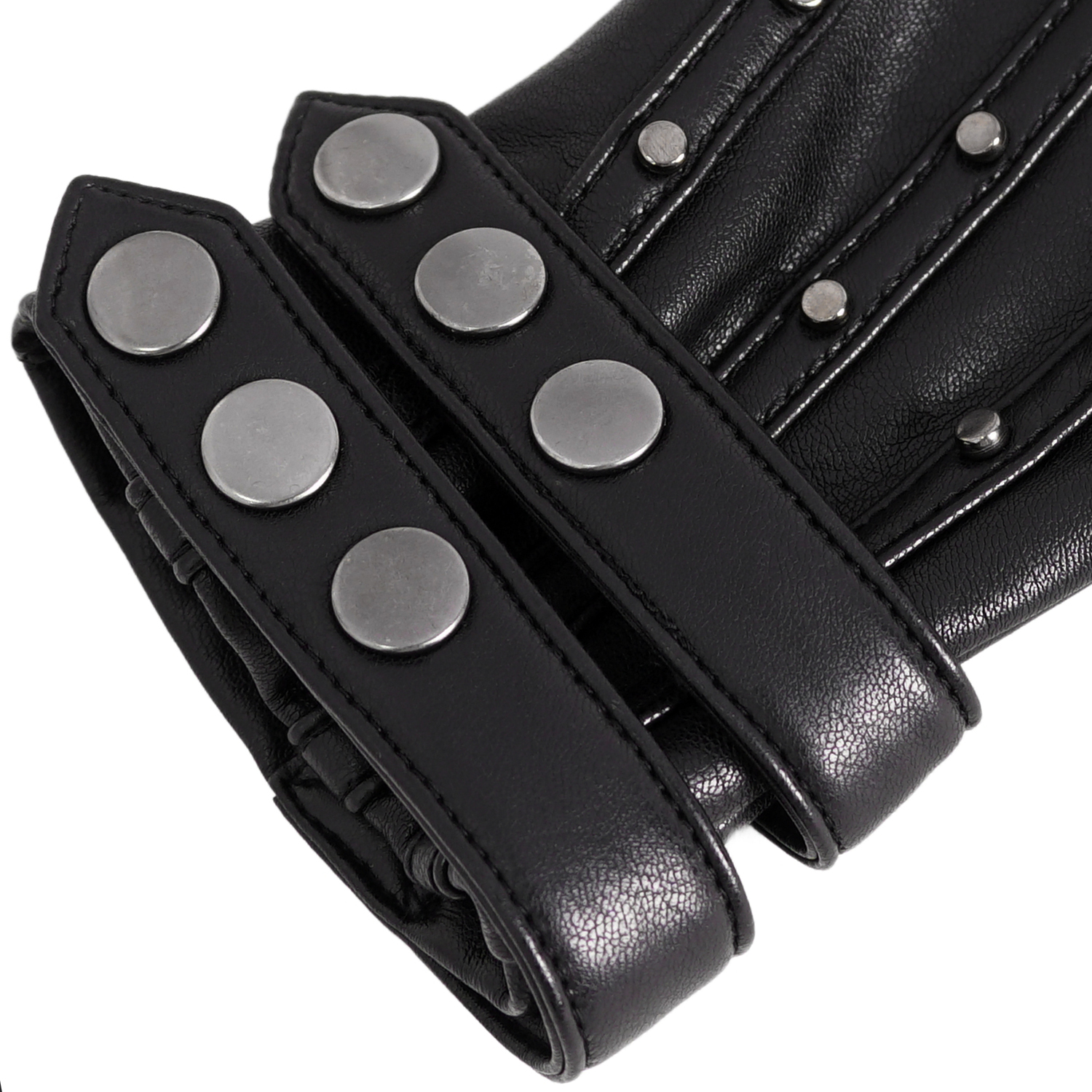 Gothic Industrial men's black leather imitation fingerless gloves with synthetic leather buckled straps and dark spikes. • Closed-end metal zipper closure on the forearm. • 100% Vegan synthetic...