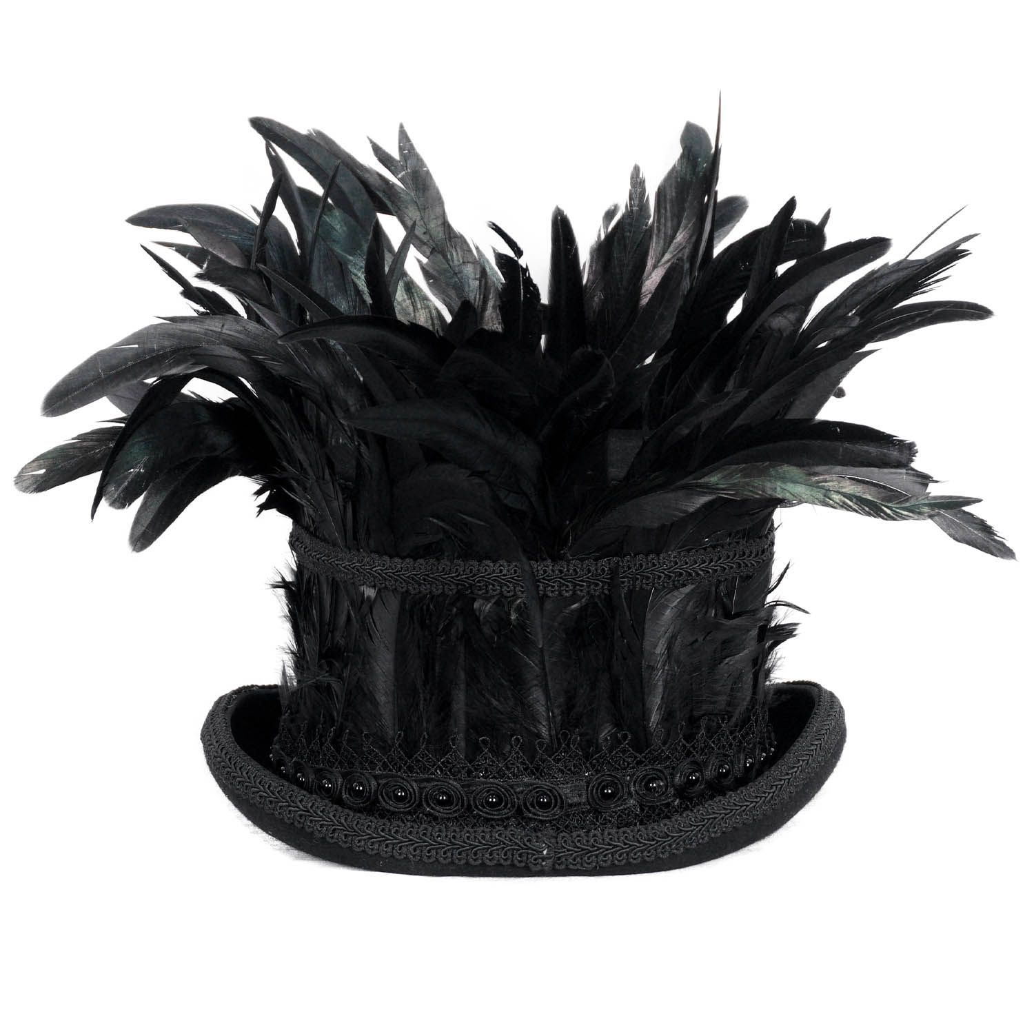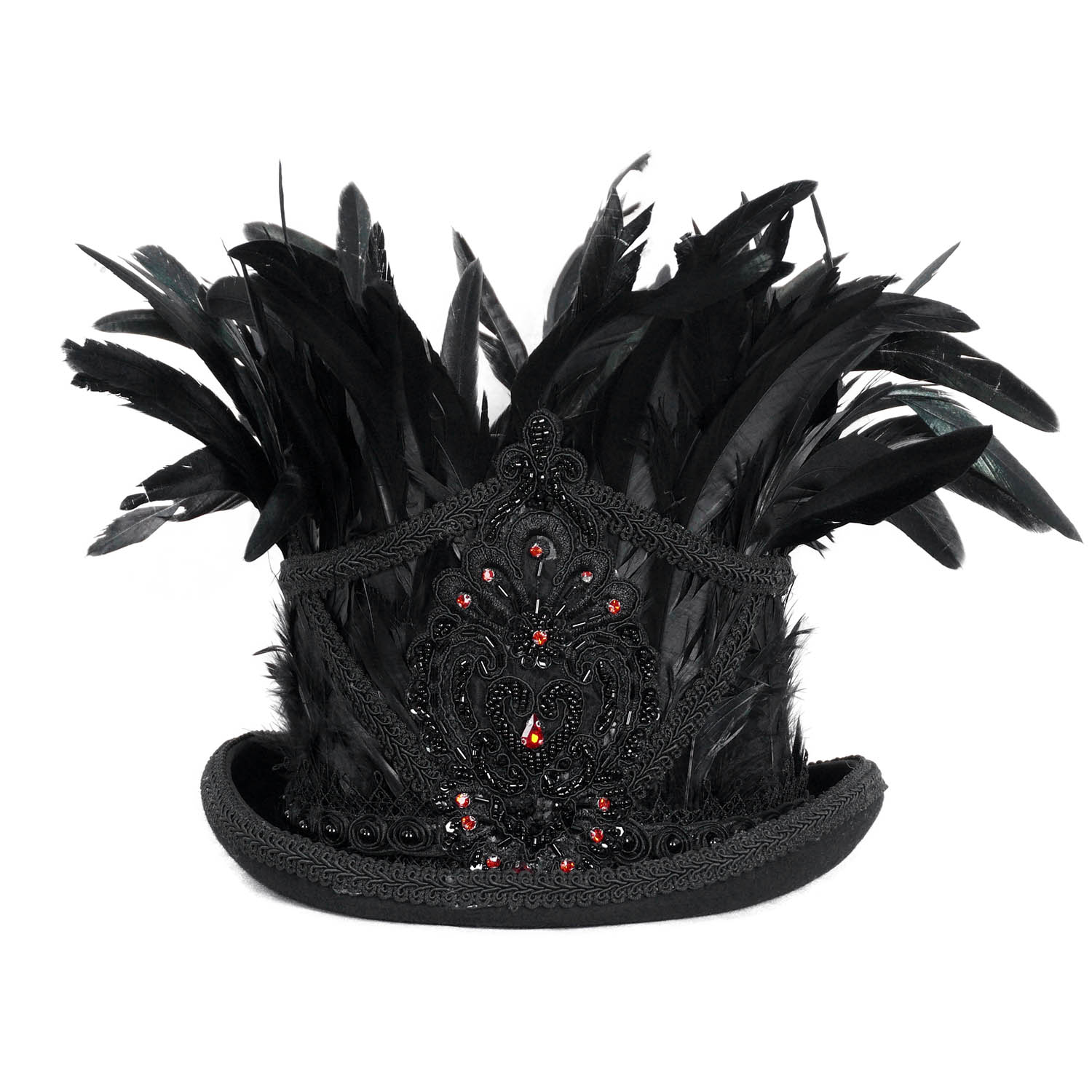 • Black felted wool top hat • Lace ribbon adorned with a variety of red glass stones • Twisted ribbons on the front and edges of the hat • Large natural feather on the right side • 100% Wool...
