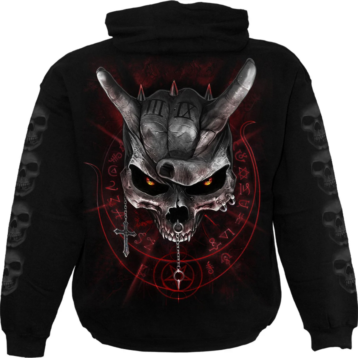 • Biker skeleton riding his flame covered motorbike into the air in true heavy metal fashion. • The back print showing a chained skull & crossed bones with a leather style banner. •...