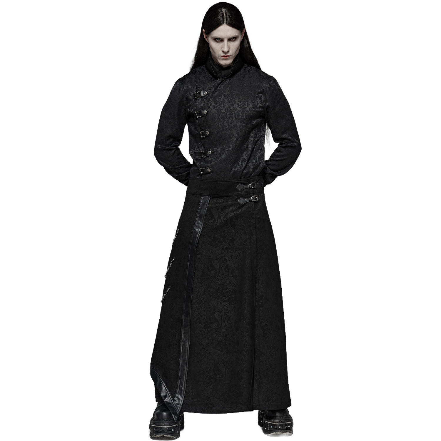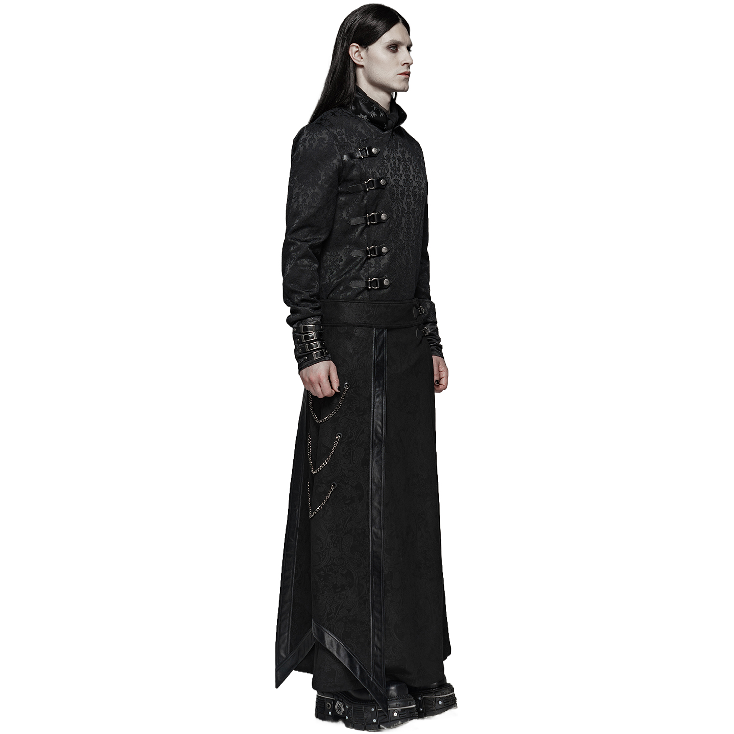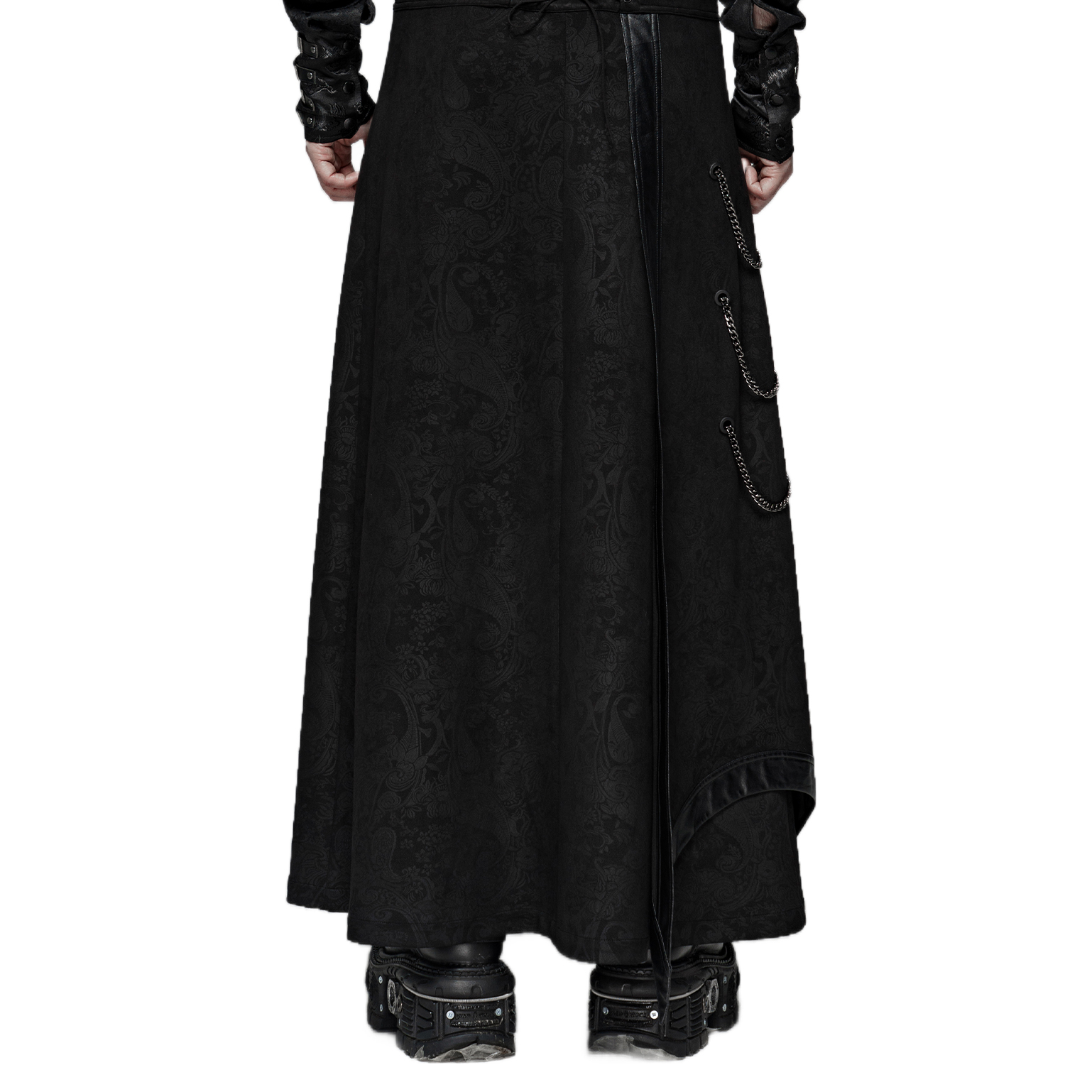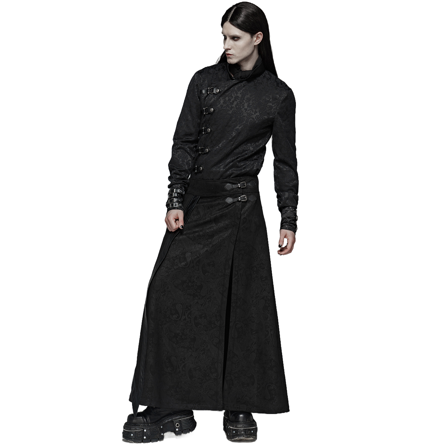 Black Jacquard Fabric 'Asmodey' Long Kilt • Embrigader frontal ornament • Embroidered ribbon trim • Zipper at the left side, lacing at the right side • Adjustable silver embossed buckles at...