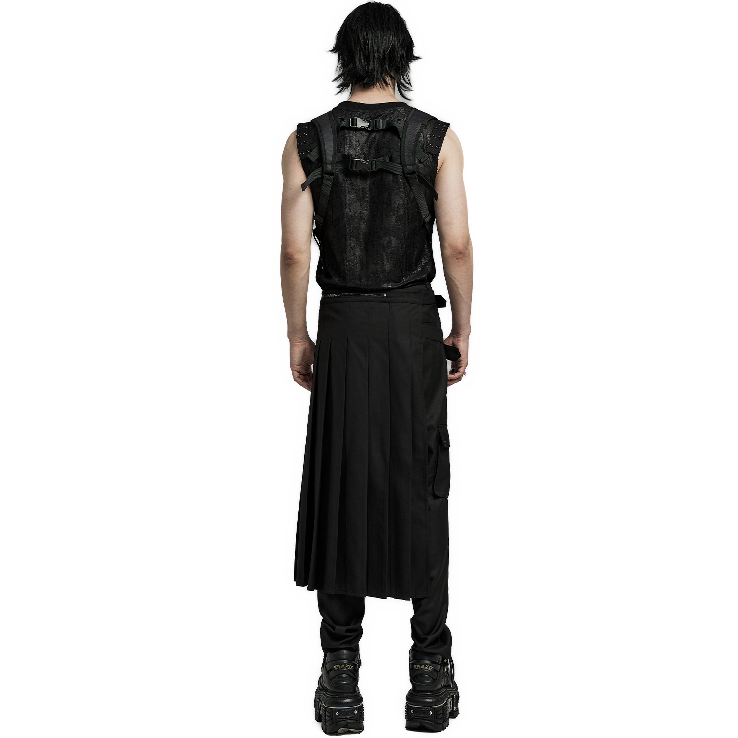 Post apocalyptic style pleated kilt skirt for men • High quality black polyester • Crackle finish • Black grained faux leather panel all around the waist • Zipper on the front • Fixed lacing...