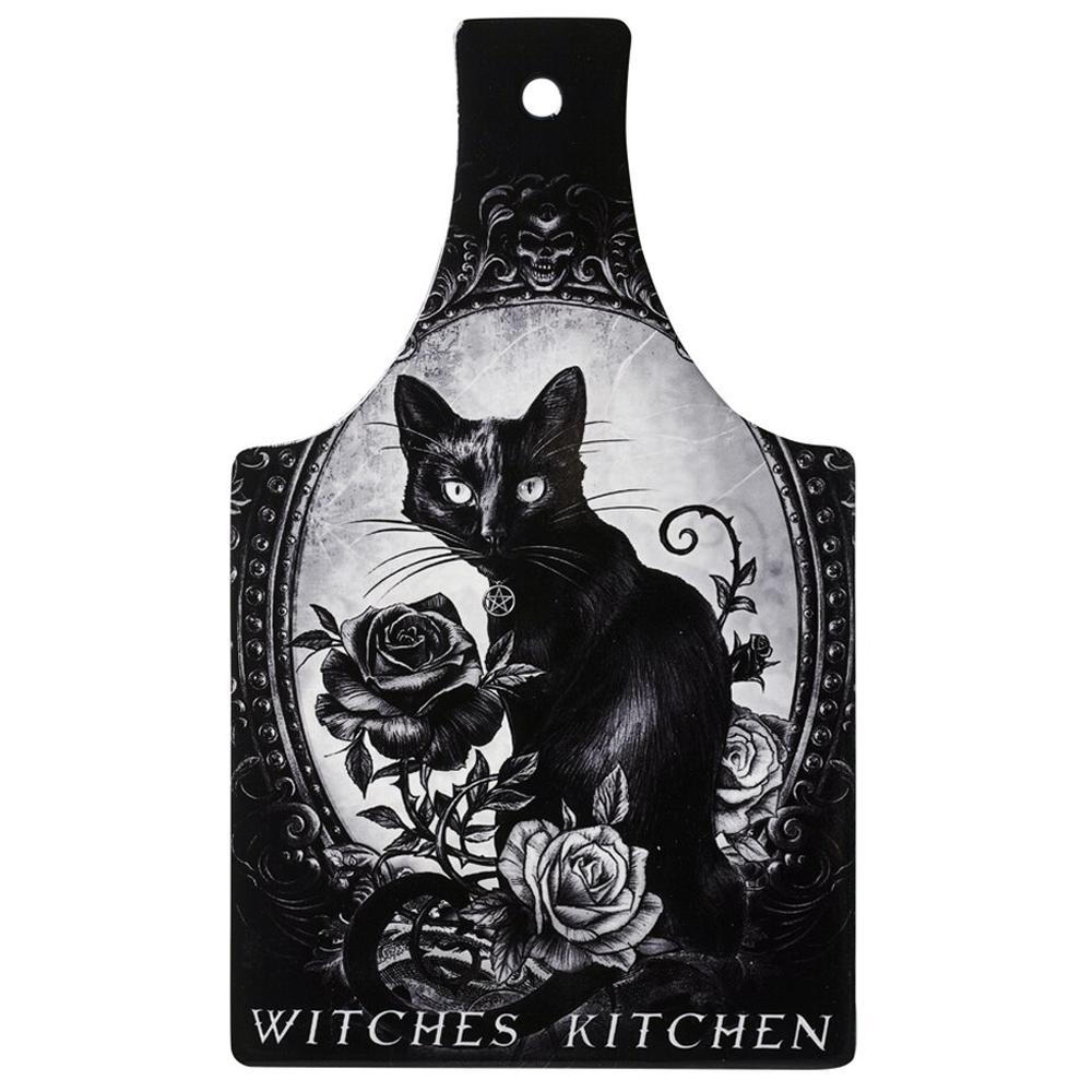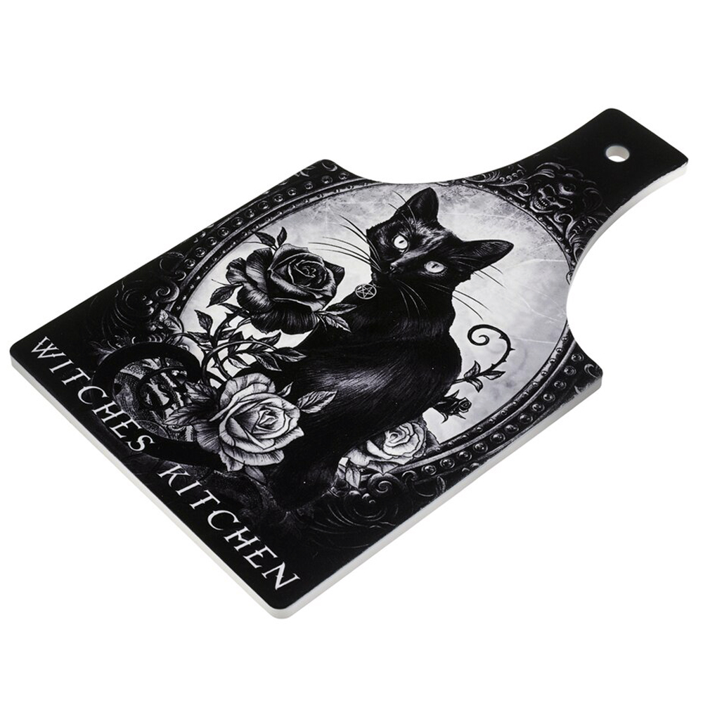 Darkly beautiful Alchemy black cat artwork is presented on this unique 'Witches Kitchen' chopping board / serving trivet. Stand this beautiful piece next to your bubbling cauldron and be the envy of witches for miles around!