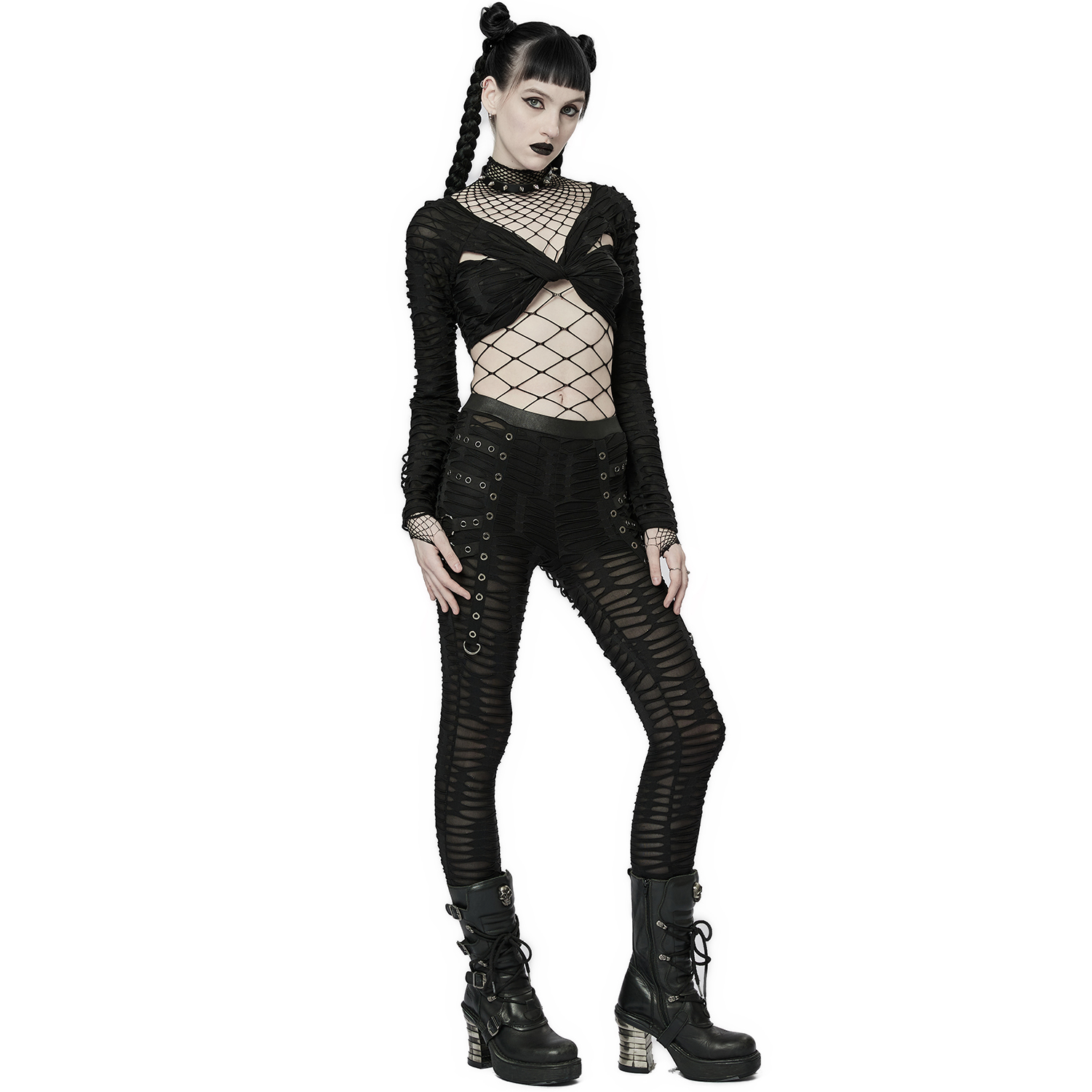 Black stretchy female's gothic leggings with mesh details and spider web decorations at the front. • Made of snakeskin patterned stretchy fabric. • 95% Polyester, 5% Spandex By Punk Rave...