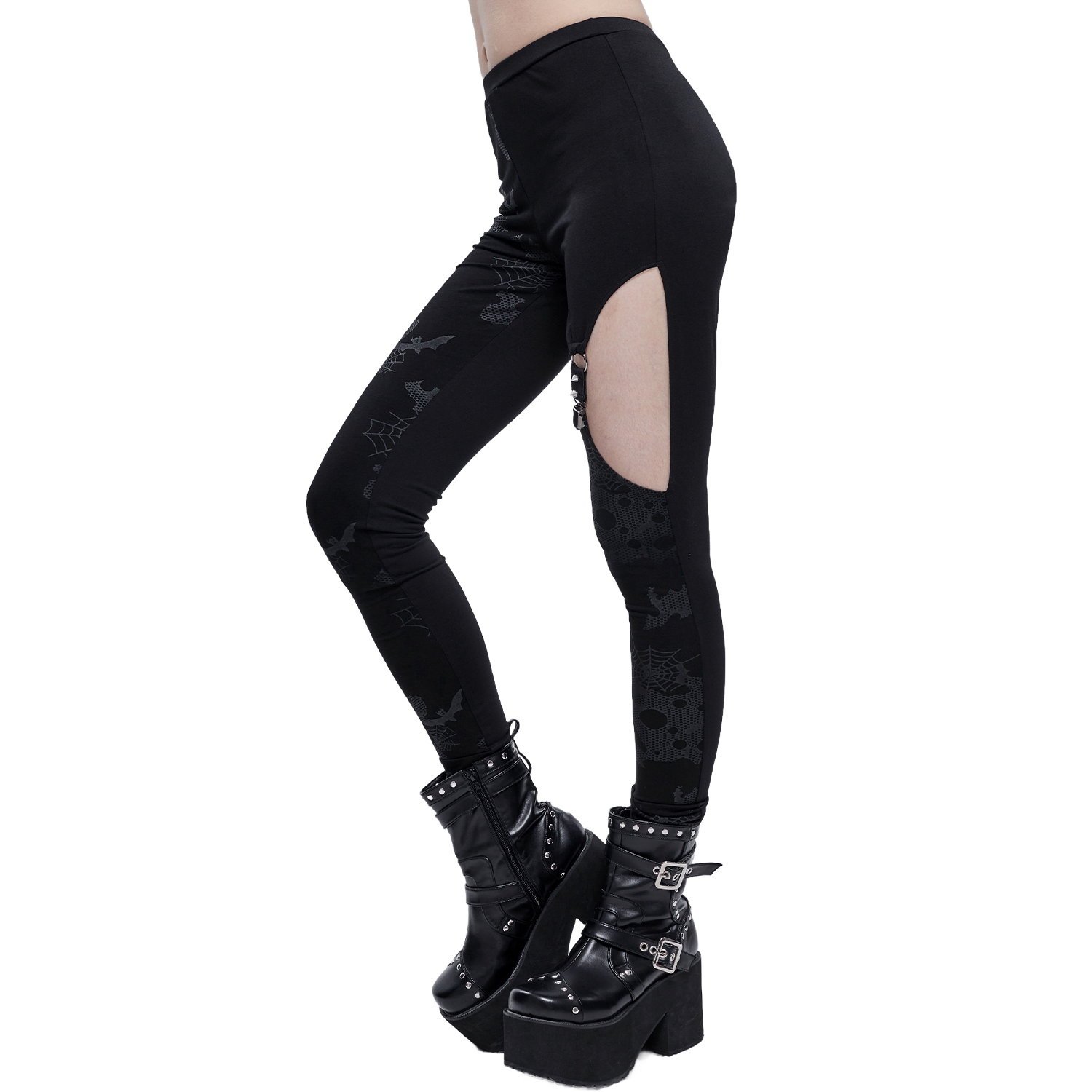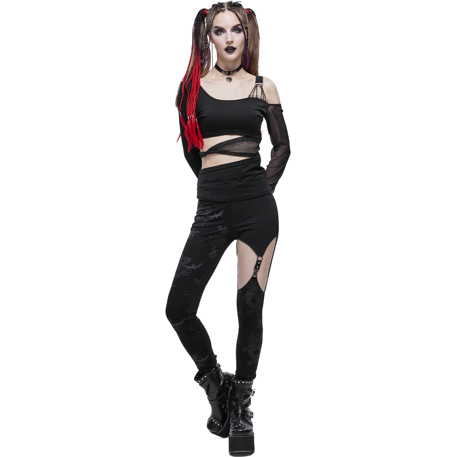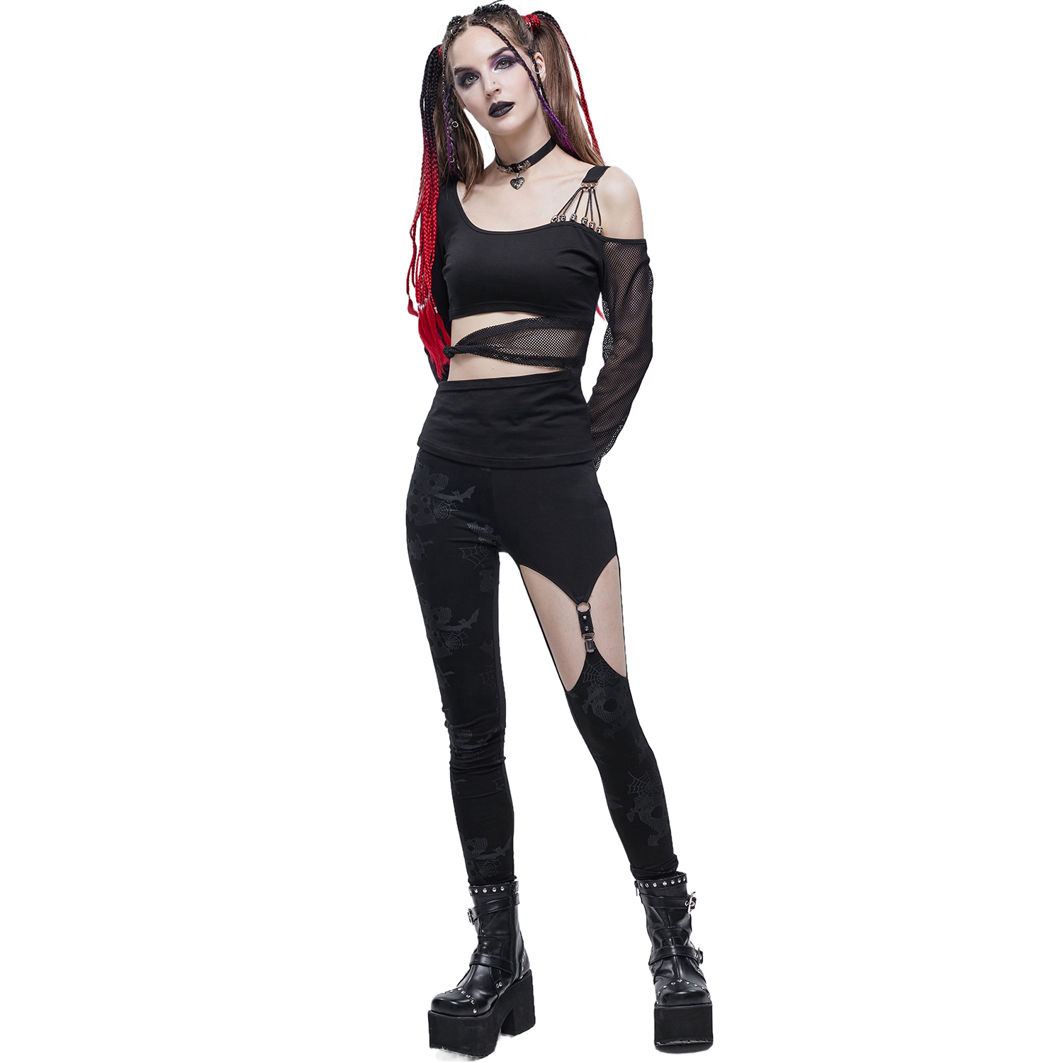 Black stretchy female's gothic leggings with mesh details and spider web decorations at the front. • Made of snakeskin patterned stretchy fabric. • 95% Polyester, 5% Spandex By Punk Rave...