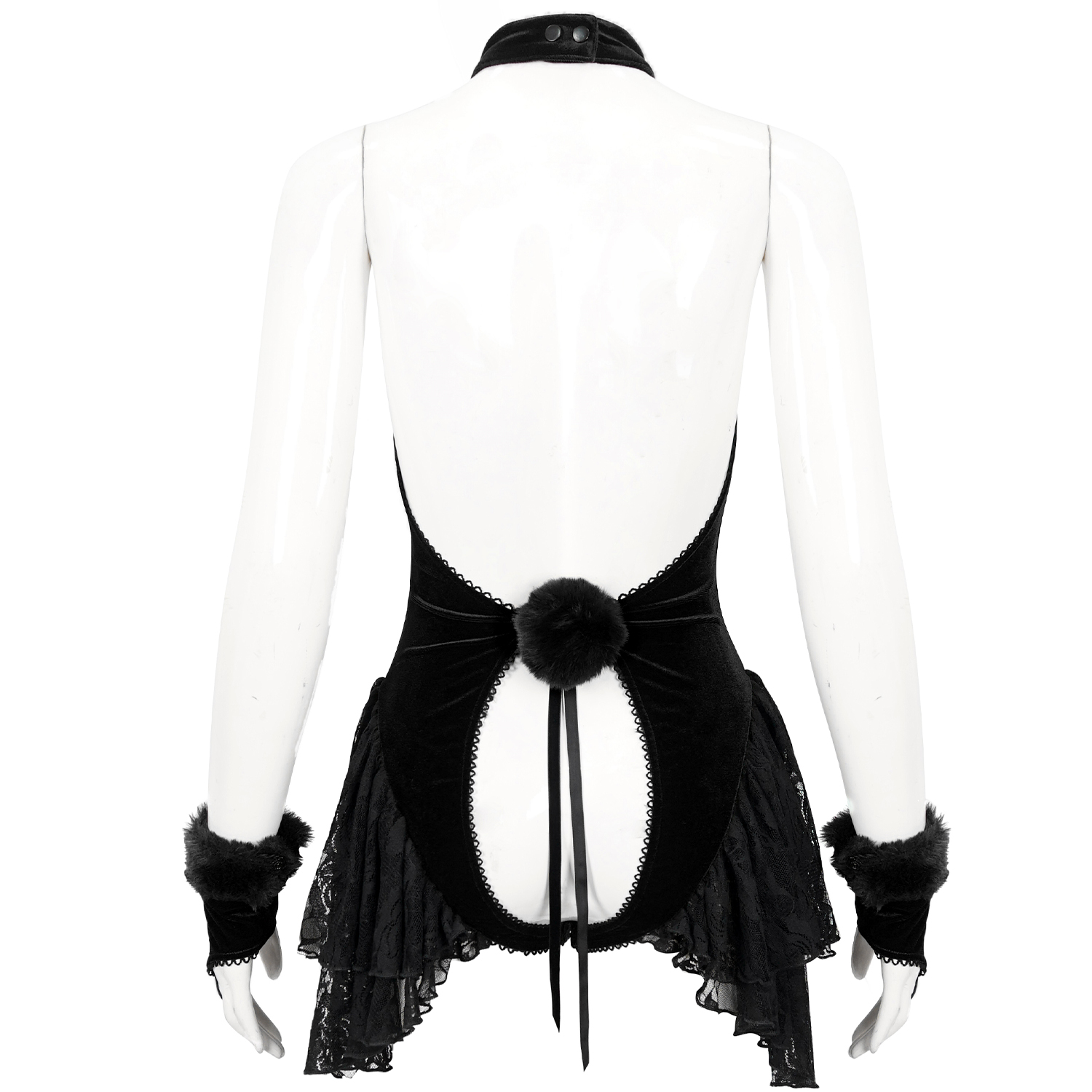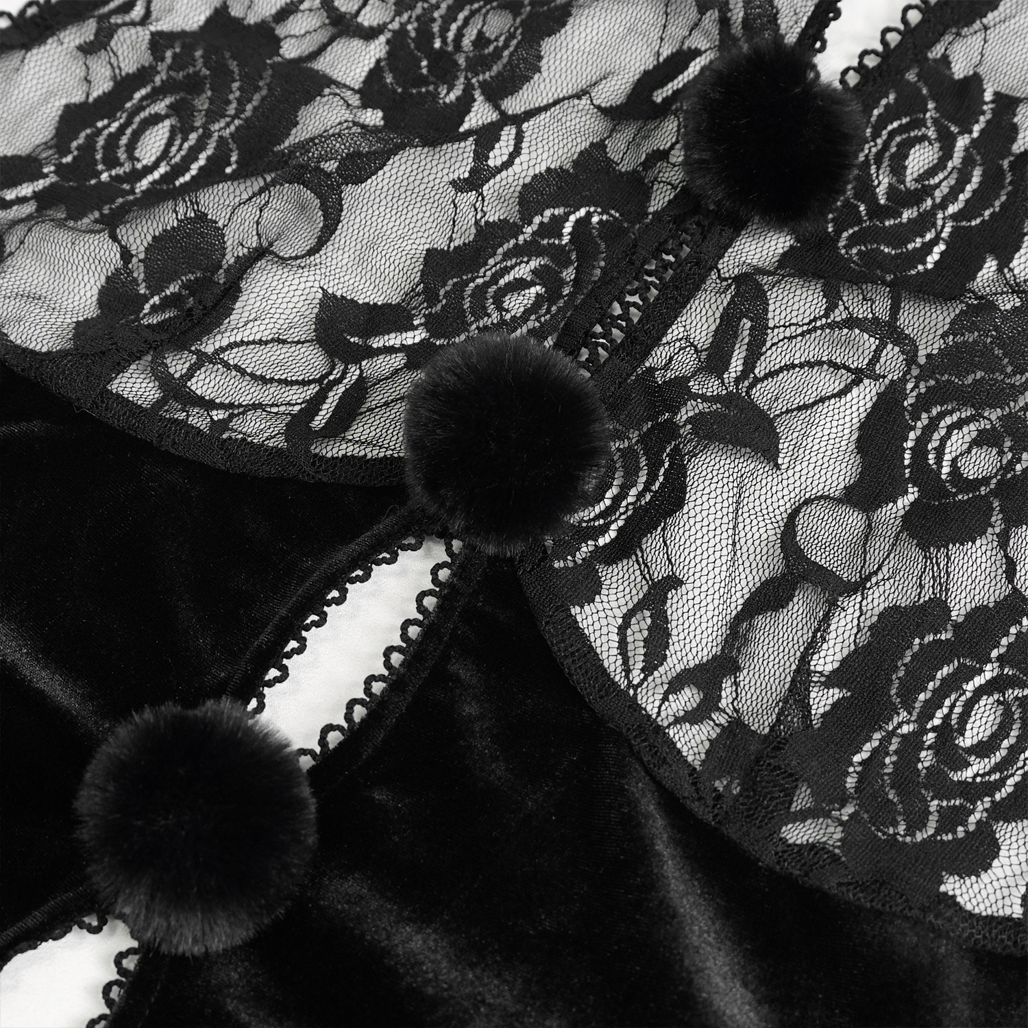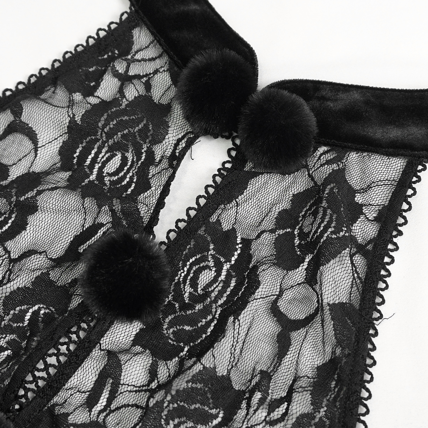 • In black velvet and lace • Decorated with black faux fur pompoms on the front • Collar with press studs • Floral lace on the chest • The crotch can be opened and adjusted • Lace with ruffles on...