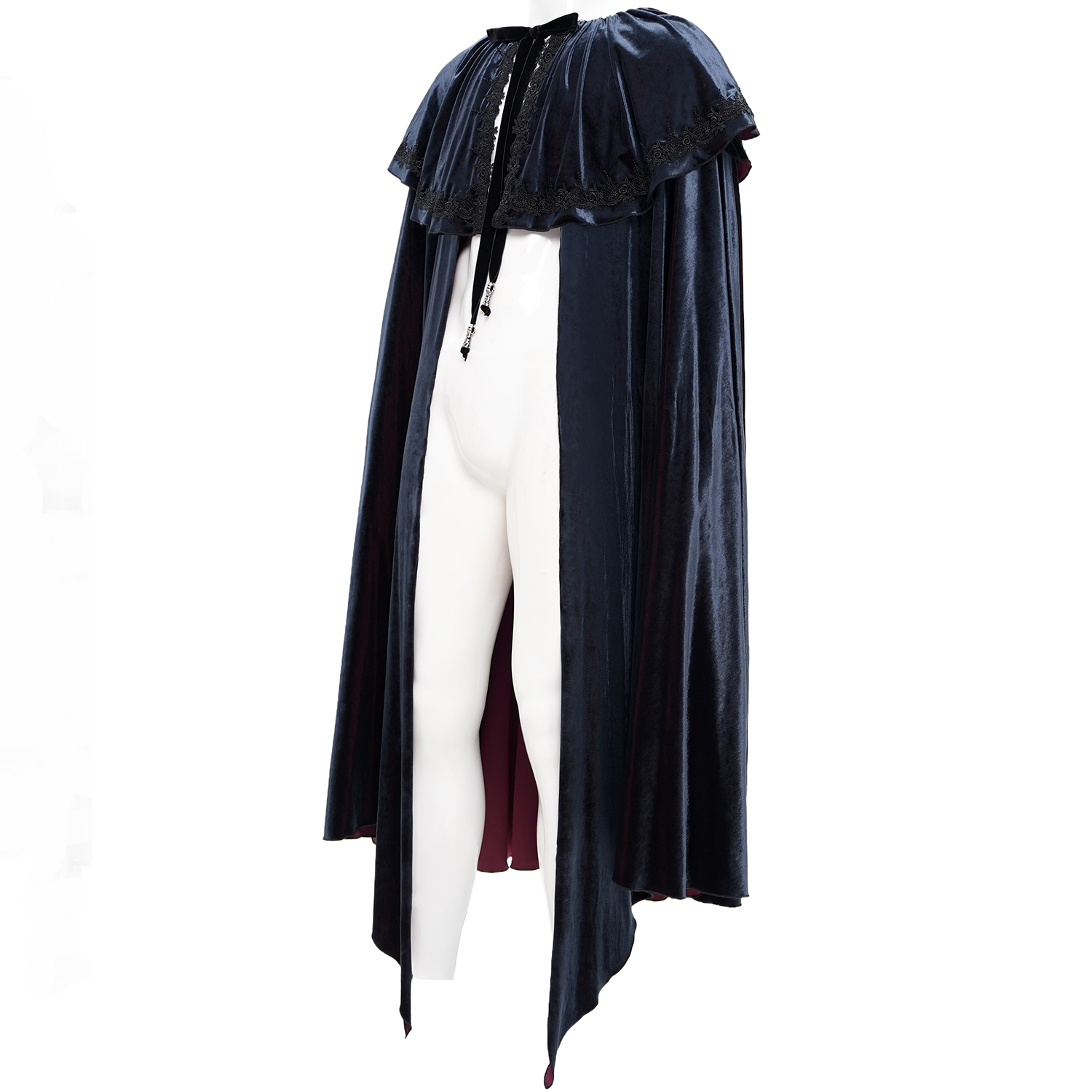 Superb Victorian Gothic Vampiric Men's Vest featuring a long black velvet fitted coat with a cashmere-embossed print and a full-length black leatherette outer cape attached to the shoulders. •...