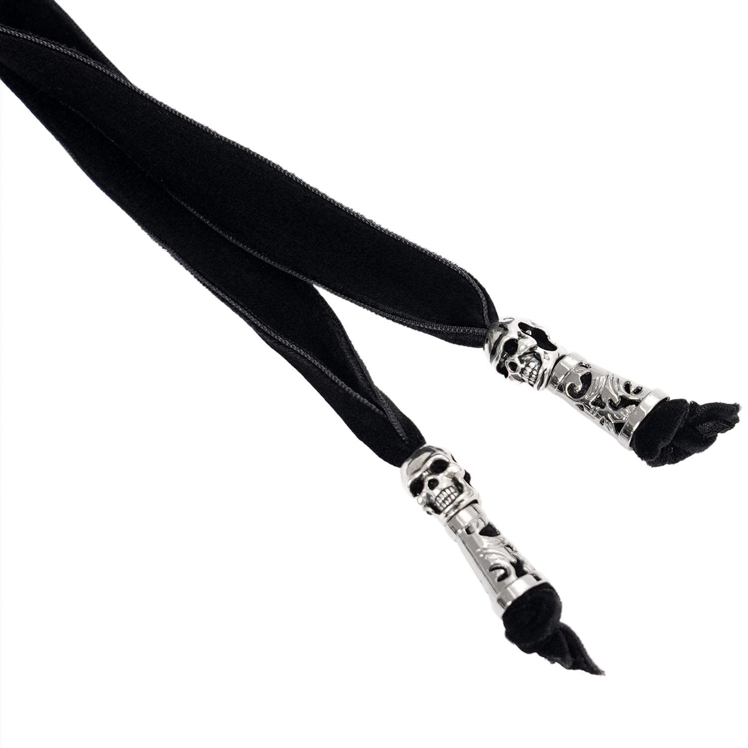 • Velvet ribbon closure, finished with two metal skulls, to tie at the neck