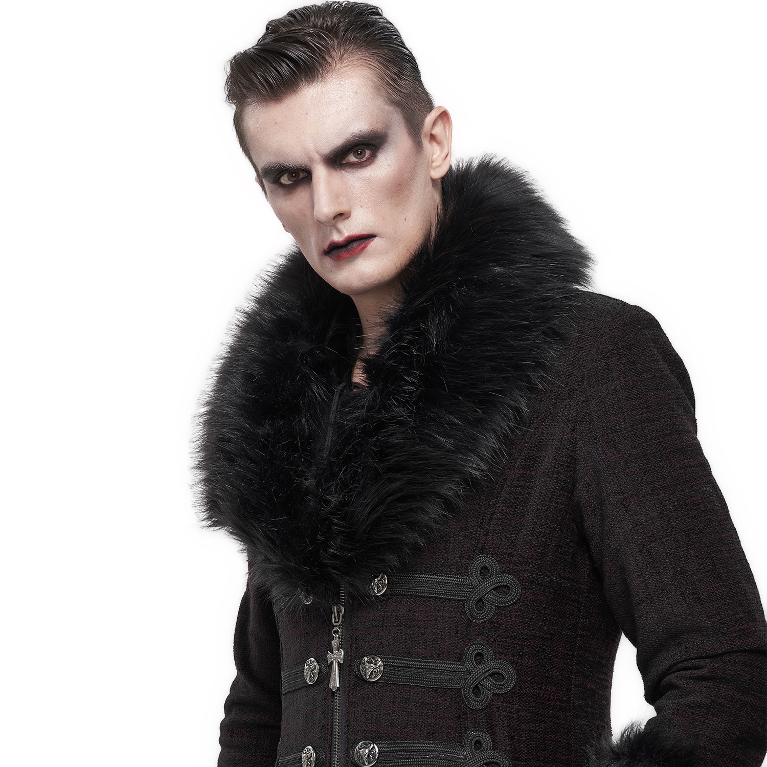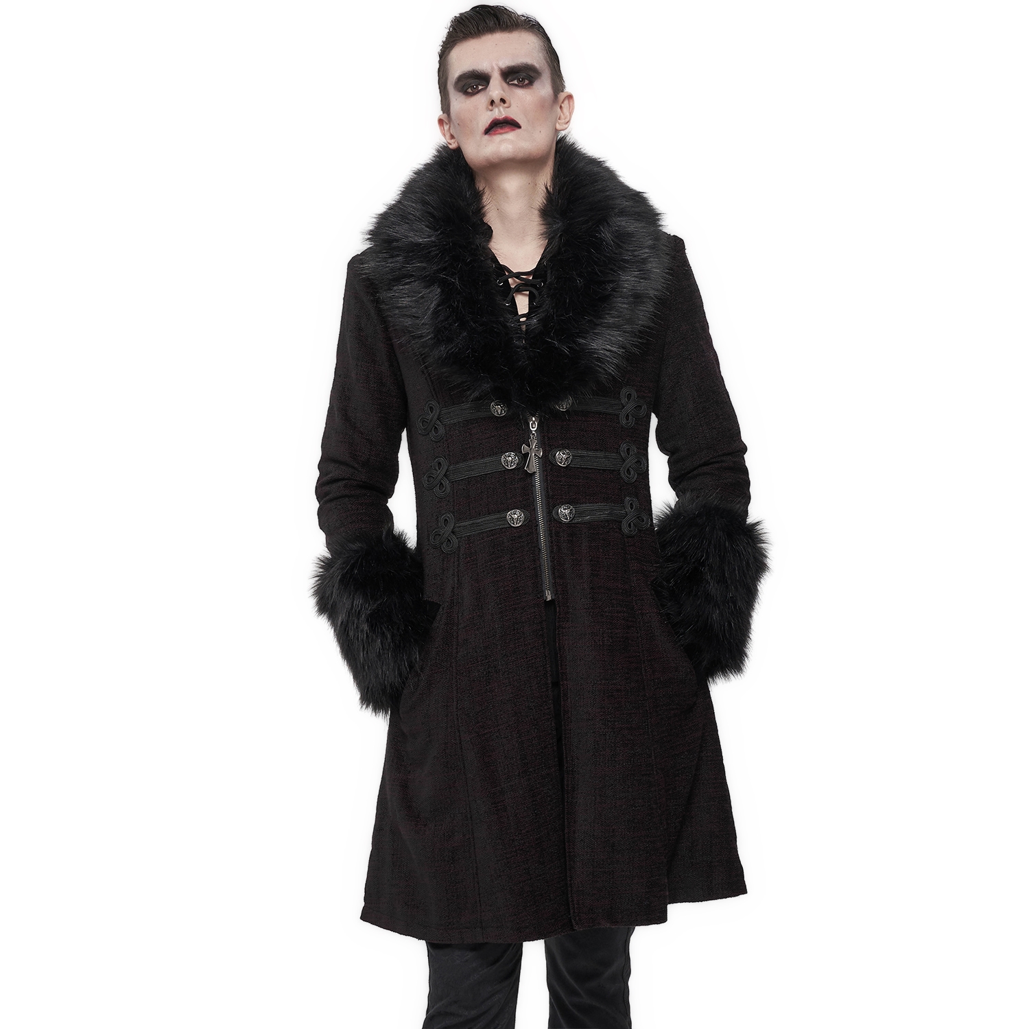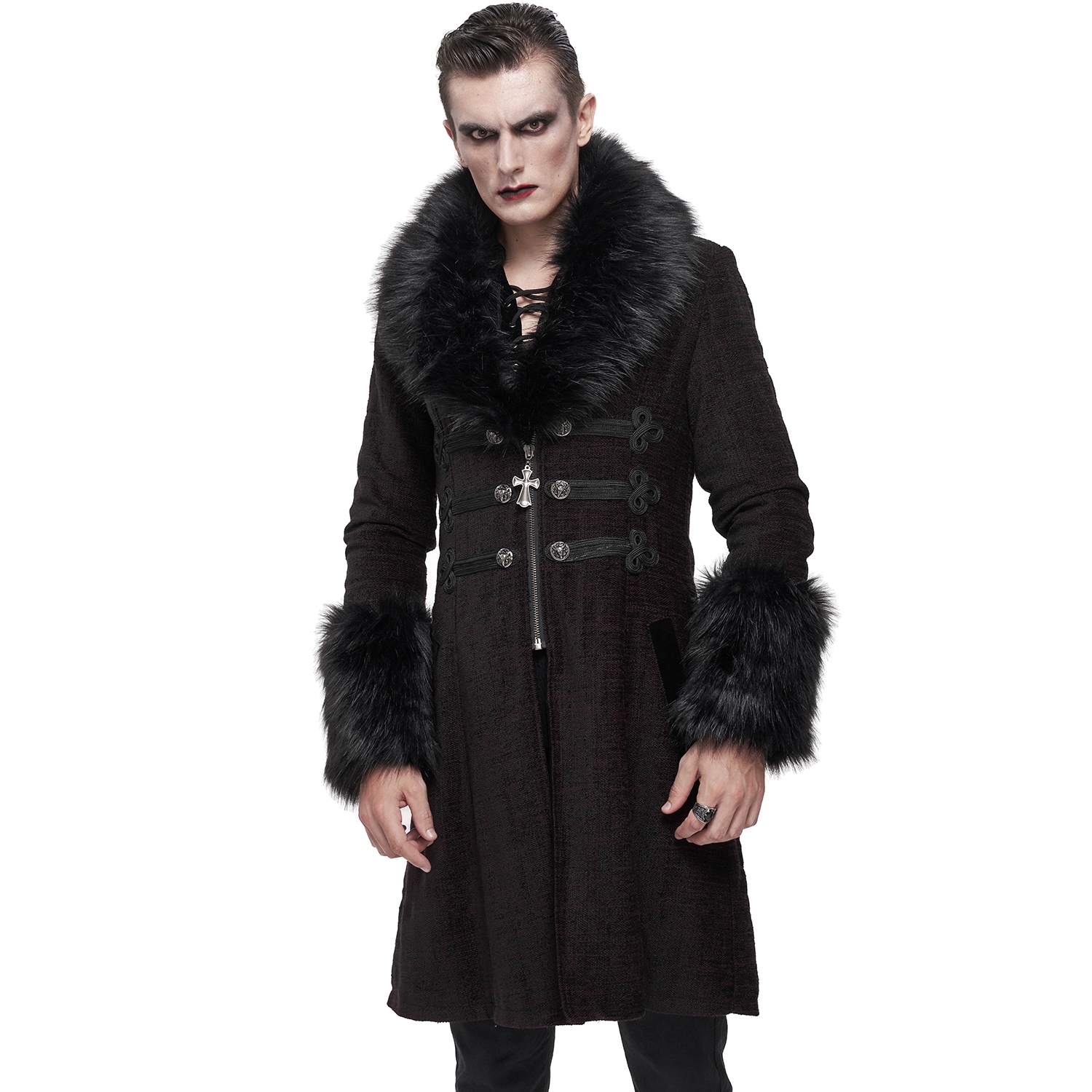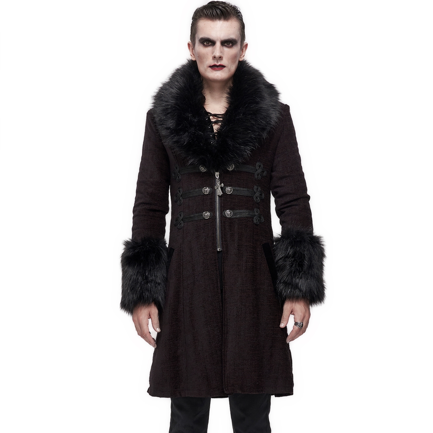 Free size men's Gothic long black cape with oversized hood. • Trimmed with beige-white synthetic fur. • Triple tiered caplet style shoulders. • This full drape coat ties at the neck. • Lining :...