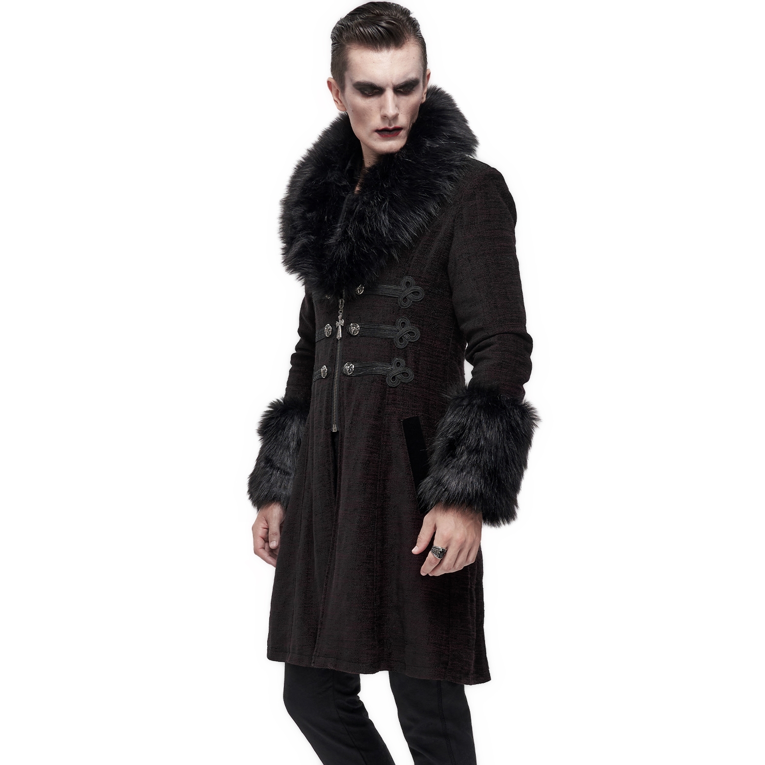 • Embroidered braid on edges of velvet collar, under faux fur