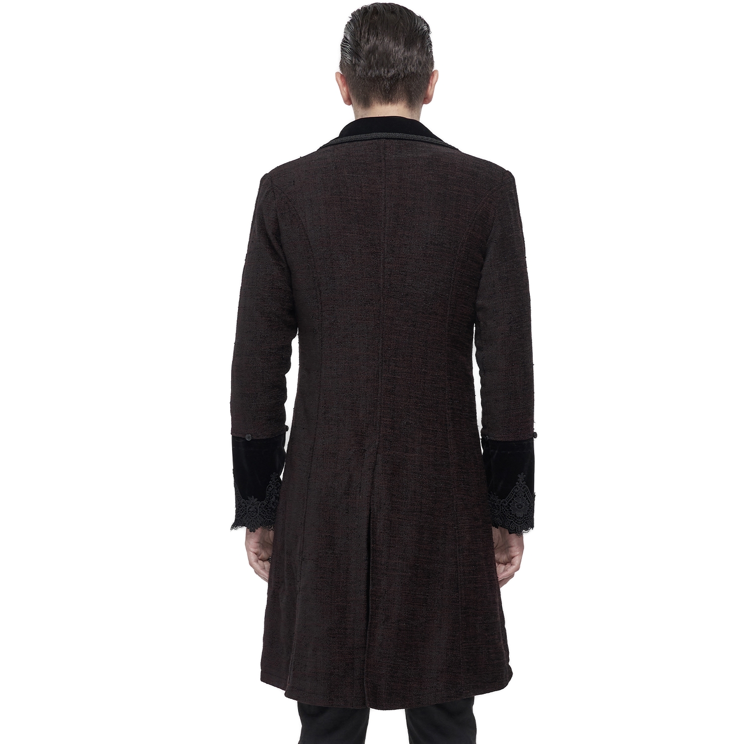 Superb Victorian Gothic Vampiric Men's Vest featuring a long black velvet fitted coat with a cashmere-embossed print and a full-length black leatherette outer cape attached to the shoulders. •...