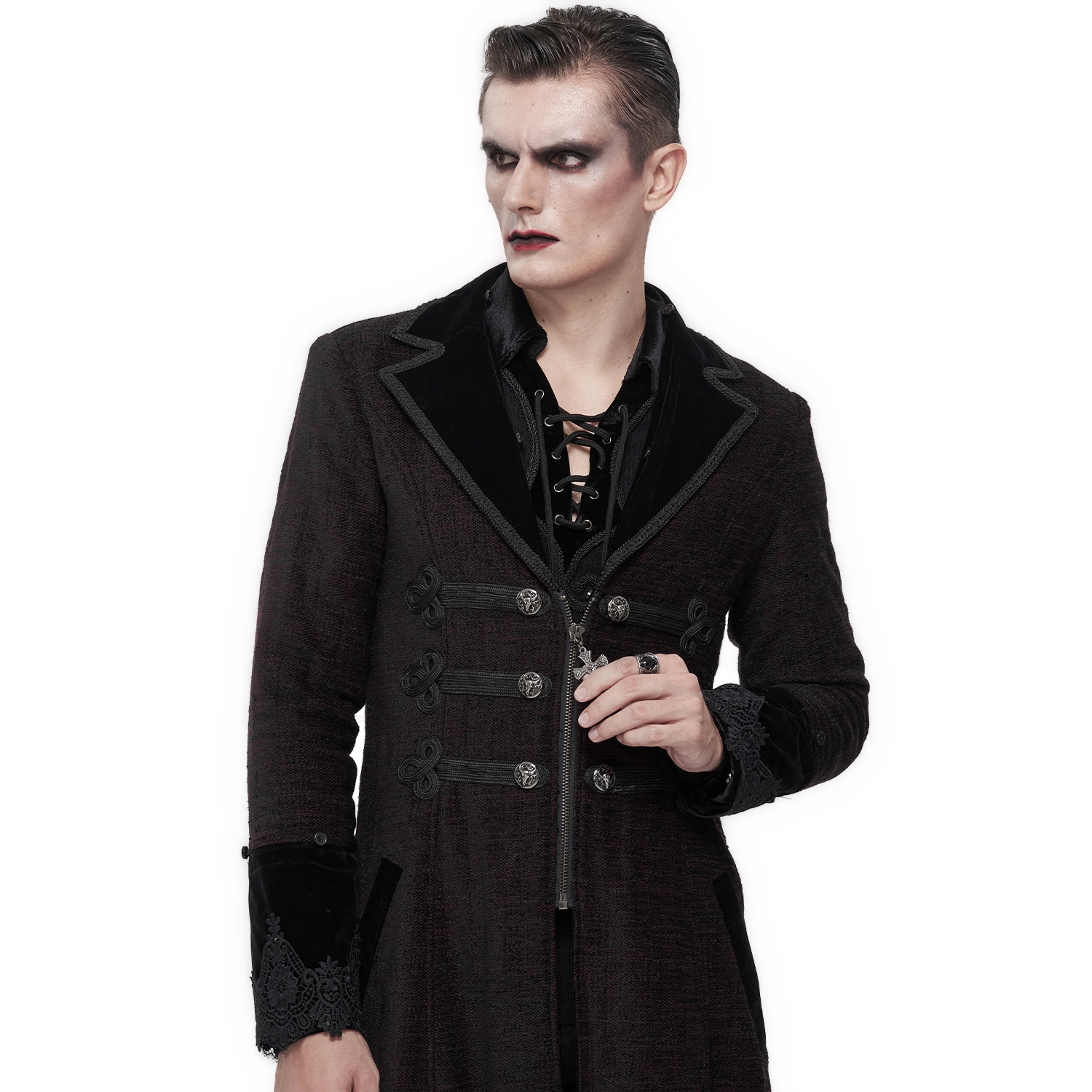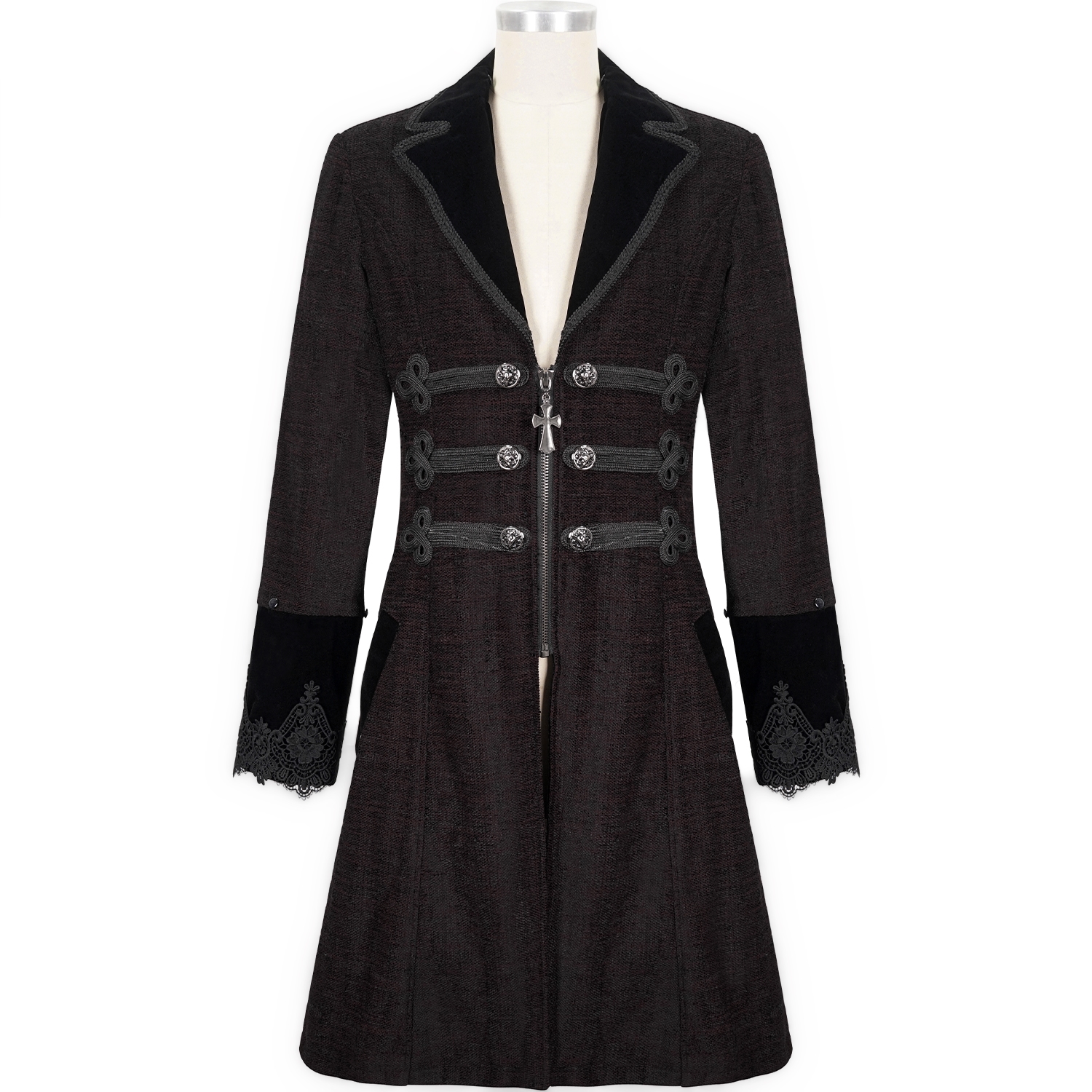 • Double-breasted gothic jacket with asymmetric hem • Neckline edged with floral lace • Embroidery on each side • Hidden pockets • Engraved snaps • 80% Polyester, 18% Rayon, 2% Spandex By...
