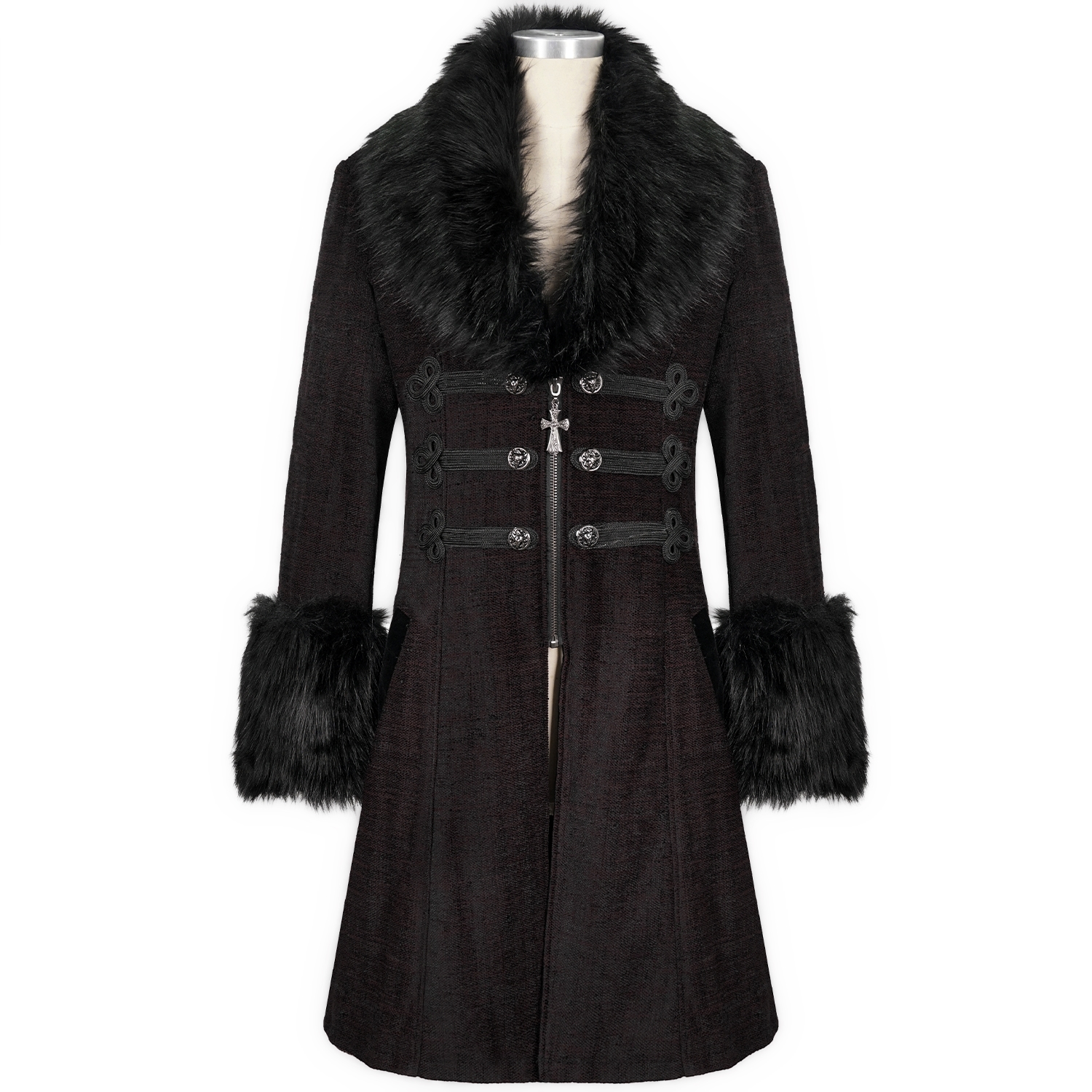 • Two-tone woven fabric • Removable faux fur collar and cuffs • Lace appliqué at center front • Lace appliques on cuffs, under faux fur • Six decorative buttons • Embroidered braid on edges of...